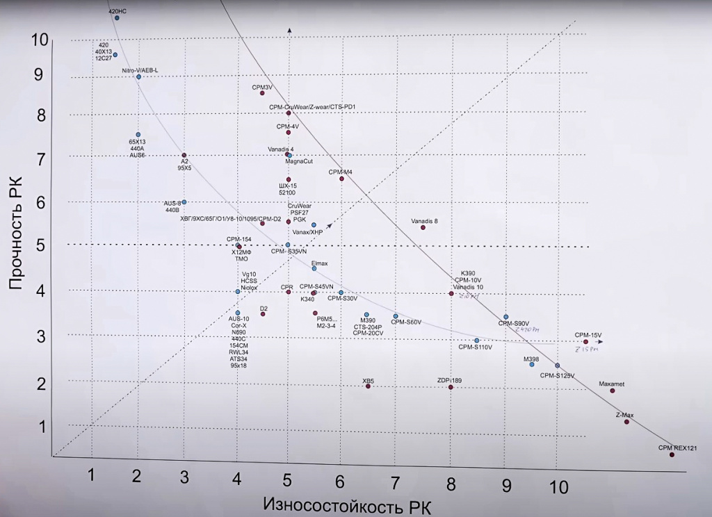Общее представление о группах сталей может дать весьма условная, но, тем не менее, достаточно информативная схема ножевых сталей, созданная Кириллом Бобровским (подробно ознакомиться по ссылке) , уже знаменитым создателем ножей для бушкрафта и очень внимательно изучавшим вопрос характеристик всех мало-мальски популярных в последние десятилетия сталей. В схеме по версии Бобровского марки сталей распределяются по осям «износостойкость РК», что нужно понимать как долгое сохранение остроты ножа, и «прочность РК» - термин, скорее говорящий о высокой ударной вязкости стали и прочности не только режущей кромки, но и клинка в целом. Похожую схему можно представить и для ножей, чей функционал определяется соотношением требуемых качеств - «качество реза» и «прочность клинка». И получается, что, наложив одна на другую две эти схемы, можно понять, какая сталь оптимальна для того или иного функционала.
