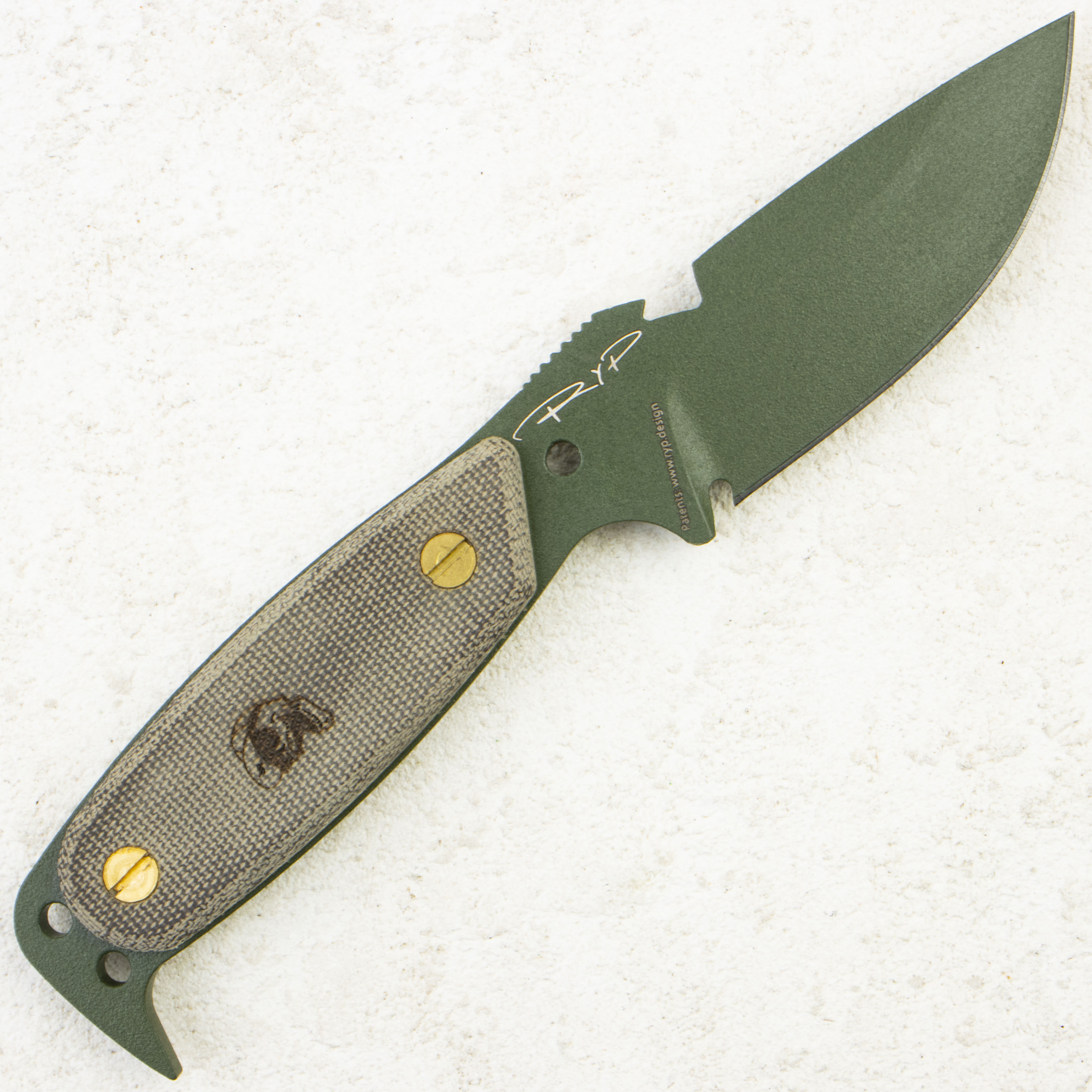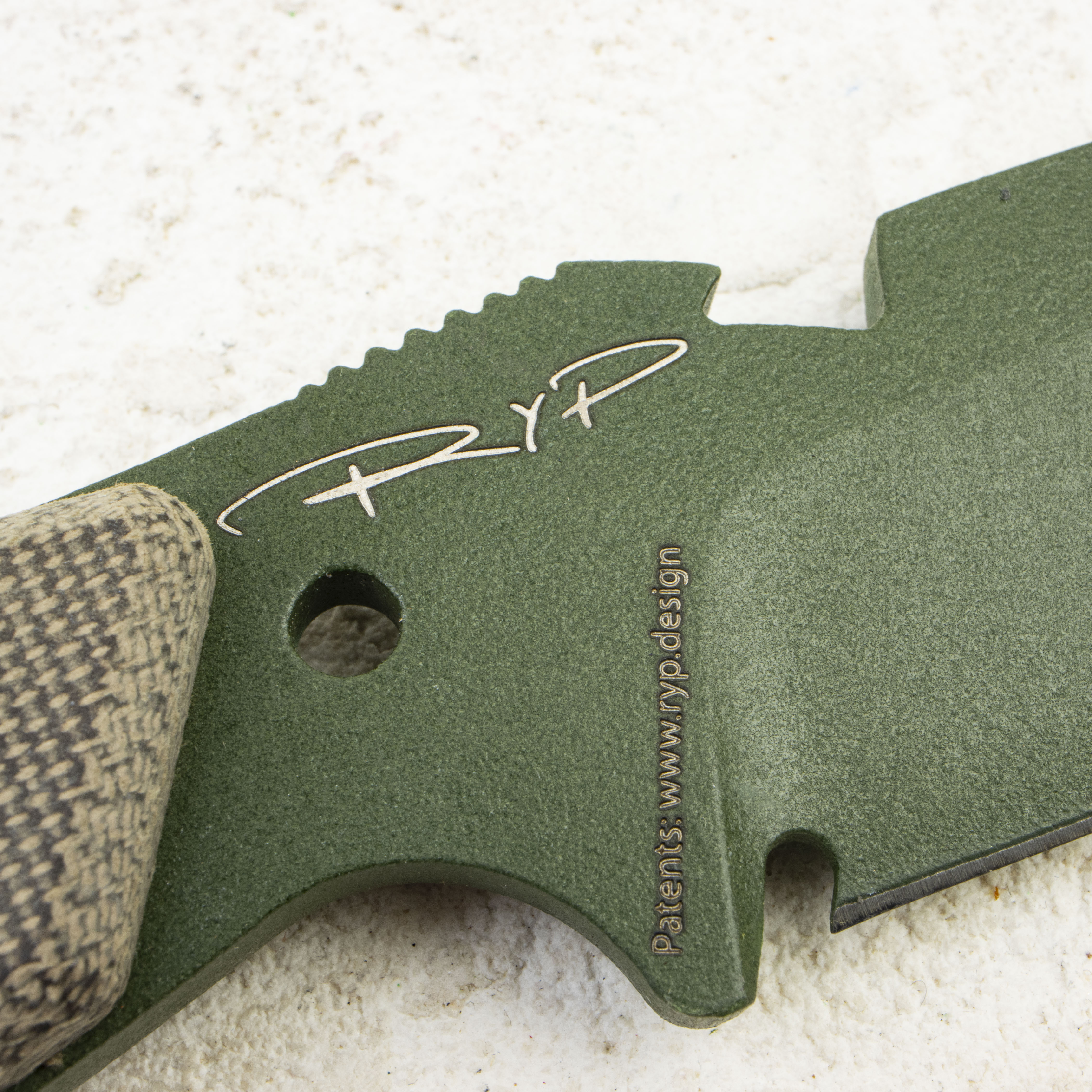 Рукоять изготовлена из Canvas Micarta, которая сочетает прочность и лёгкость с отличным сцеплением даже при влажных руках. Материал устойчив к ударам, влаге и температурным перепадам.