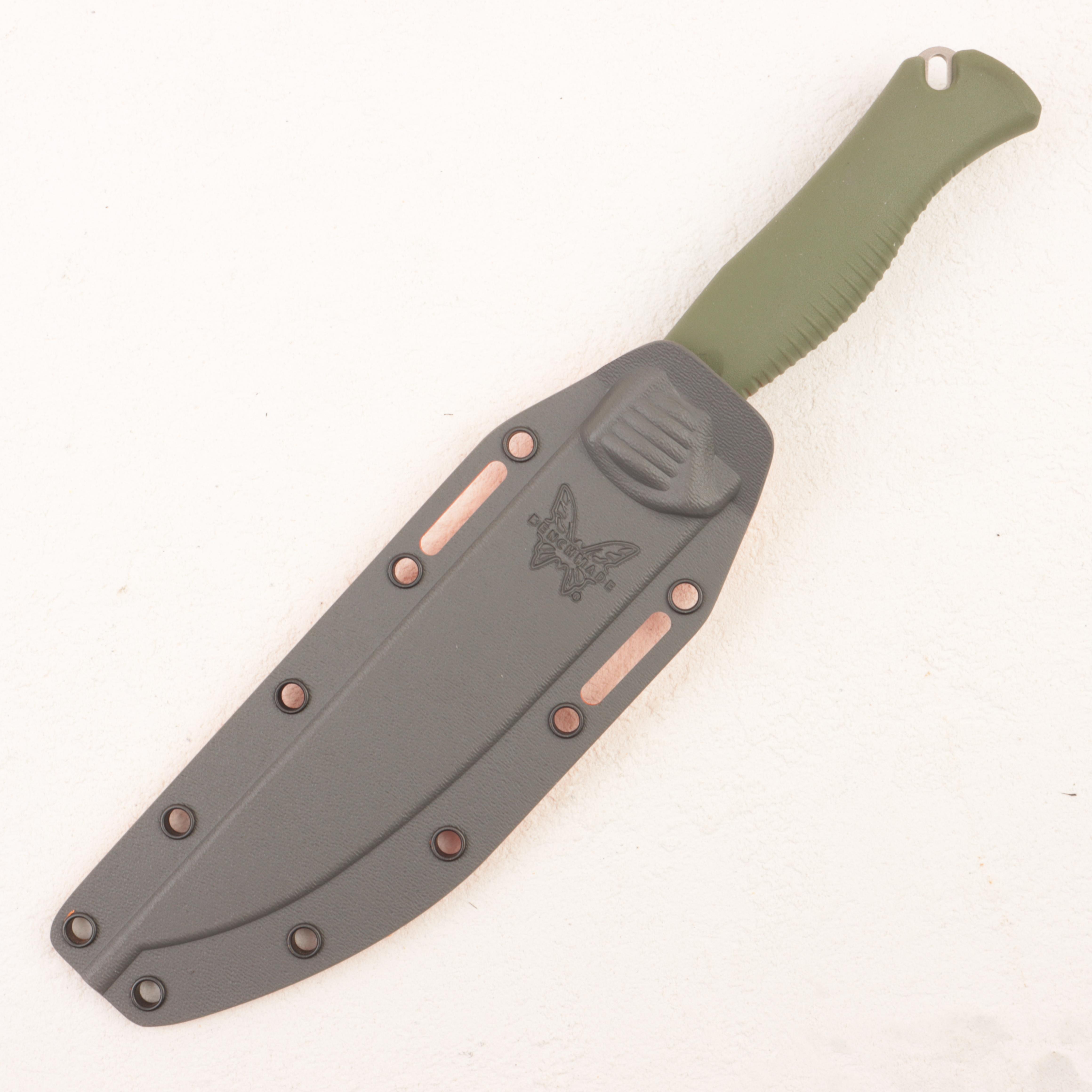 Главная особенность именно этой версии — рукоять из сантопрена цвета тёмная олива. Это не декоративное решение, а очень практичный материал для полевых условий: сантопрен дает цепкий, уверенный хват, особенно когда руки влажные, холодные или испачканы в процессе разделки. По этой же логике Benchmade комплектует нож двухсоставными ножнами из болтарона в оранжево-сером исполнении: оранжевая сторона лучше заметна, а серая дает более спокойный и менее заметный вариант ношения. Этот нюанс особенно хорошо подчеркивает полевую направленность модели — нож рассчитан не на витринный эффект, а на реальную работу в охотничьей обстановке.