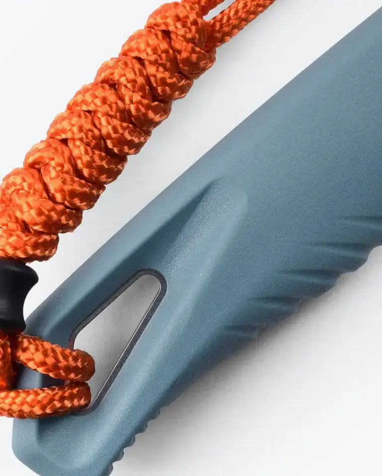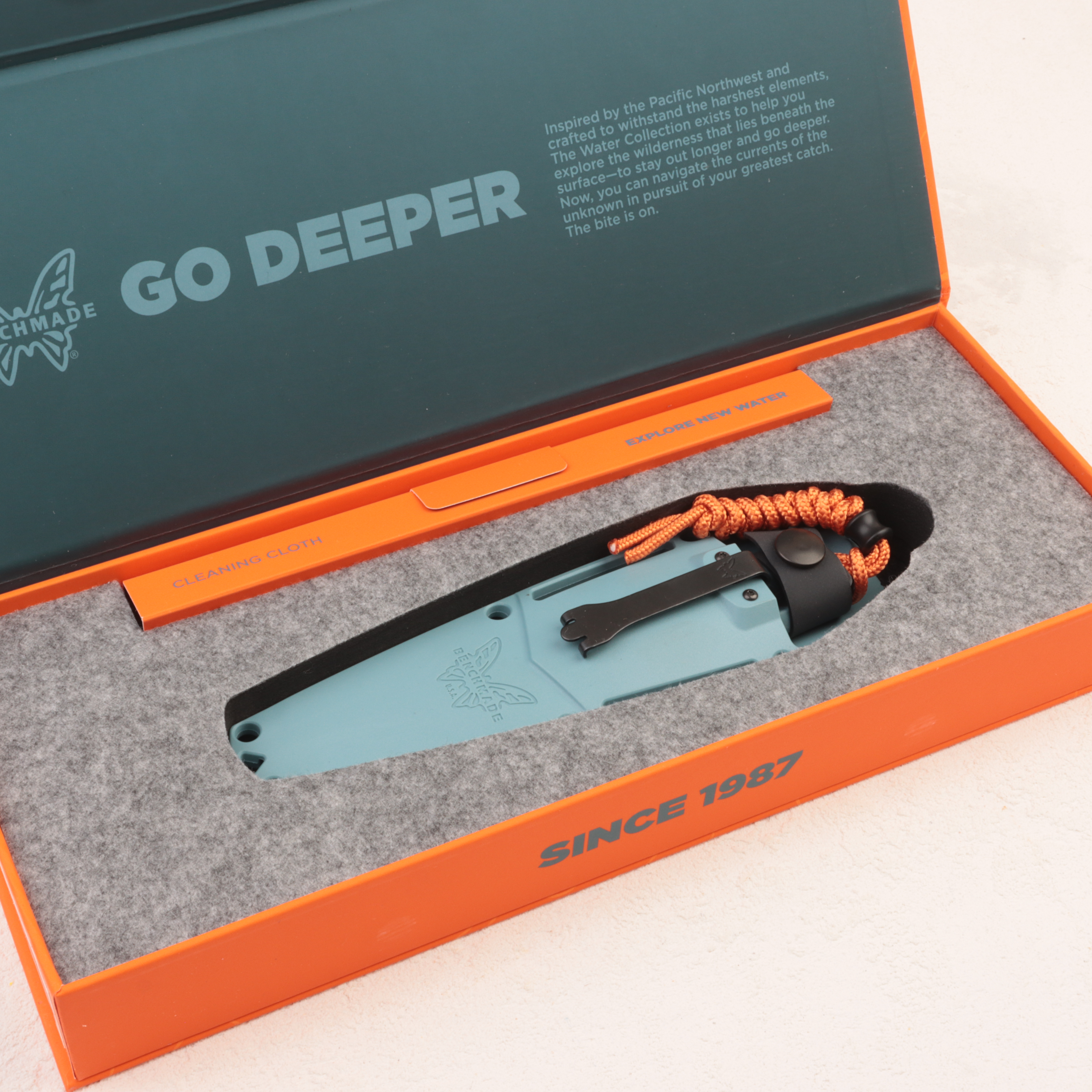 Главная особенность именно версии 18050 — рукоять из сантопрена синего цвета, который Benchmade называет Depth Blue, и синие пластиковые ножны в комплекте. Сантопрен здесь выбран не ради внешнего вида, а ради цепкого и предсказуемого хвата во влажной среде: такой материал особенно удобен, когда руки мокрые, в перчатках или в слизи от рыбы. В описаниях Benchmade и продавцов отдельно отмечаются насечки на рукояти и на обухе, которые улучшают контроль при точной работе и при щипковом хвате. Ножны у модели полимерные, рассчитанные на быстрый доступ и ношение в полевых условиях.