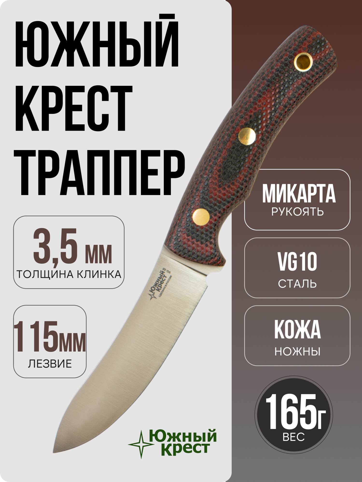 Нож Южный Крест Траппер — это надёжный туристический нож с фиксированным клинком, созданный для задач на природе, охоте и в походах. Он сочетает в себе проверенную геометрию, качественные материалы и удобную эргономику, что делает его отличным универсальным помощником.