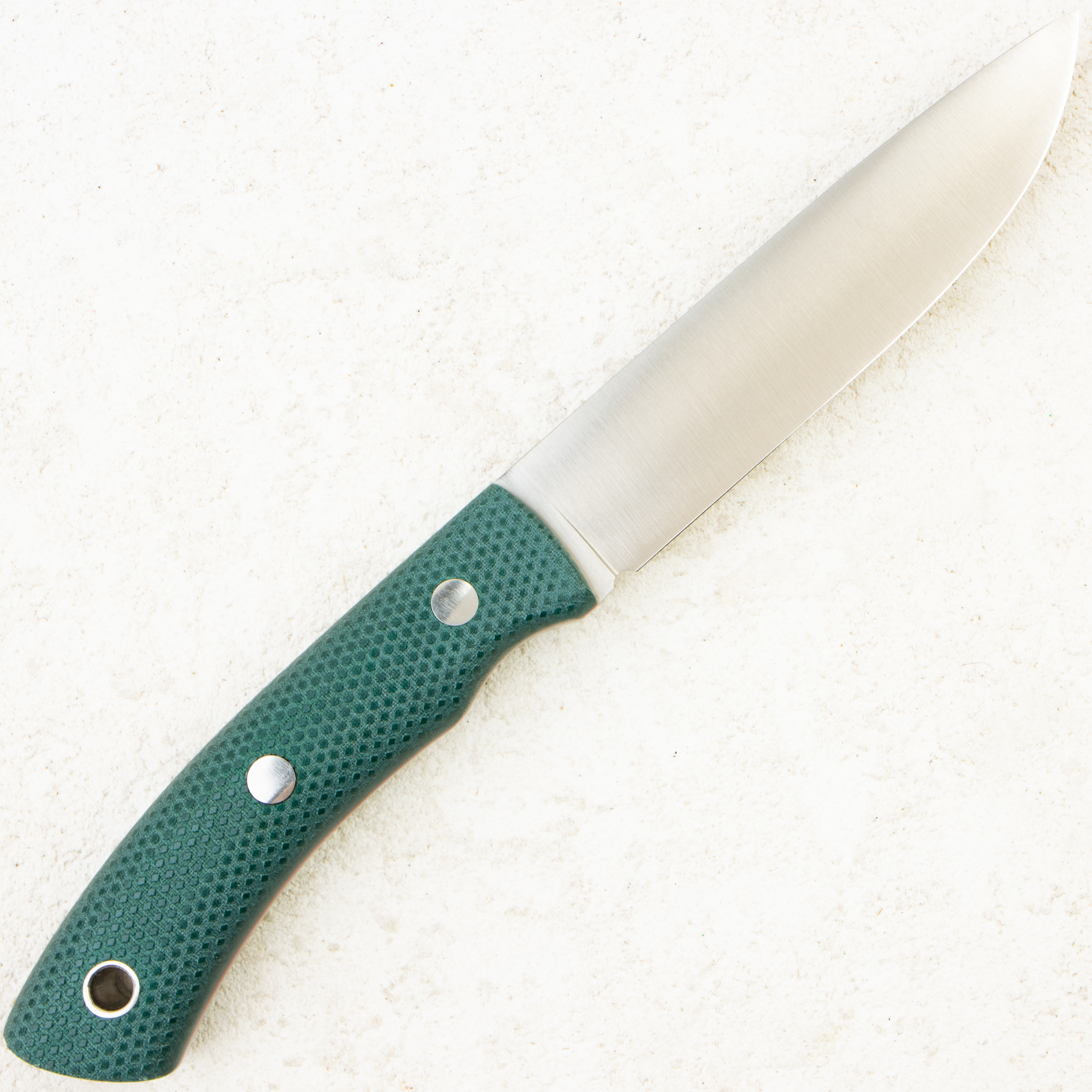 Клинок длиной 132 мм изготовлен из японской стали VG-10, которая славится своей износостойкостью и устойчивостью к коррозии. Эта сталь сохраняет заточку на длительное время, что особенно важно в полевых условиях. Клинок имеет вогнутую линзовидную заточку (convex), обеспечивающую исключительные режущие свойства и простоту ухода. Толщина обуха 3,4 мм делает клинок прочным и надёжным при работе с твёрдыми материалами, такими как дерево или плотные ткани. Благодаря такой геометрии, нож легко справляется с разделкой, строганием и другими сложными задачами.