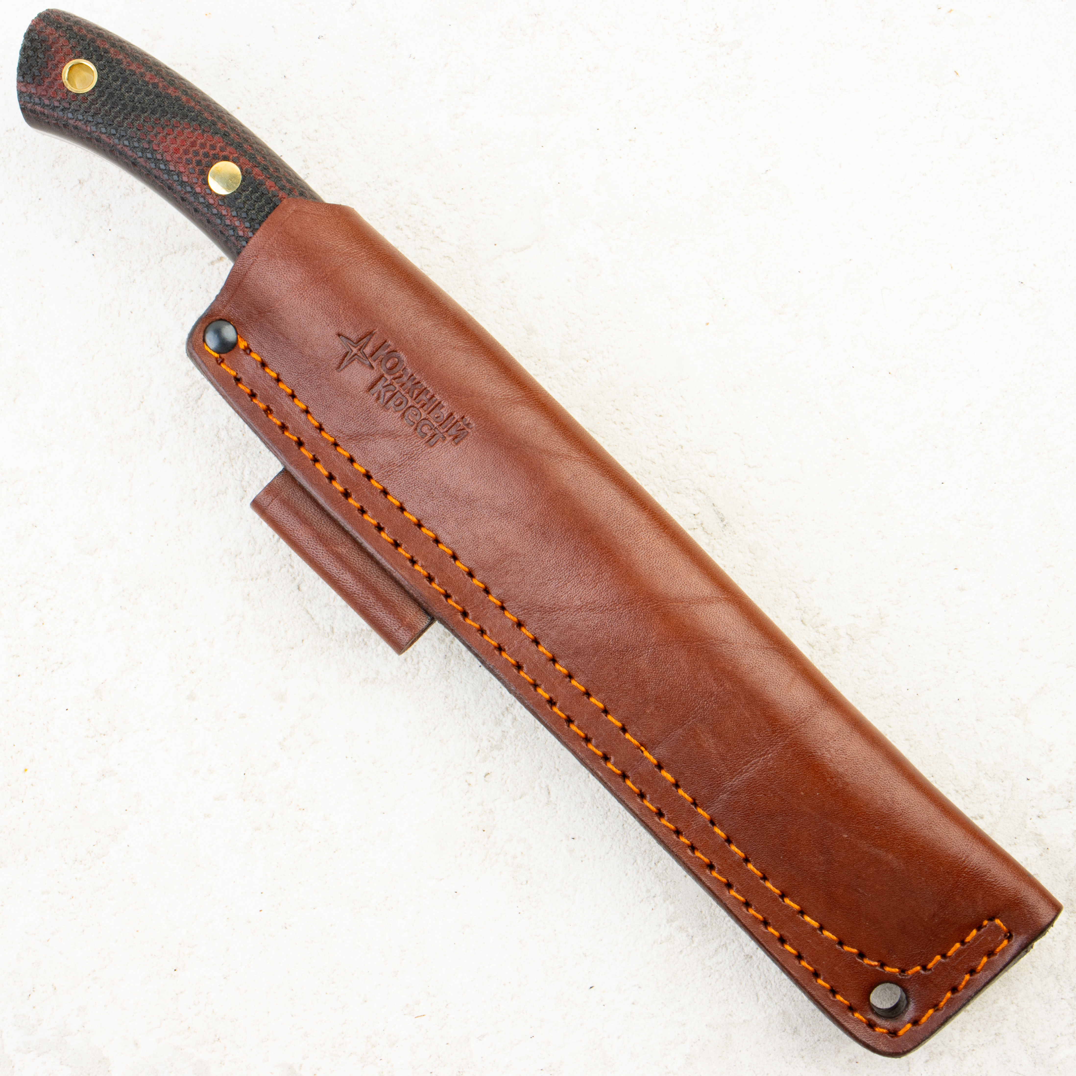 Для удобного и безопасного хранения нож комплектуется прочными кожаными ножнами с петлёй для ношения на ремне. Ножны выполнены из натуральной кожи, что обеспечивает долговечность и надёжную защиту клинка. Благодаря компактным размерам и продуманному дизайну, нож удобно носить на поясе или закрепить на снаряжении.