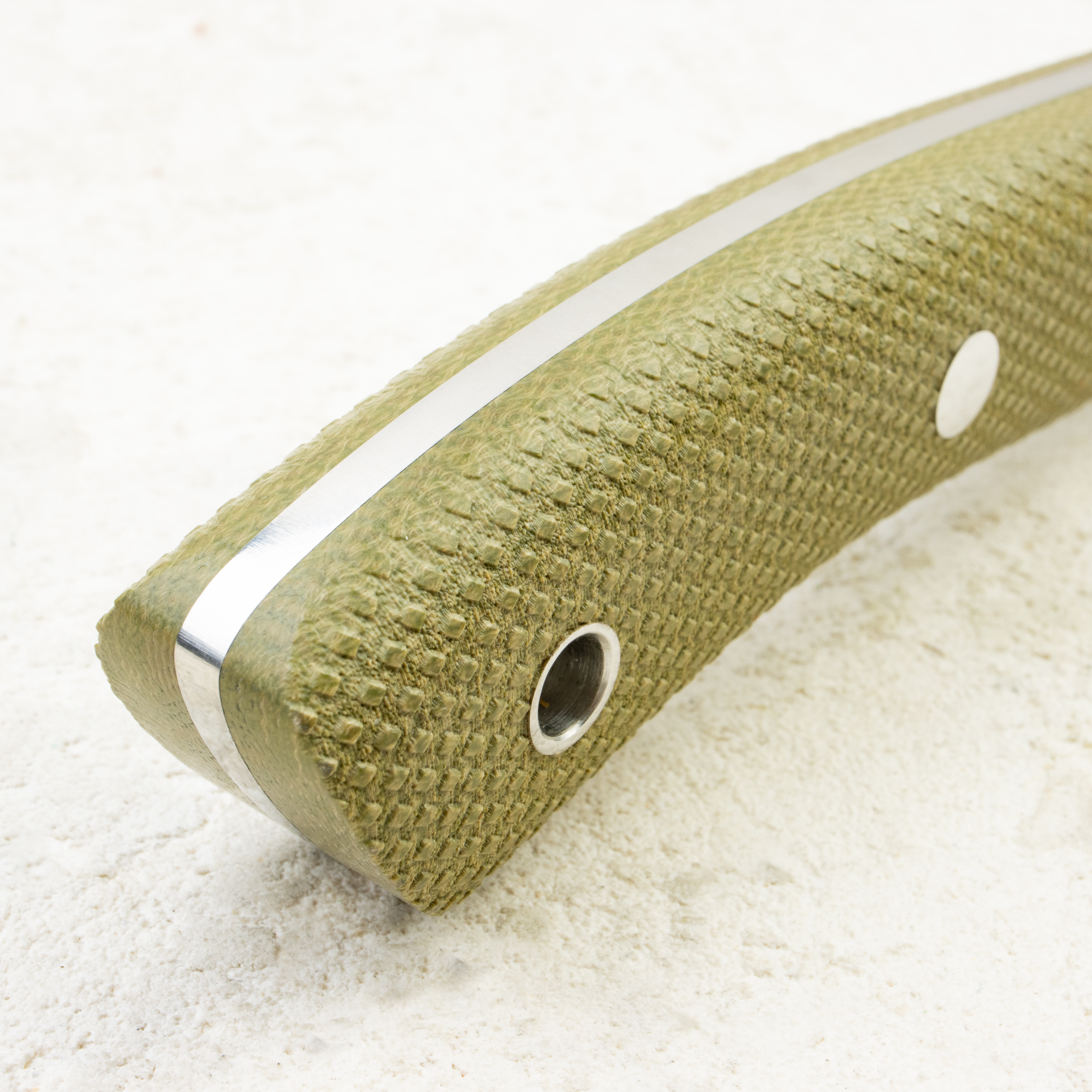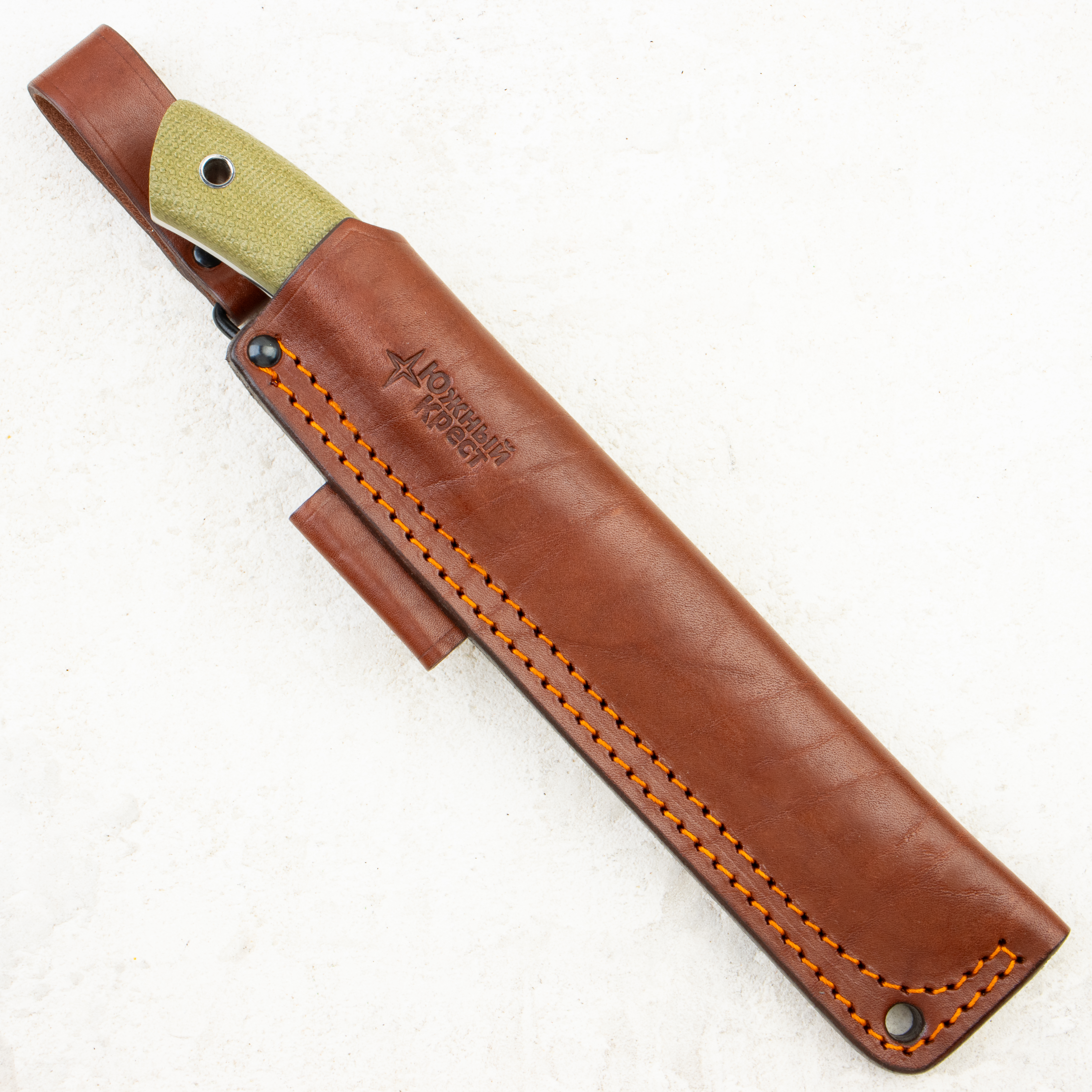 Рукоять изготовлена из микарты и имеет длину 121 мм при толщине 23 мм, что обеспечивает уверенный и комфортный хват. Материал рукояти устойчив к влаге, перепадам температур и механическому износу. Конструкция ножа рассчитана на длительное использование в полевых условиях.