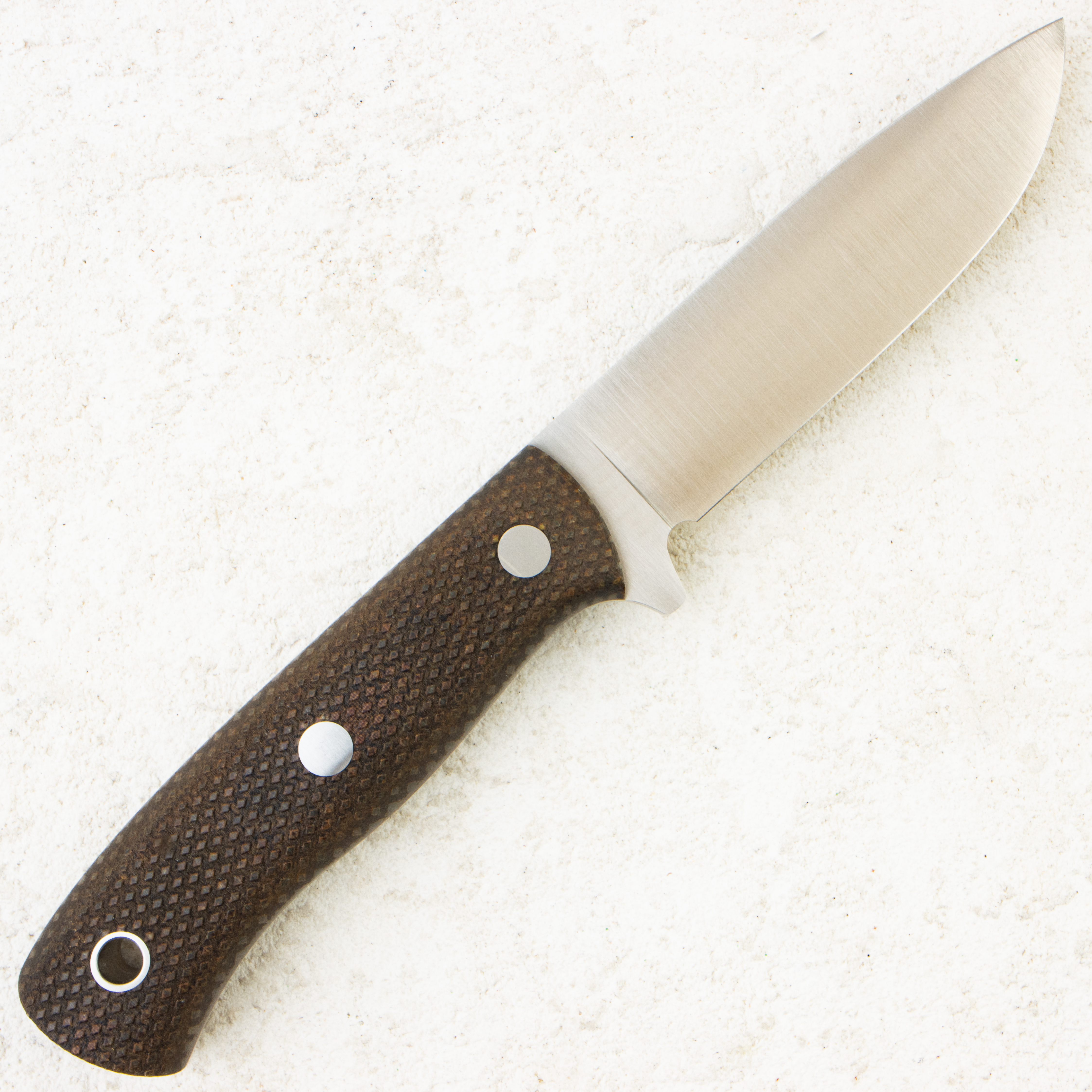 Рукоять изготовлена из микарты с насечкой, имеет длину 110 мм и толщину 22,7 мм, что обеспечивает надежный и контролируемый хват даже при работе влажной рукой. Материал рукояти устойчив к влаге, перепадам температур и износу, подходит для эксплуатации в различных погодных условиях.