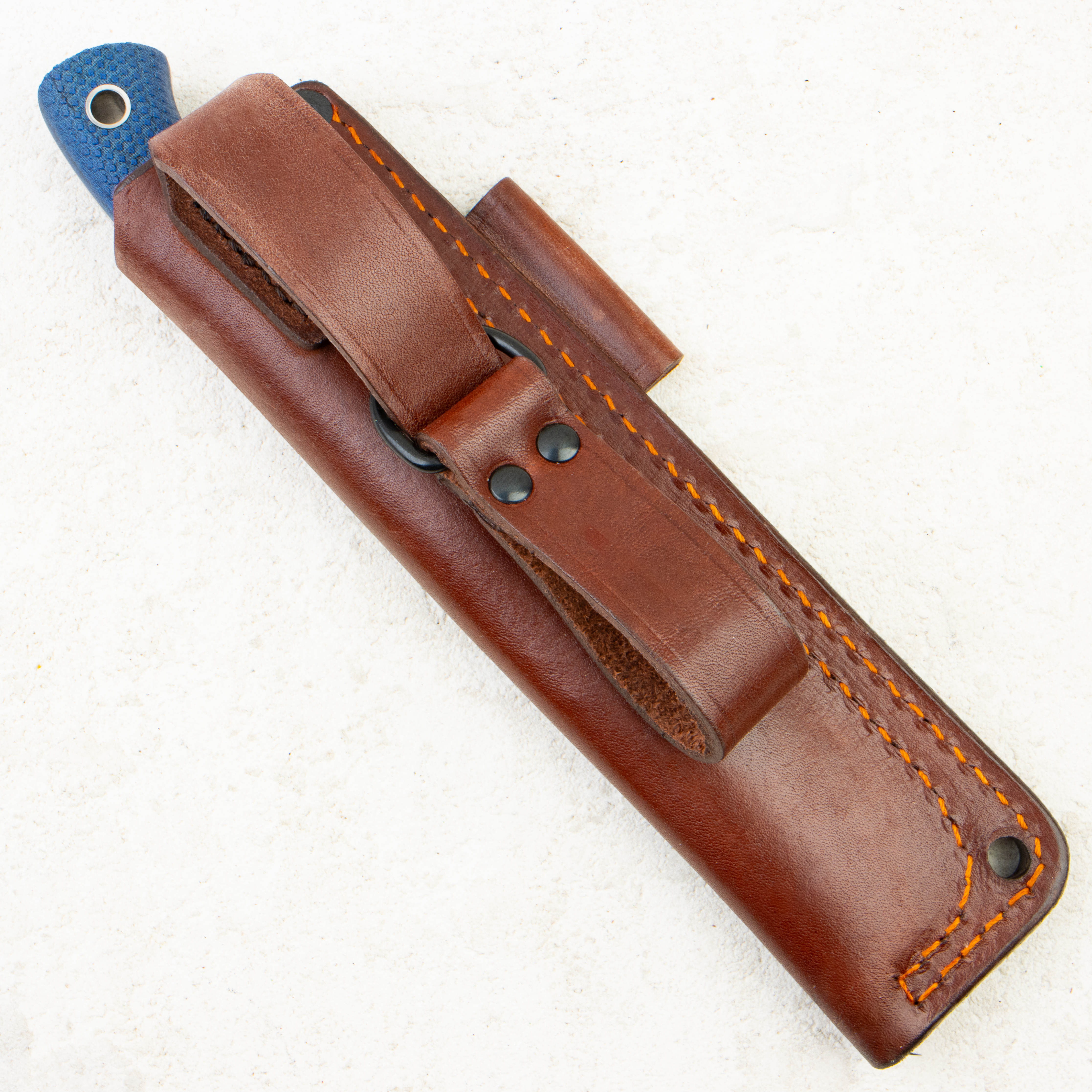 Рукоять изготовлена из микарты синего цвета, оснащена насечкой и имеет длину 115 мм при толщине 21,5 мм, что обеспечивает надежный и контролируемый хват даже при работе влажной рукой. Конструкция ножа выполнена по схеме Full Tang, при которой хвостовик проходит по всей длине рукояти, обеспечивая надежность и долговечность изделия.