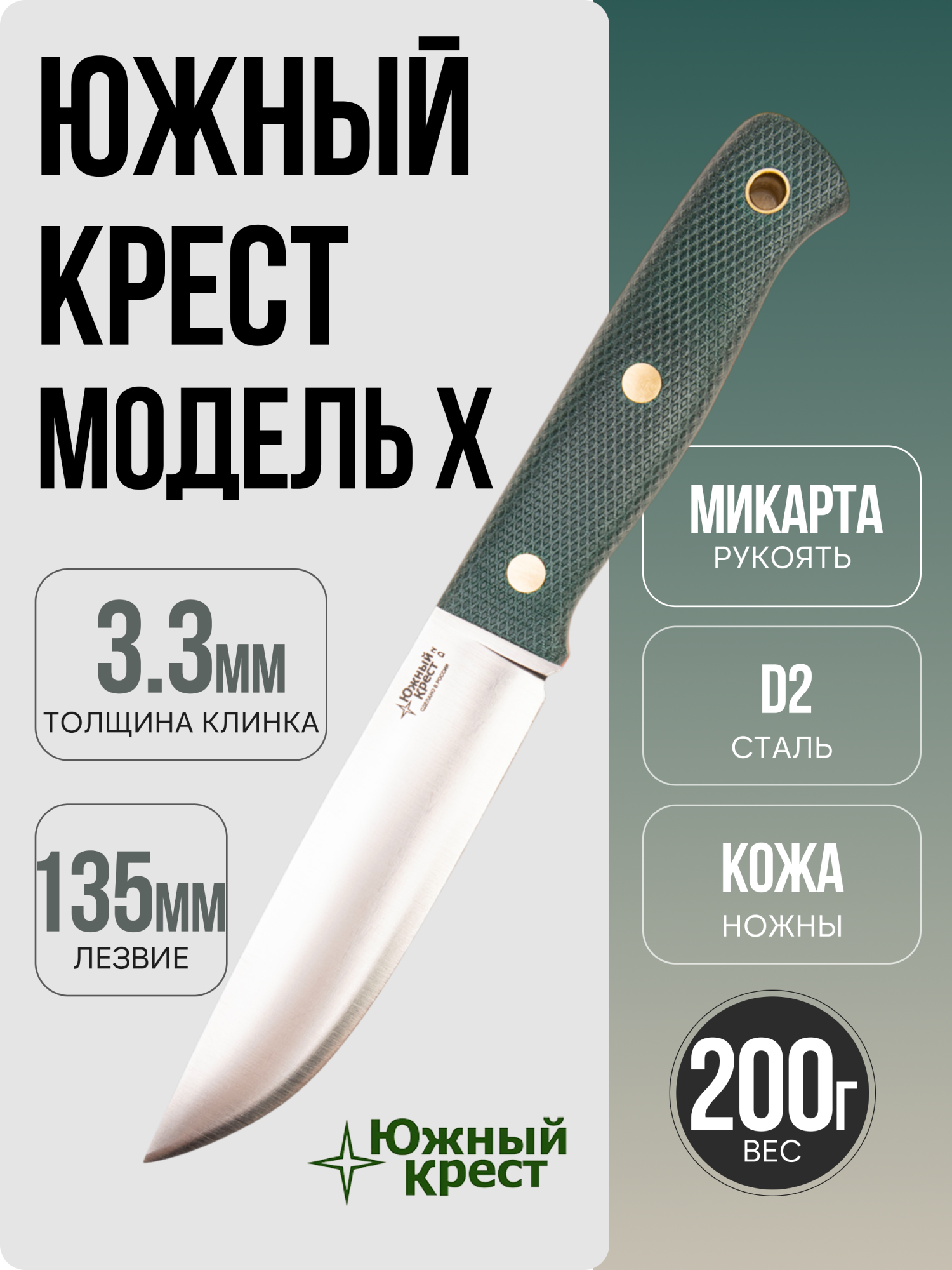 Нож фултанг Южный крест Модель X. В данной модели Клинок изготовлен из прочной, хорошо сохраняющей остроту и легко затачиваемой стали D2, сведение - конвекс (выпуклая линза), а рукоять из микарты (В данной модели красного цвета). Поставляется с ножнами из натуральной кожи коричневого цвета с держателем под точильный стержень или мусат.