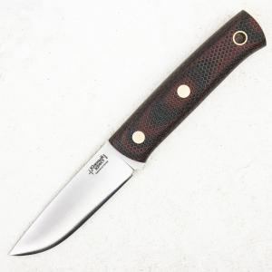 Клинок изготовлен из прочной, хорошо сохраняющей остроту и имеющей великолепные режущие свойства стали N690, сведение - конвекс (выпуклая линза), а рукоять из микарты (В данной модели красно-черного цвета). Поставляется с ножнами из натуральной кожи коричневого цвета с держателем под точильный стержень или мусат.