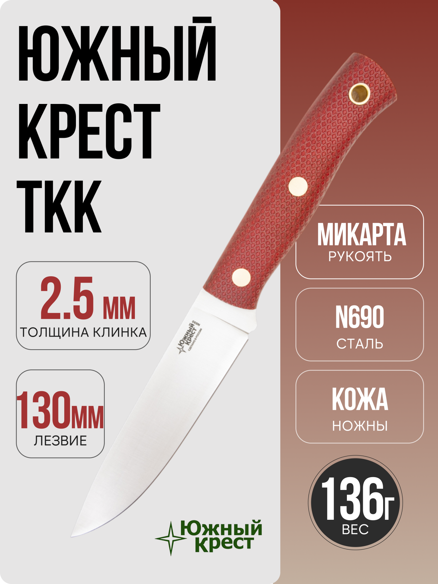 Нож Южный Крест ТКК. Клинок изготовлен из прочной, хорошо сохраняющей остроту и имеющей великолепные режущие свойства стали N690, сведение - прямые спуски, а рукоять из микарты (В данном экземпляре красного цвета). Поставляется с ножнами из натуральной кожи черного цвета.