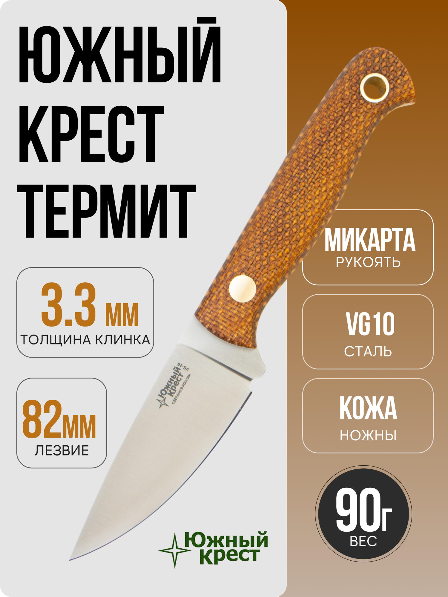 Нож "Южный Крест Термит" — это прекрасный выбор для любителей ножей, которые ищут надежный и прочный инструмент для походов, кемпинга или для выполнения повседневных задач.