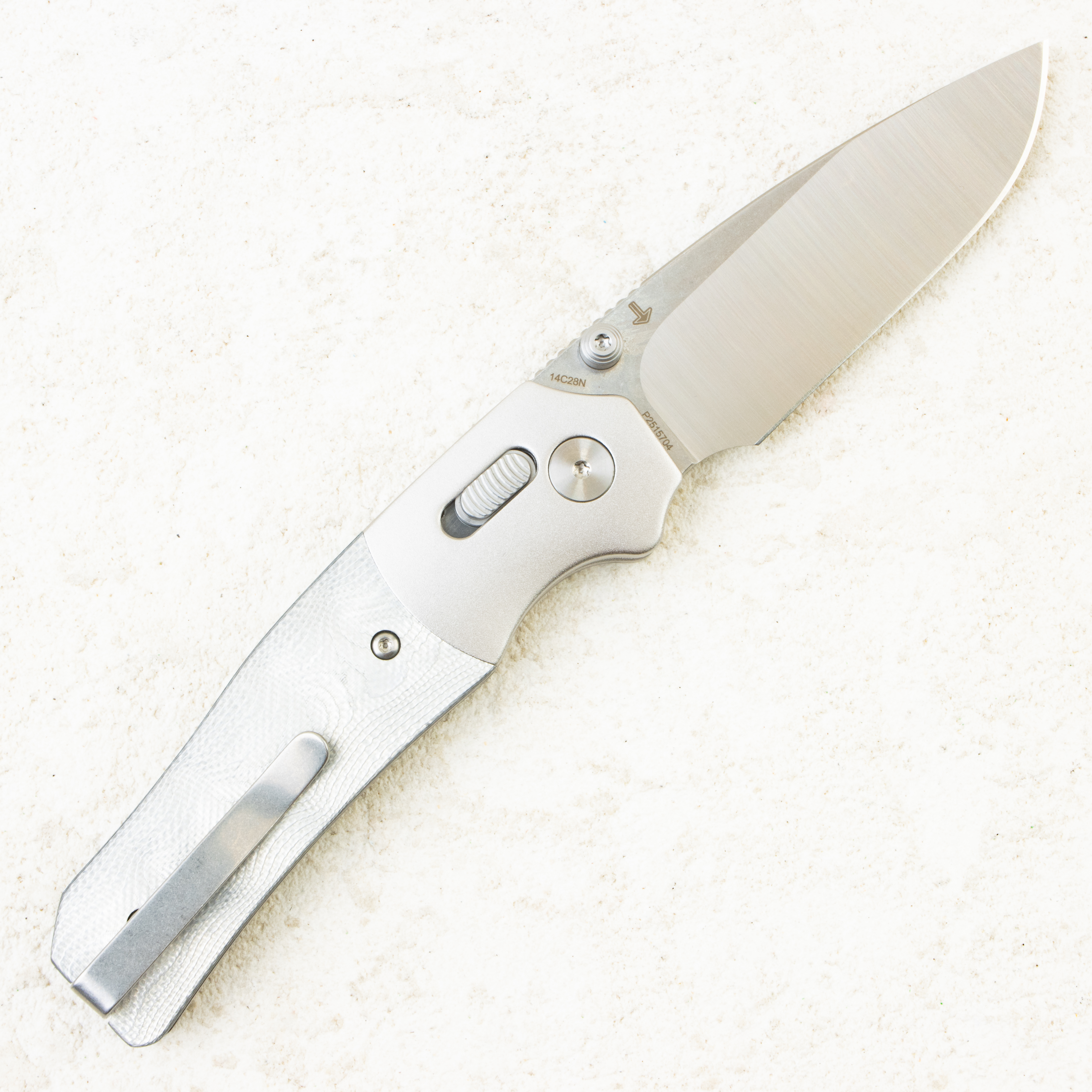 Рукоять ножа представляет собой сочетание серебристого алюминиевого больстера и накладок из микарты. Такое сочетание материалов обеспечивает лёгкость конструкции, высокую прочность и эстетическую привлекательность. Эргономичная форма рукояти обеспечивает комфортный и надёжный хват, а текстурированная поверхность микарты предотвращает скольжение даже в сырых или влажных условиях.