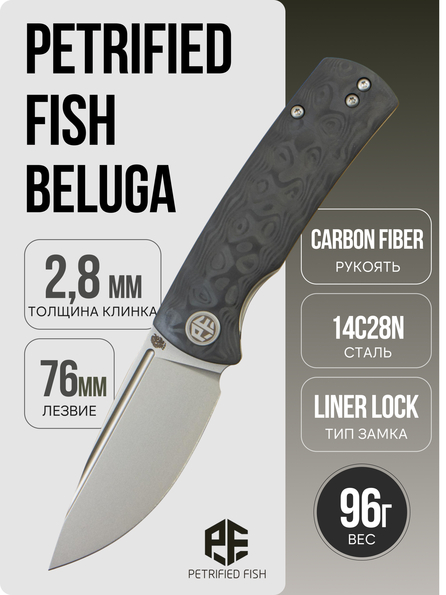 Нож Petrified Fish Beluga, PFP01XCP — это складной нож с надежным замком и продуманным дизайном, подходящий для повседневного ношения и коллекционирования. Модель разработана с акцентом на комфортный хват и удобство открывания клинка.