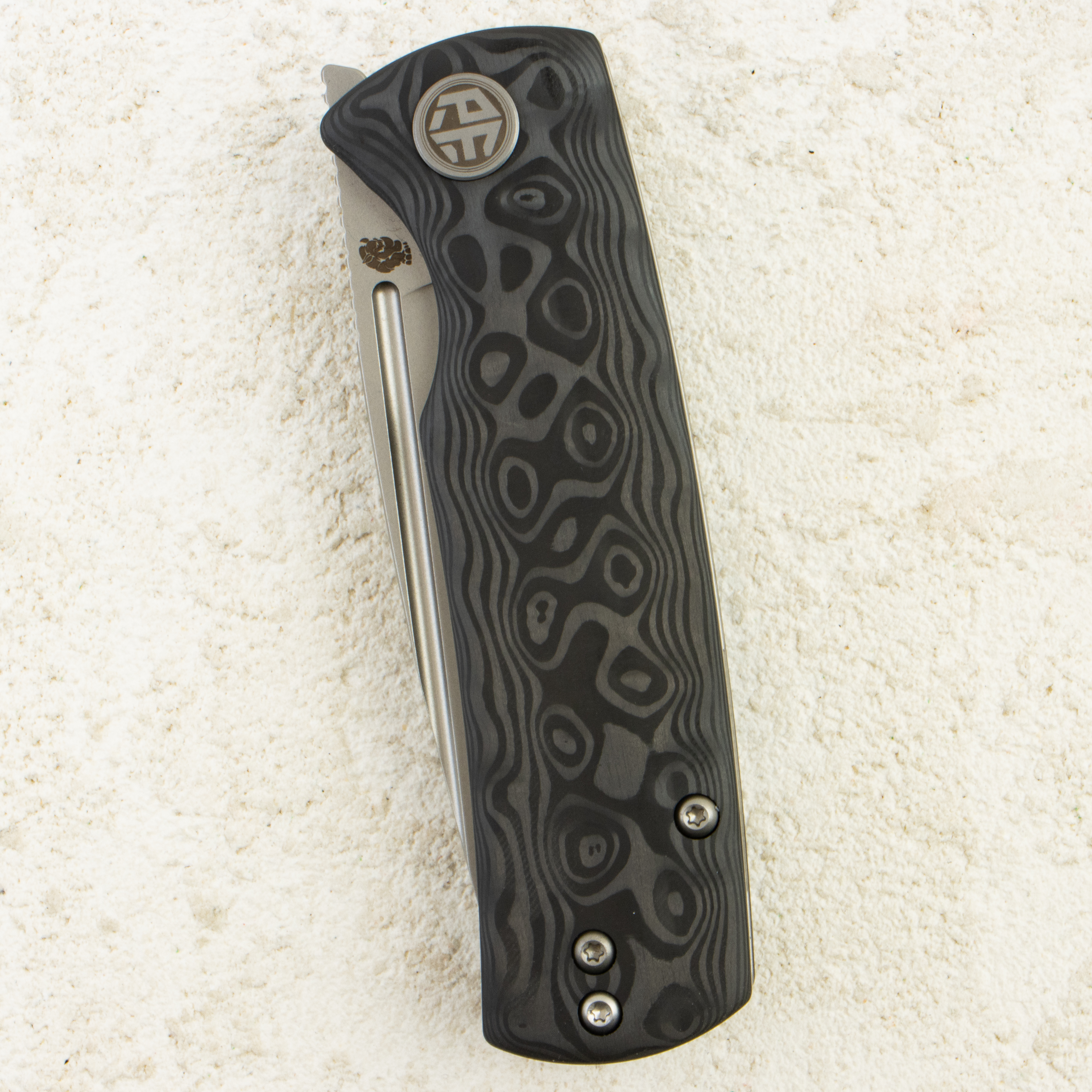 Рукоять выполнена из Carbon Fiber, легкая и прочная, обеспечивая надежное удержание ножа в руках. Общая длина ножа составляет 176 мм, а вес — 95 г, что делает его удобным для повседневного ношения.