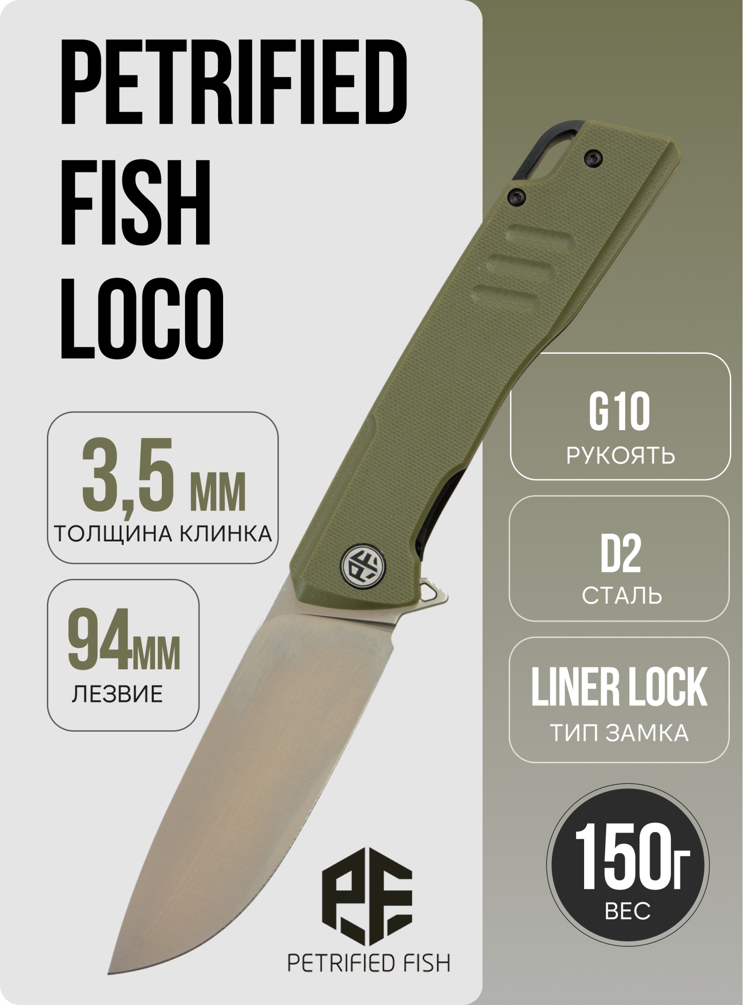 Нож Petrified Fish Loco представлен в шести версиях, отличающихся отделкой клинка и цветом рукояти. Клинок выполнен из высокоуглеродистой стали D2, доступен в вариантах сатин и stonewash, что позволяет выбрать между более классическим внешним видом или стойкой к царапинам текстурой.