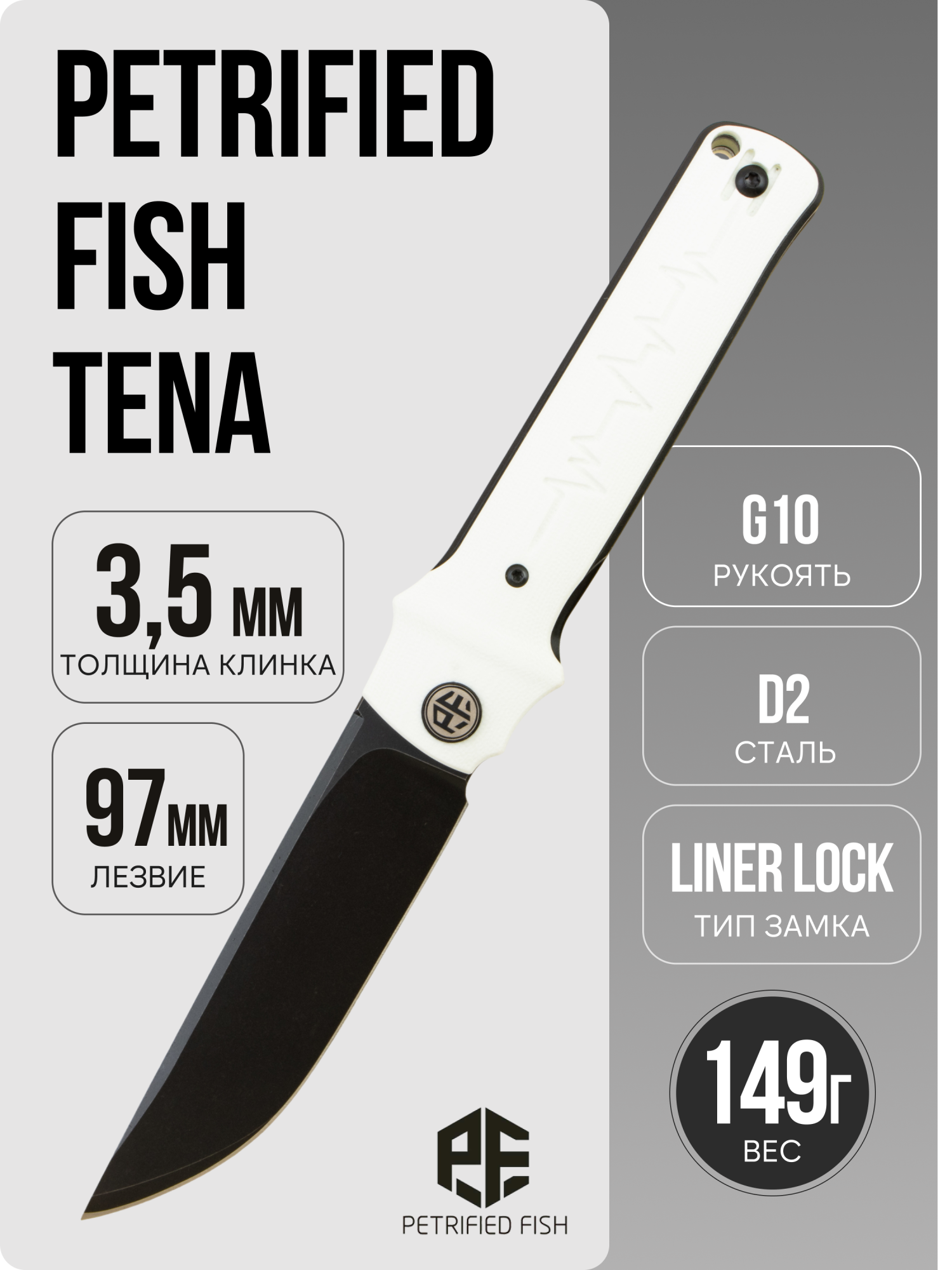 Petrified Fish Tena (PFB04) — утилитарный EDC с аккуратной «чистой» подачей. Ровные плоскости клинка и сдержанный G10 создают спокойный, инструментальный образ без лишнего блеска. Визуально нож выглядит собранно и «готовым к делу»: никаких лишних акцентов, только работающие формы.