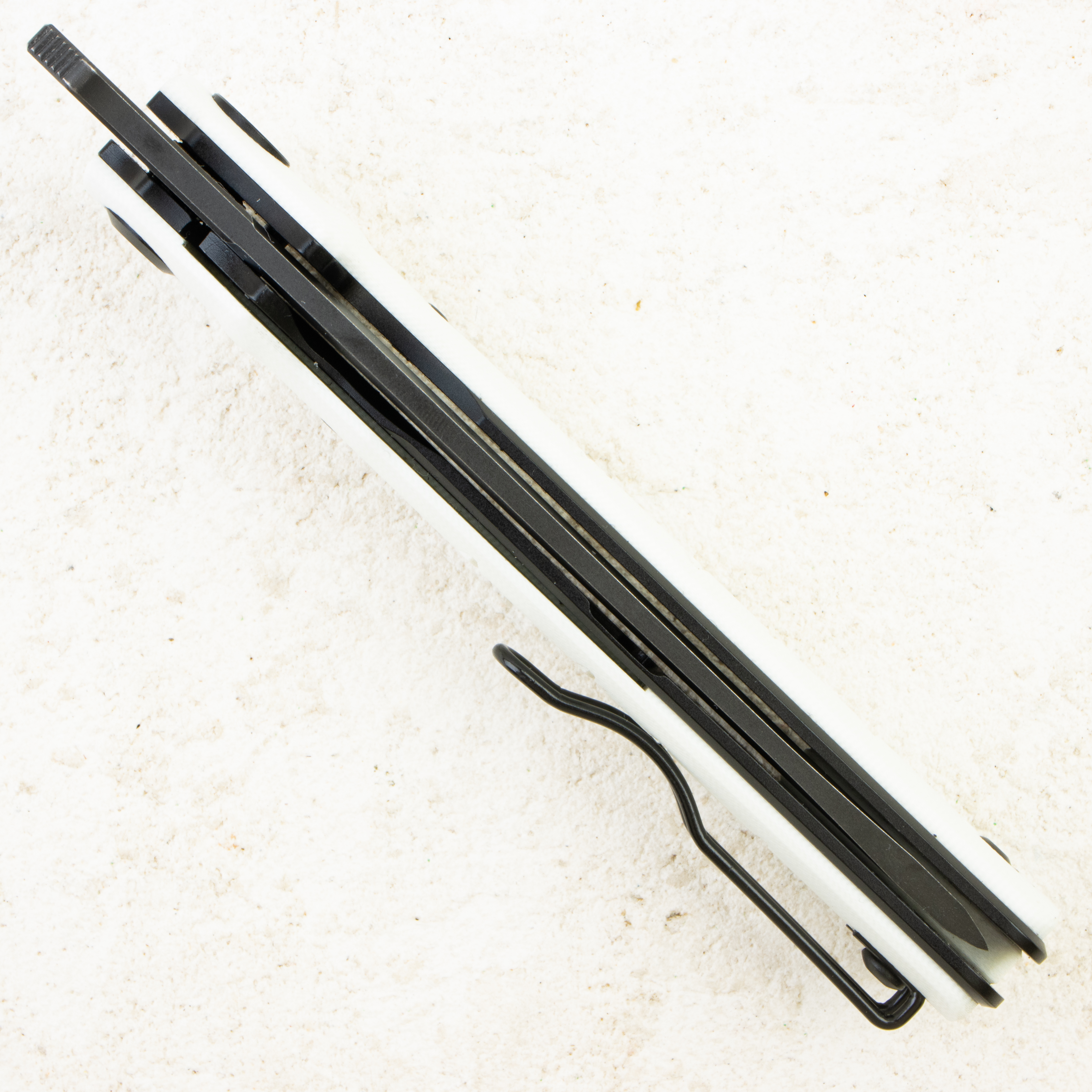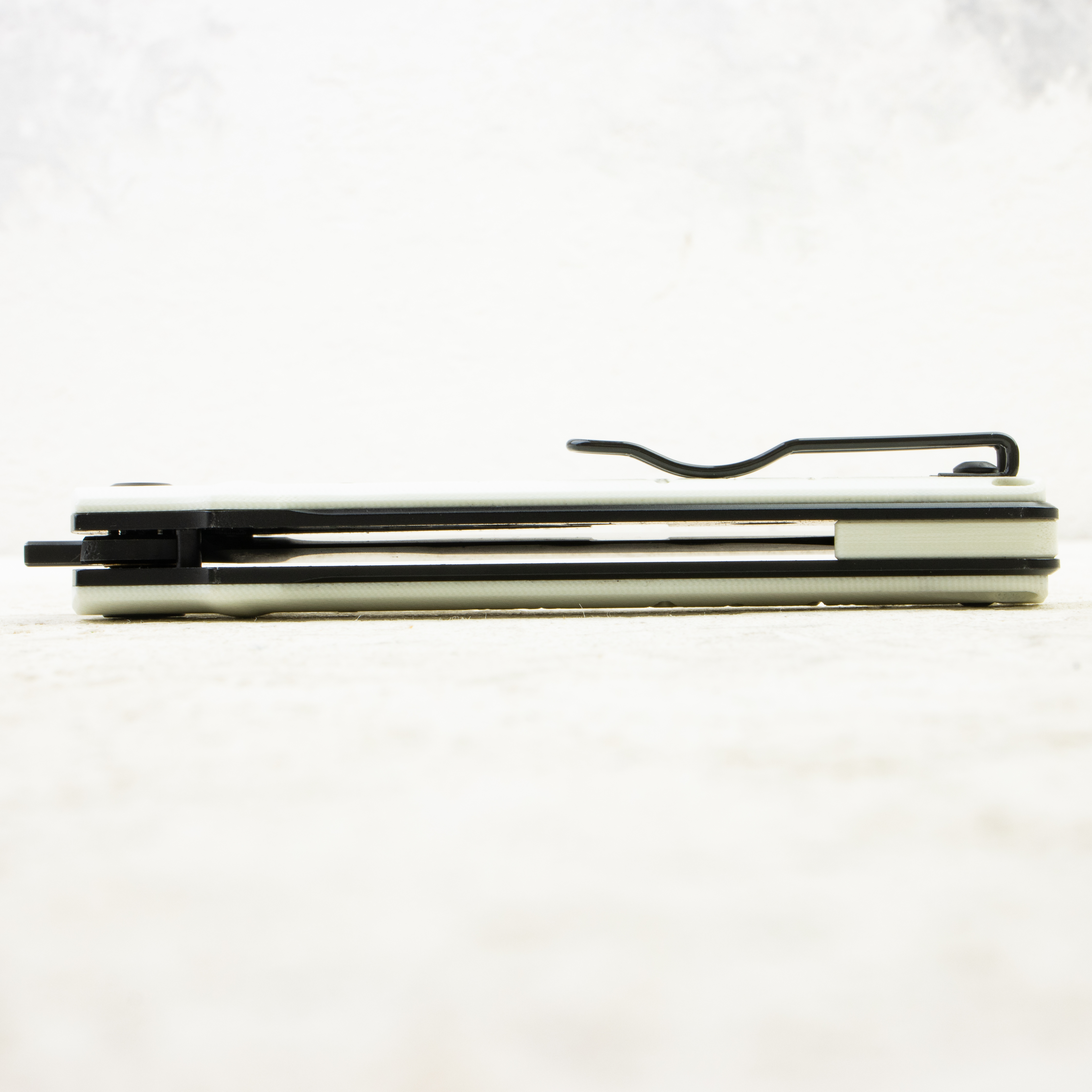 Рукоять — G10 на полноразмерных стальных лайнерах: тактильно «сухая», цепкая и неприхотливая в городе. Толщина рукояти — 16 мм (с клипсой — 21 мм): хват нейтральный и без «горячих» точек; фаски сняты аккуратно, извлечение не цепляет подкладку. Проволочная deep-carry клипса — tip-up под правую сторону — обеспечивает глубокую, незаметную посадку.