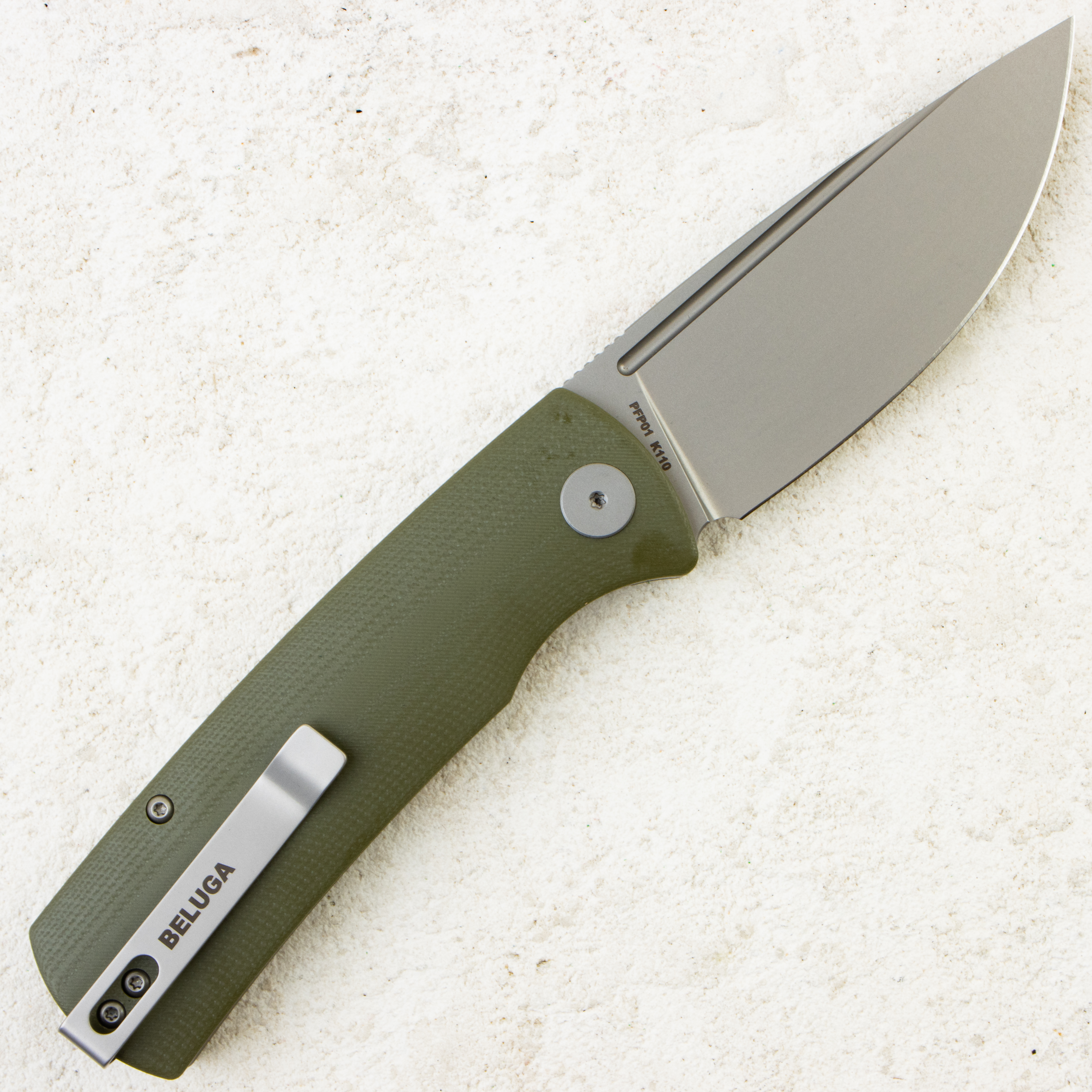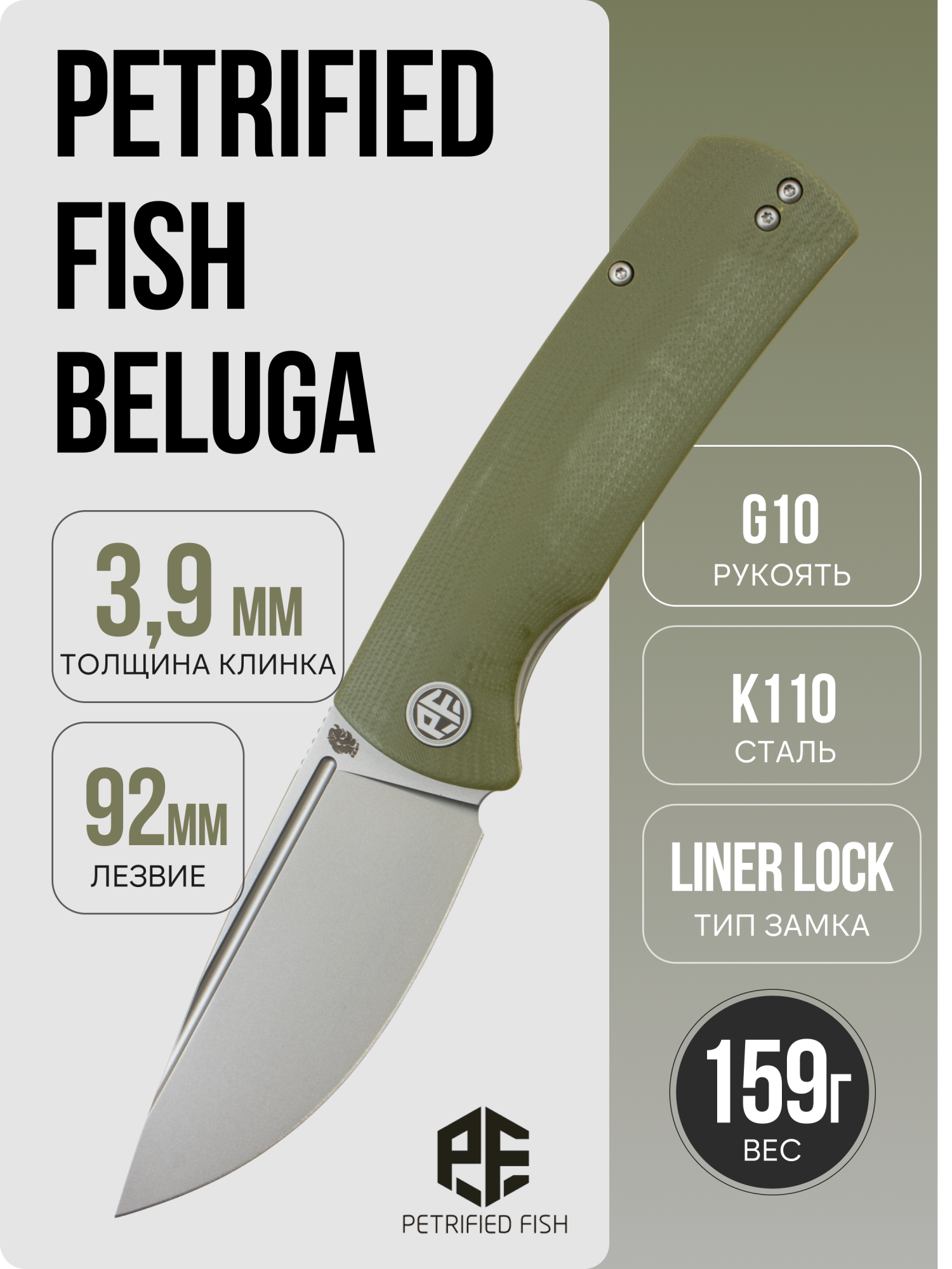 Нож Petrified Fish Beluga (PFP01) — мощный и надежный складной нож, разработанный для активного использования в самых разных условиях. Клинок выполнен из инструментальной стали K110 с высокой твёрдостью и отличной стойкостью режущей кромки. Такая сталь хорошо показывает себя в повседневной работе и на природе, легко справляясь с различными материалами.
