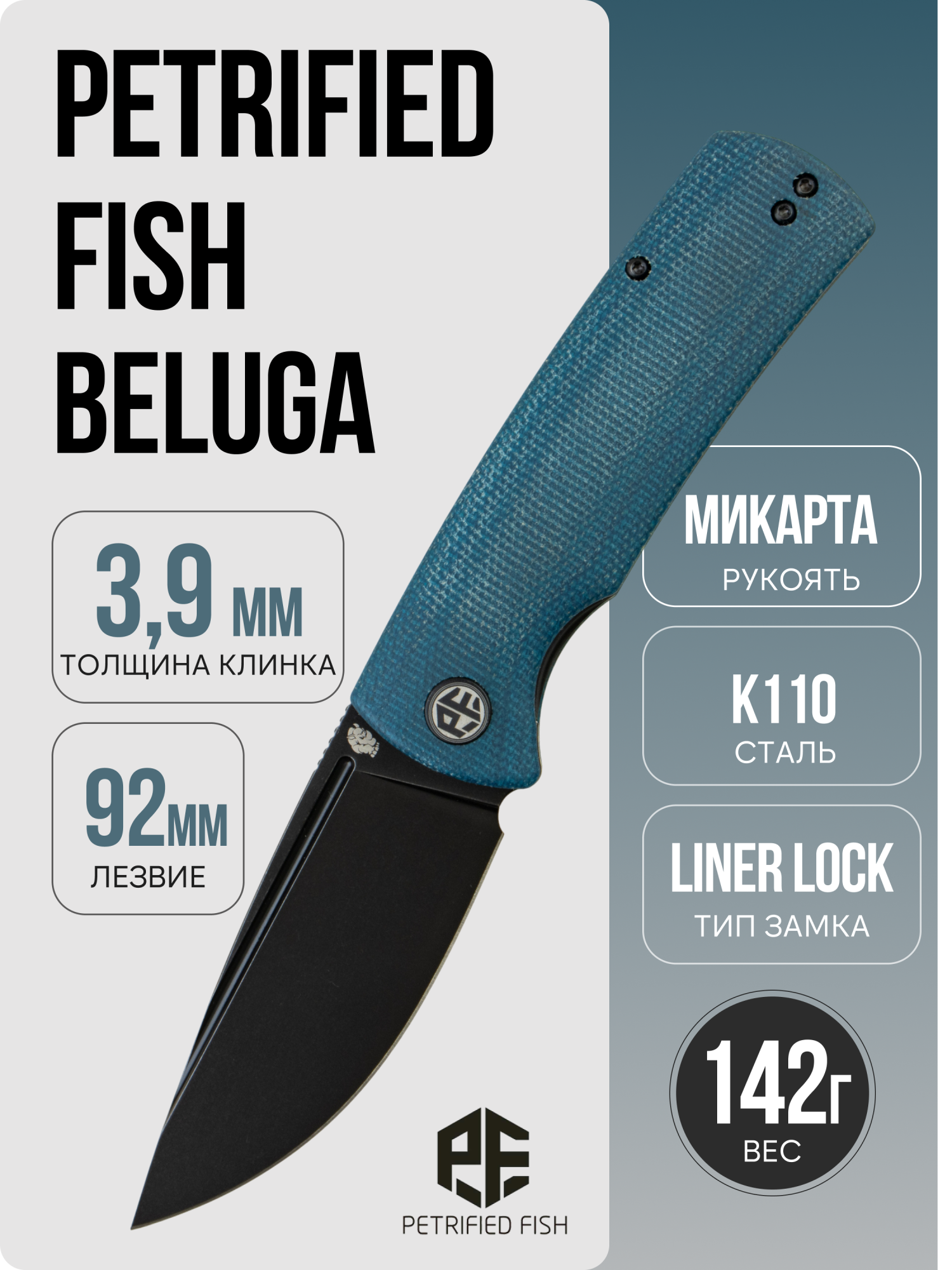 Petrified Fish Beluga PFP01 — крупный, но «послушный» городской фолдер, спроектированный Остапом Хелем. Визуально это ровные, высокие плоскости клинка и спокойная рукоять из микарты без лишнего блеска: нож выглядит как инструмент, который сразу готов к делу, а не как аксессуар.