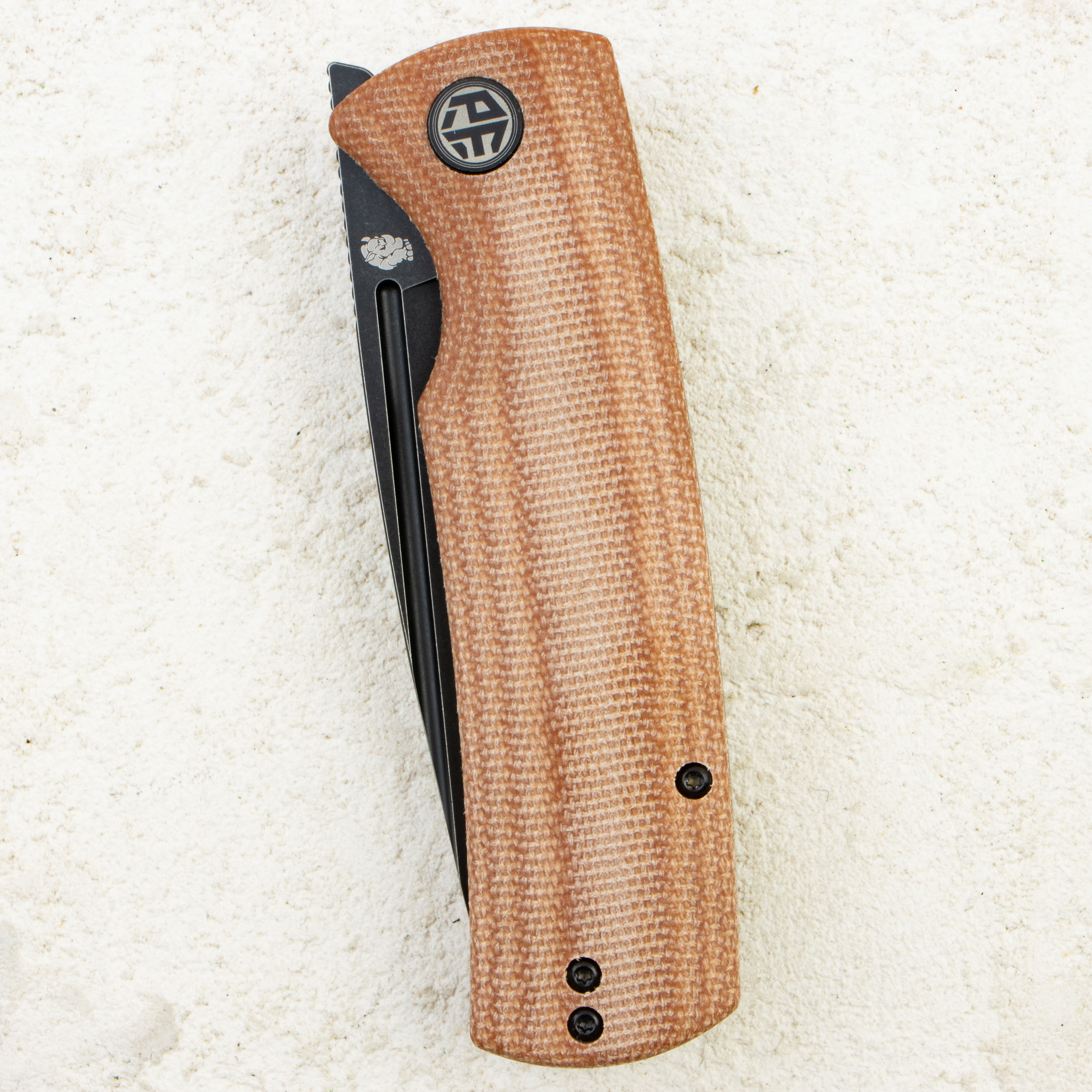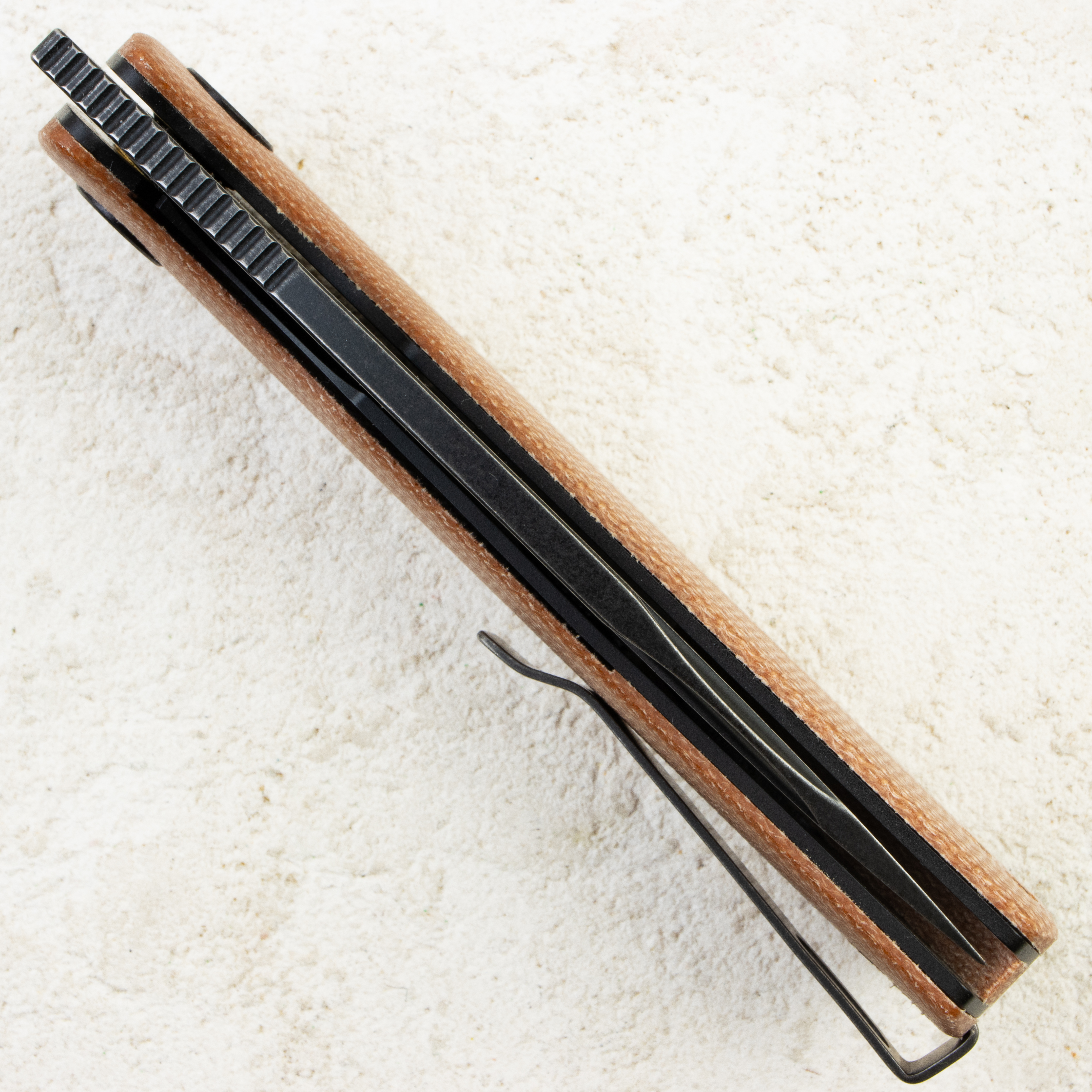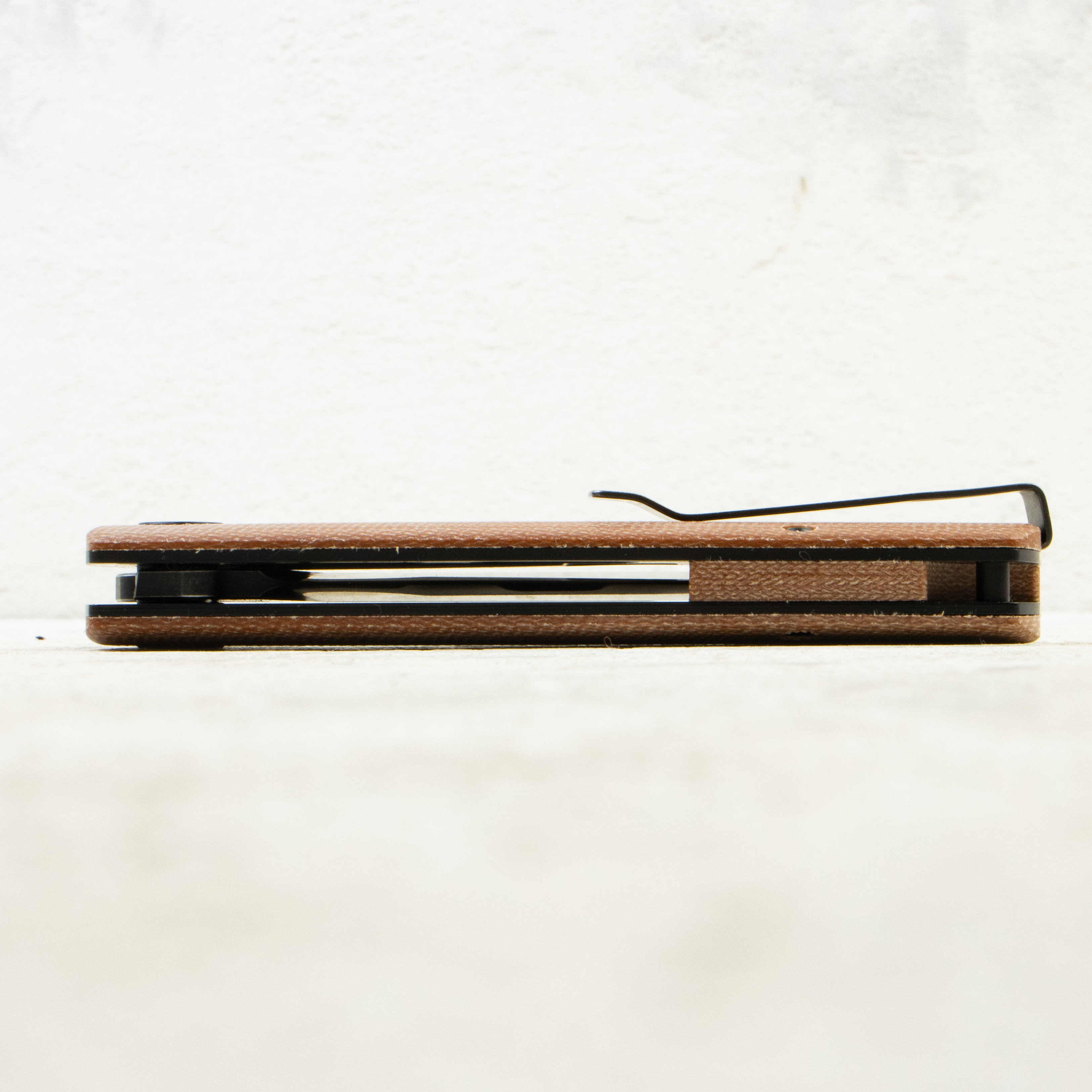 Рукоять — микарта чёрного цвета на полноразмерных стальных лайнерах. Материал «сухой» и цепкий даже во влажной ладони, контур нейтральный и без «горячих» точек, фаски аккуратно сняты. Клипса из нержавеющей стали — deep-carry, реверсивная под правую и левую стороны в положении tip-up, посадка в кармане глубокая и незаметная.