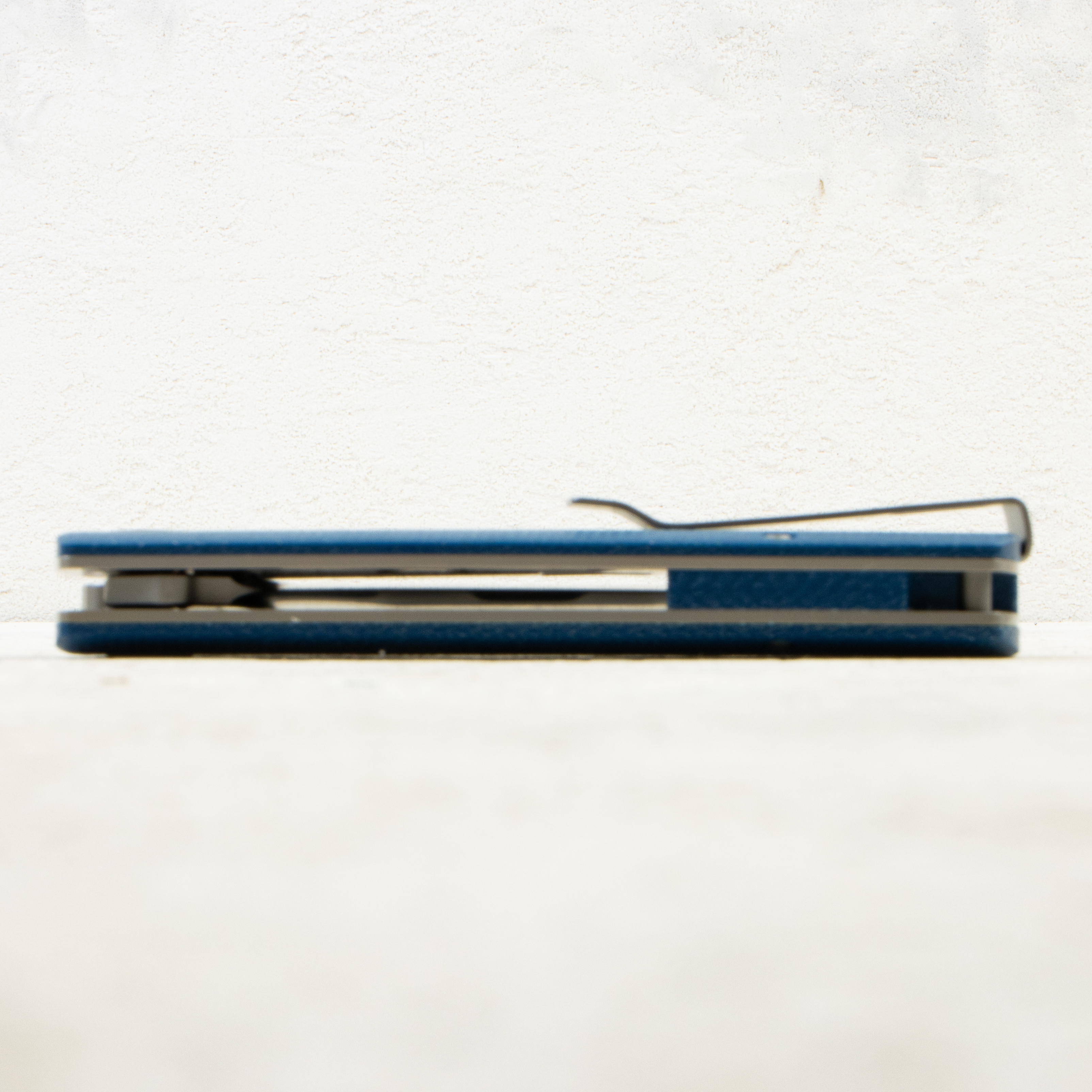 Клинок из K110 (аналог D2) в профиле sheepsfoot с высокими плоскими спусками тянет чистый протяжной рез и даёт точный контроль на кончике при работе «по плоскости». Длина клинка — 92 мм, длина режущей кромки — 90 мм, толщина обуха — 3.9 мм. Сталь держит рабочую острую заметно дольше «обычных» нержавеек и уверенно переносит городские задачи по картону, стропе и плотным пластикам.