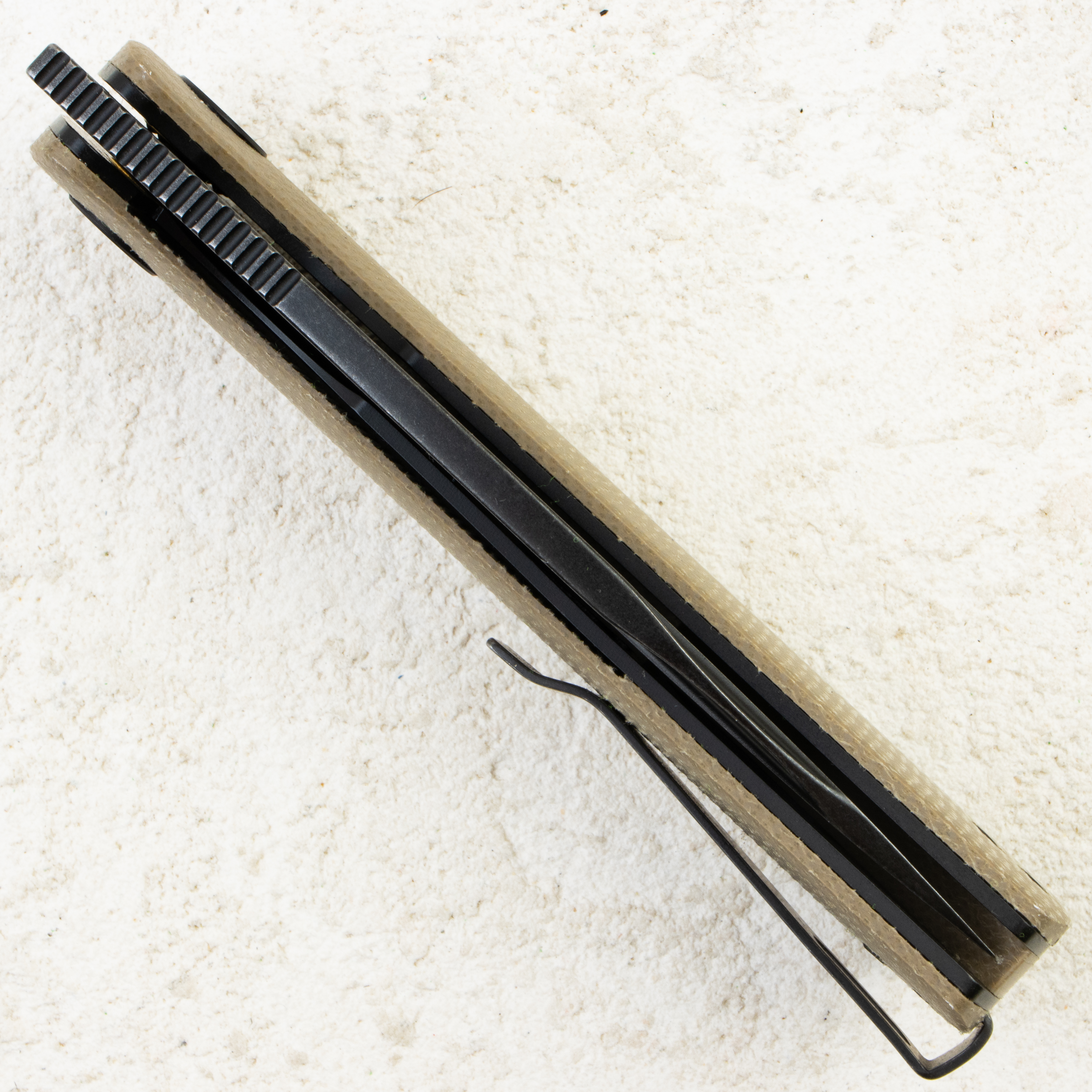 Рукоять — микарта чёрного цвета на полноразмерных стальных лайнерах. Материал «сухой» и цепкий даже во влажной ладони, контур нейтральный и без «горячих» точек, фаски аккуратно сняты. Клипса из нержавеющей стали — deep-carry, реверсивная под правую и левую стороны в положении tip-up, посадка в кармане глубокая и незаметная.