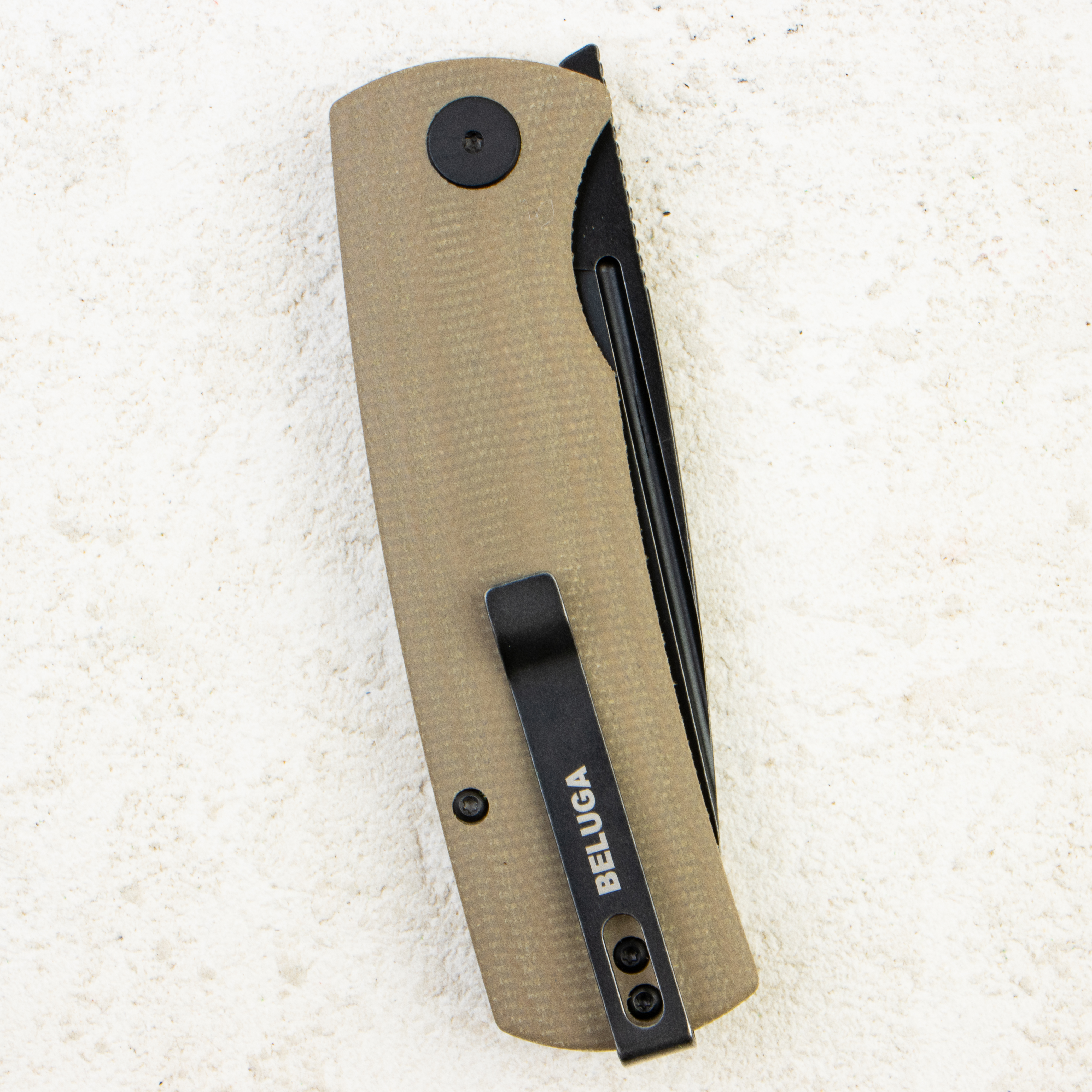 Petrified Fish Beluga PFP01 — крупный, но «послушный» городской фолдер, спроектированный Остапом Хелем. Визуально это ровные, высокие плоскости клинка и спокойная рукоять из микарты без лишнего блеска: нож выглядит как инструмент, который сразу готов к делу, а не как аксессуар.