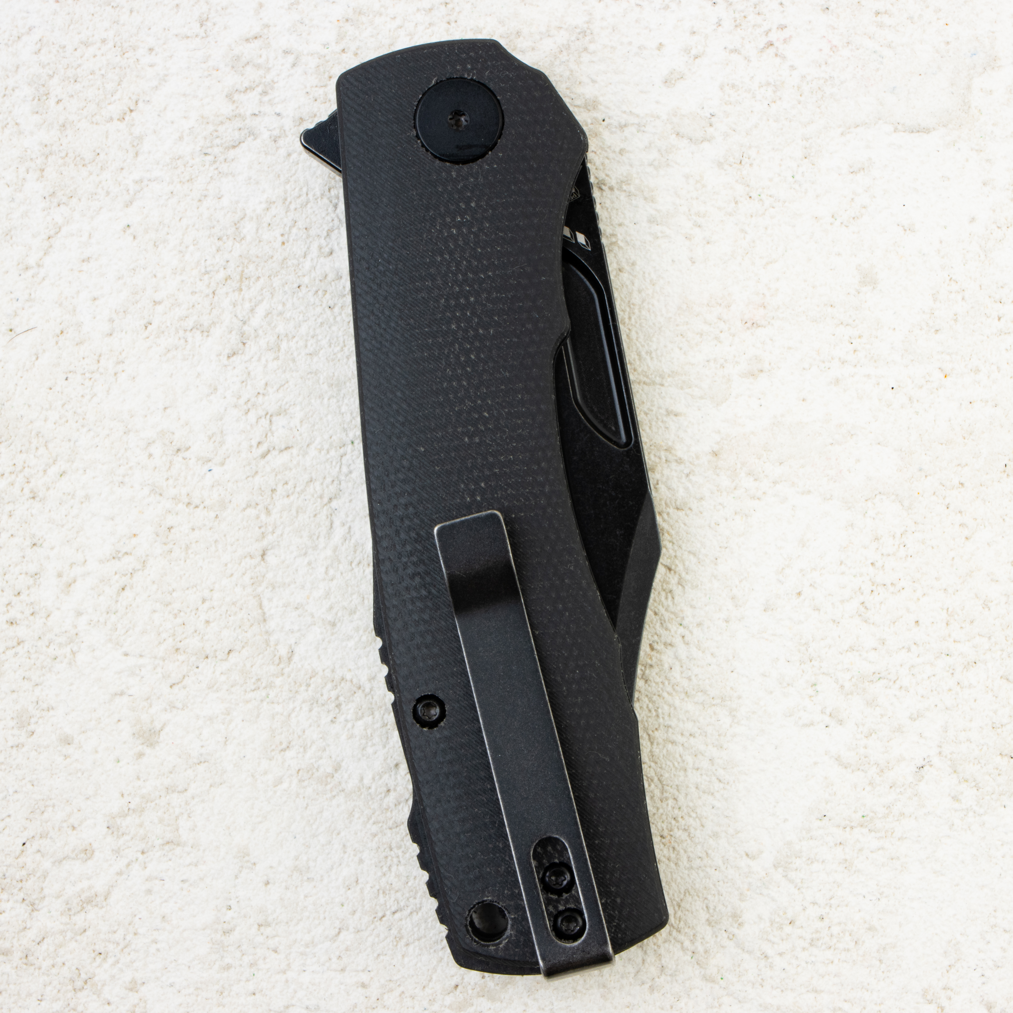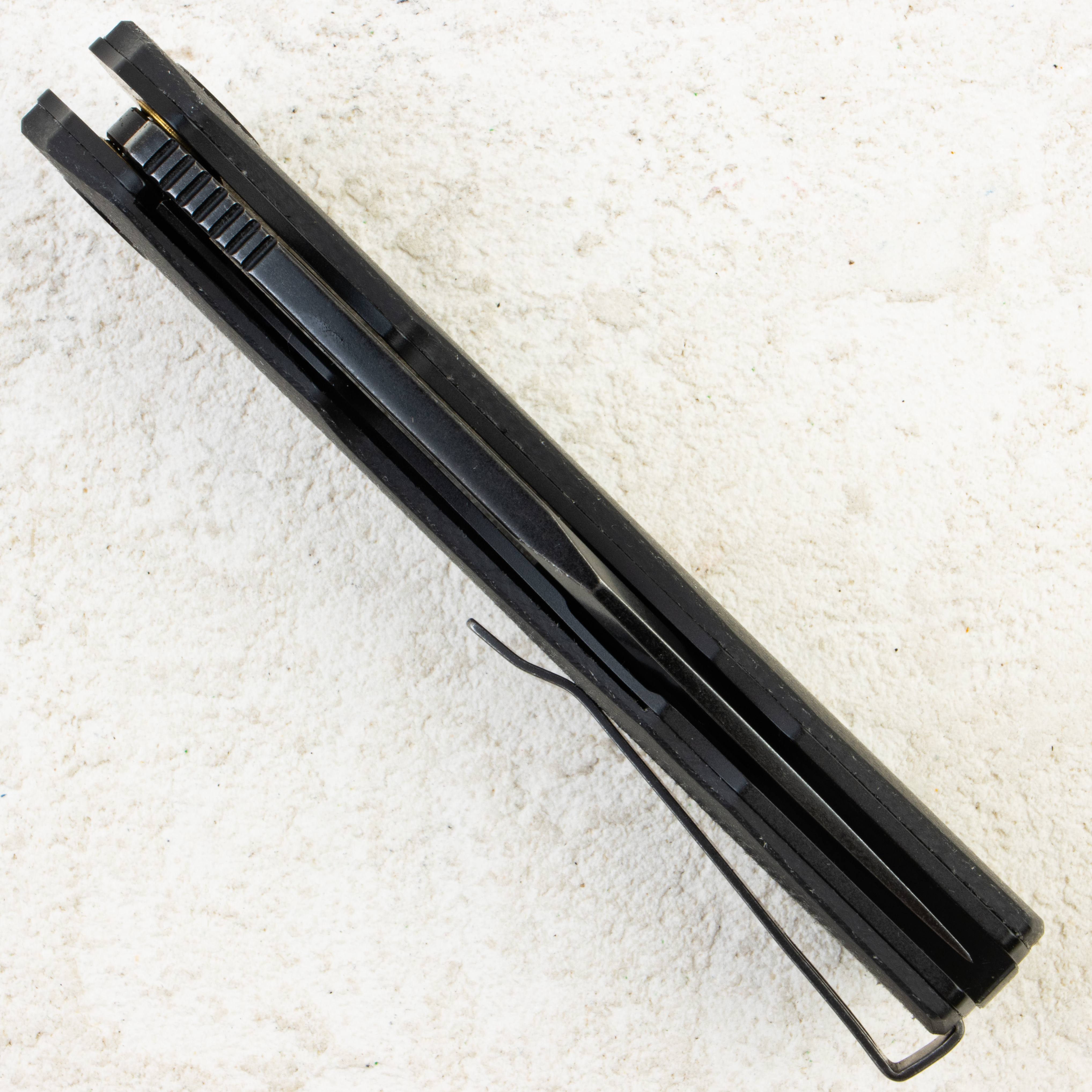 Рукоять — микарта на полноразмерных стальных лайнерах: материал «сухой» и цепкий даже во влажной ладони, контуры нейтральные и не создают «горячих» точек при силовой протяжке. Клипса — реверсивная tip-up под правую или левую сторону, предусмотрено отверстие под темляк. В закрытом состоянии нож не «распирает» карман и быстро извлекается.