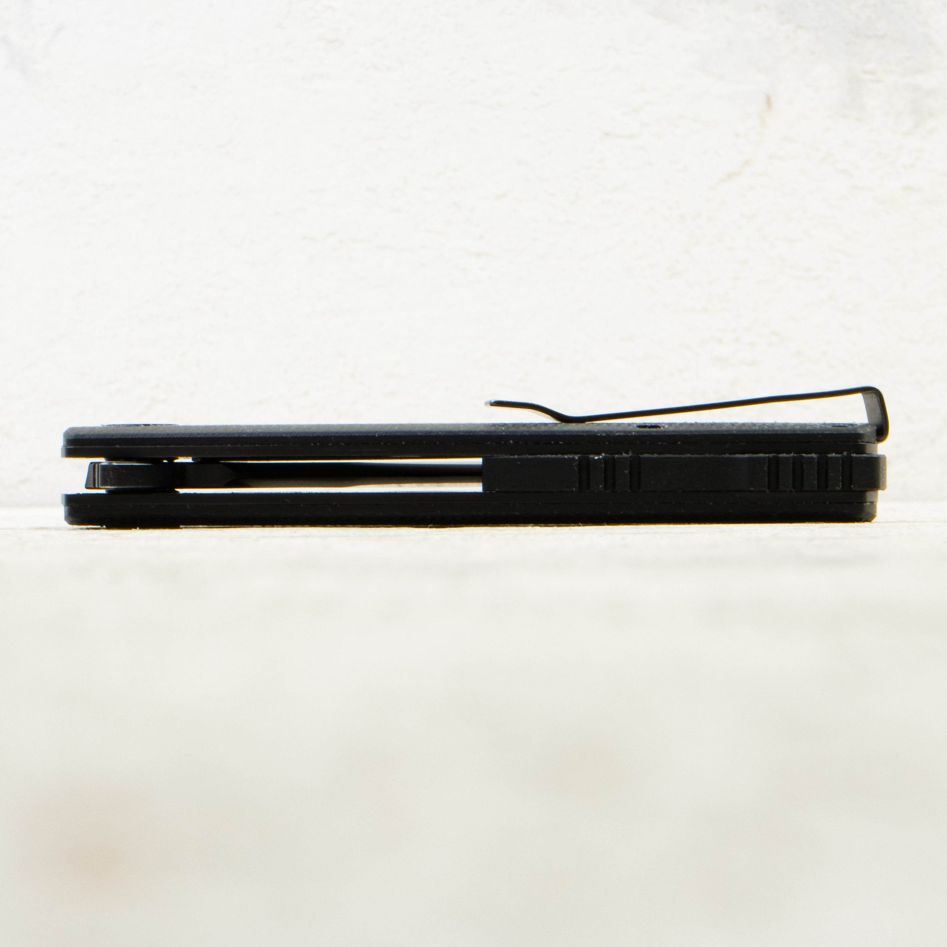 Клинок из K110 (класс D2) выполнен в клип-пойнте с плоскими спусками от обуха: рез получается прямолинейным и предсказуемым по картону, стропе и плотным пластикам, а кончик уверенно ведёт точные подрезы «по плоскости». Длина клинка — 91 мм, толщина обуха — 3.8мм. Твёрдость 59–60 HRC даёт заметный ресурс кромки при редкой правке; финиш — сатин или чёрный стоунвош в зависимости от конкретной версии.