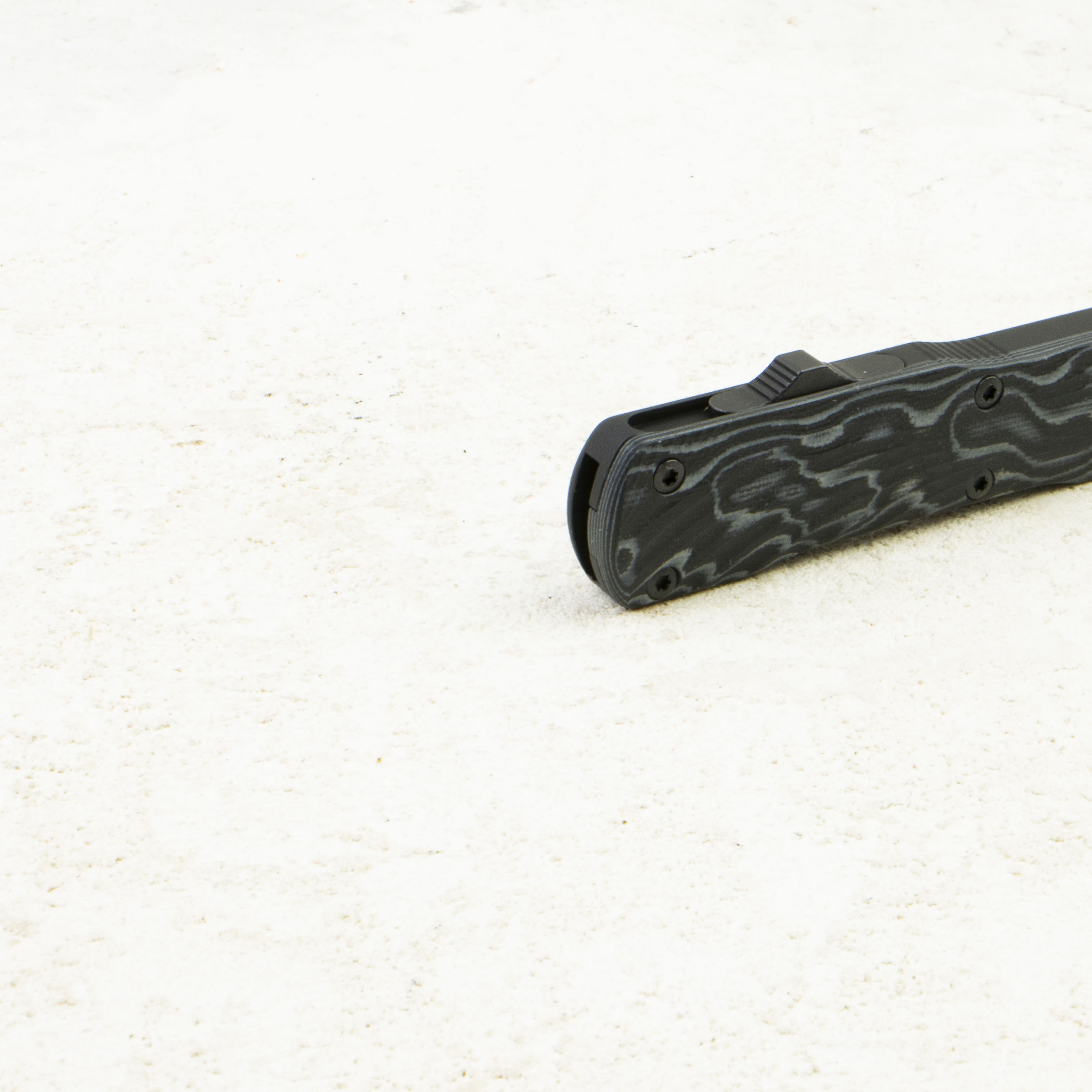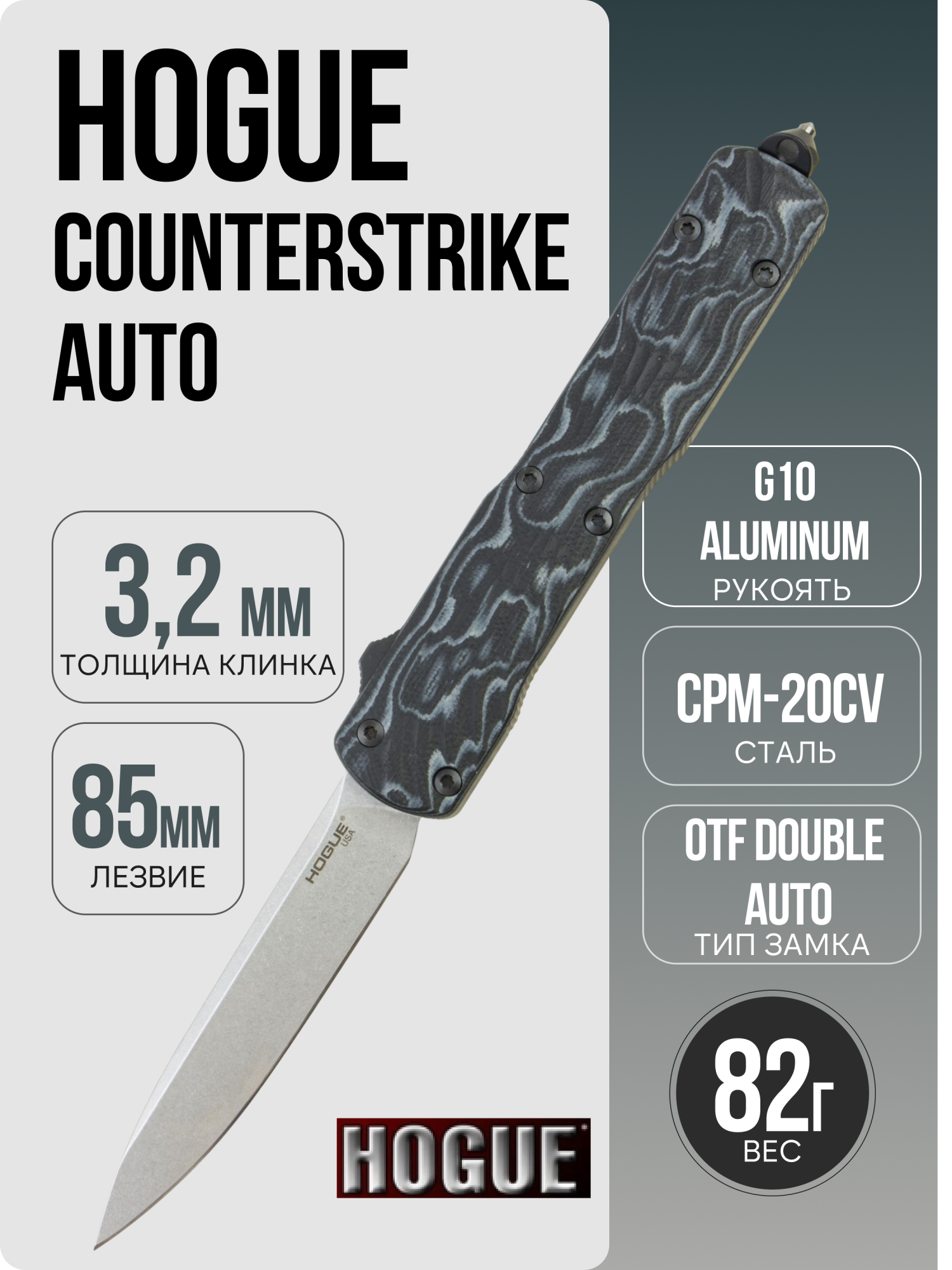 Особенностью Hogue Counterstrike Auto является механизм Double-Action Out The Front (OTF), который позволяет быстро и плавно выдвинуть или убрать клинок при помощи амбидекстрального триггера. Замок надежно фиксирует клинок как в открытом, так и в закрытом положении, обеспечивая безопасность использования ножа в любой ситуации.