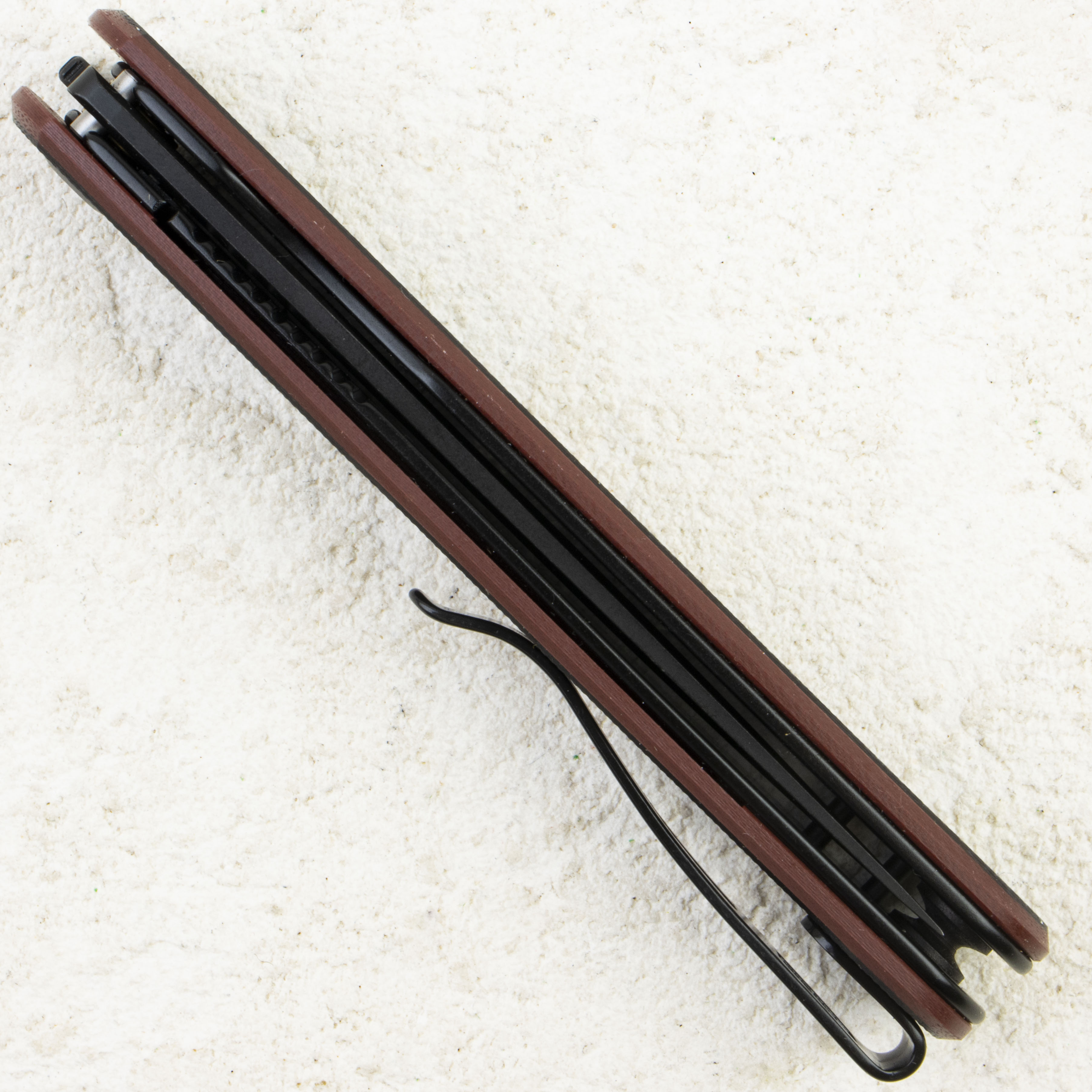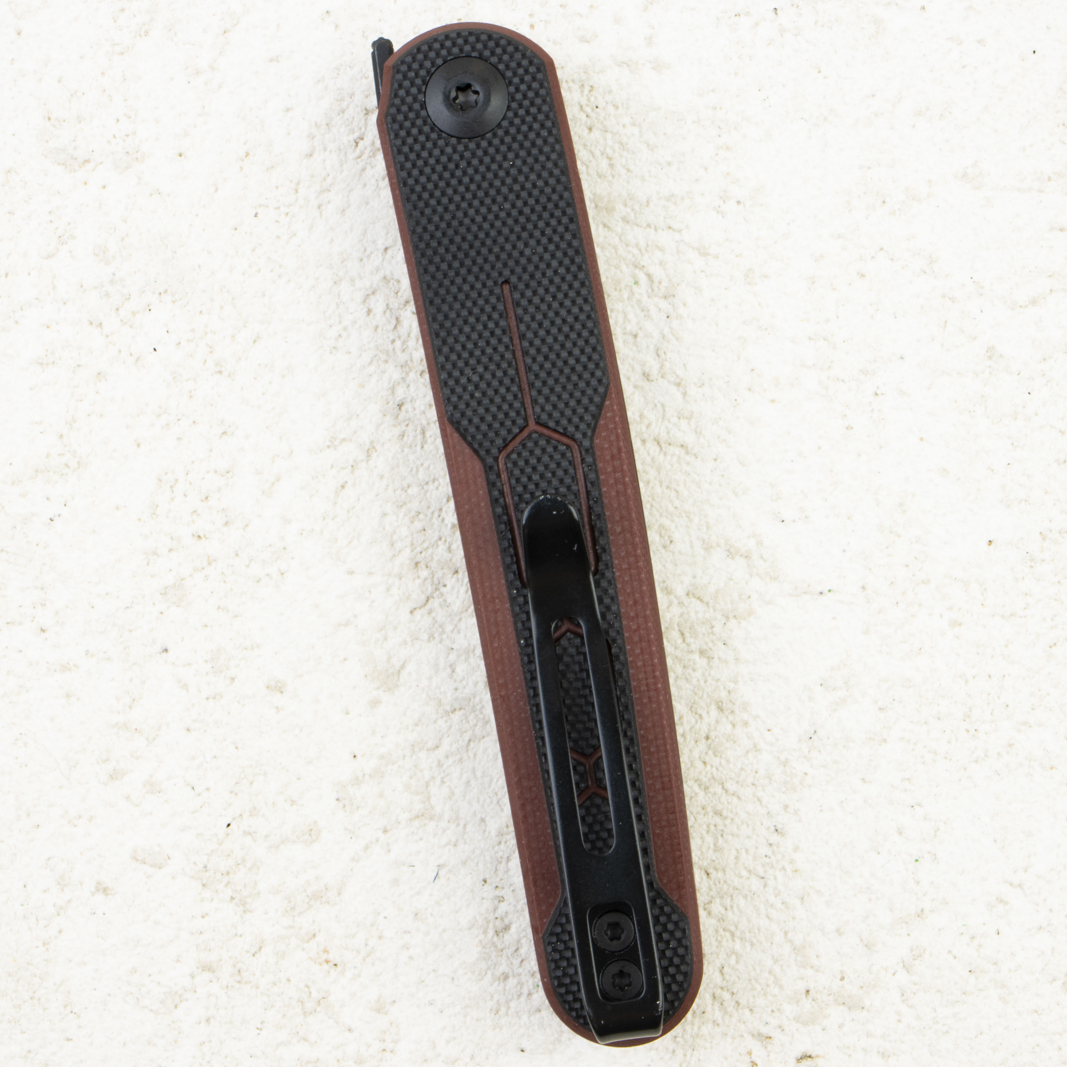 Рукоять выполнена из черного G10 — прочного, влагостойкого материала, обеспечивающего надёжный хват и износостойкость. За открытие клинка отвечает флиппер, а надёжную фиксацию обеспечивает лайнер-лок.