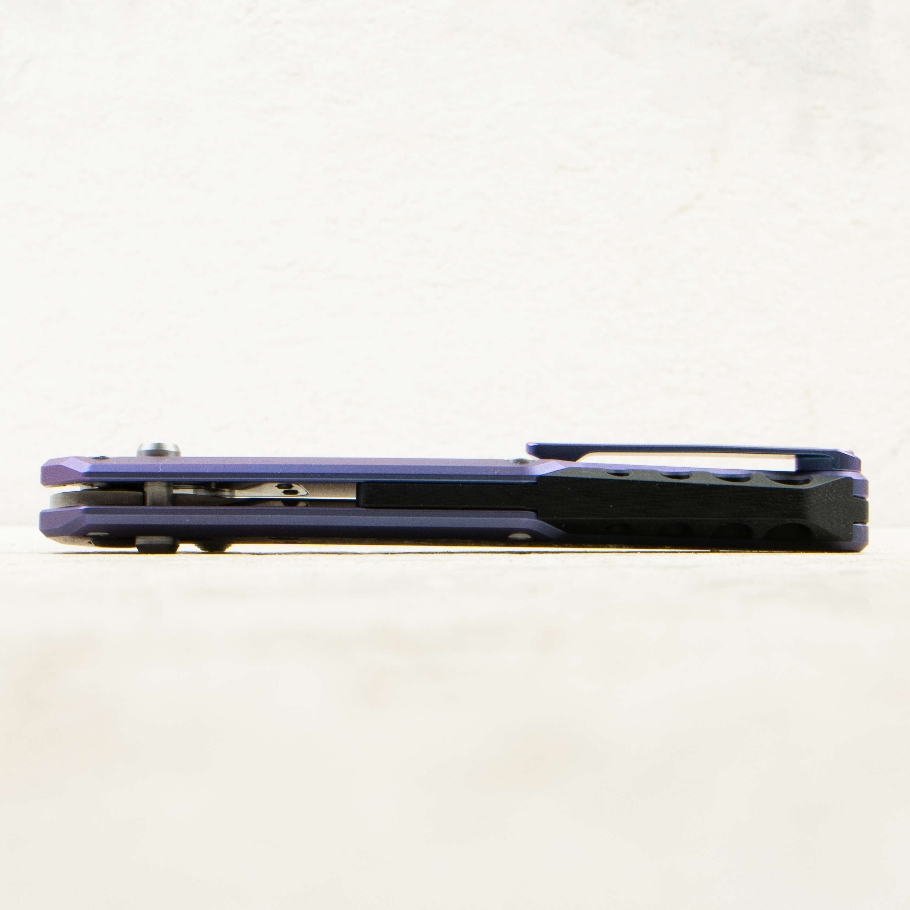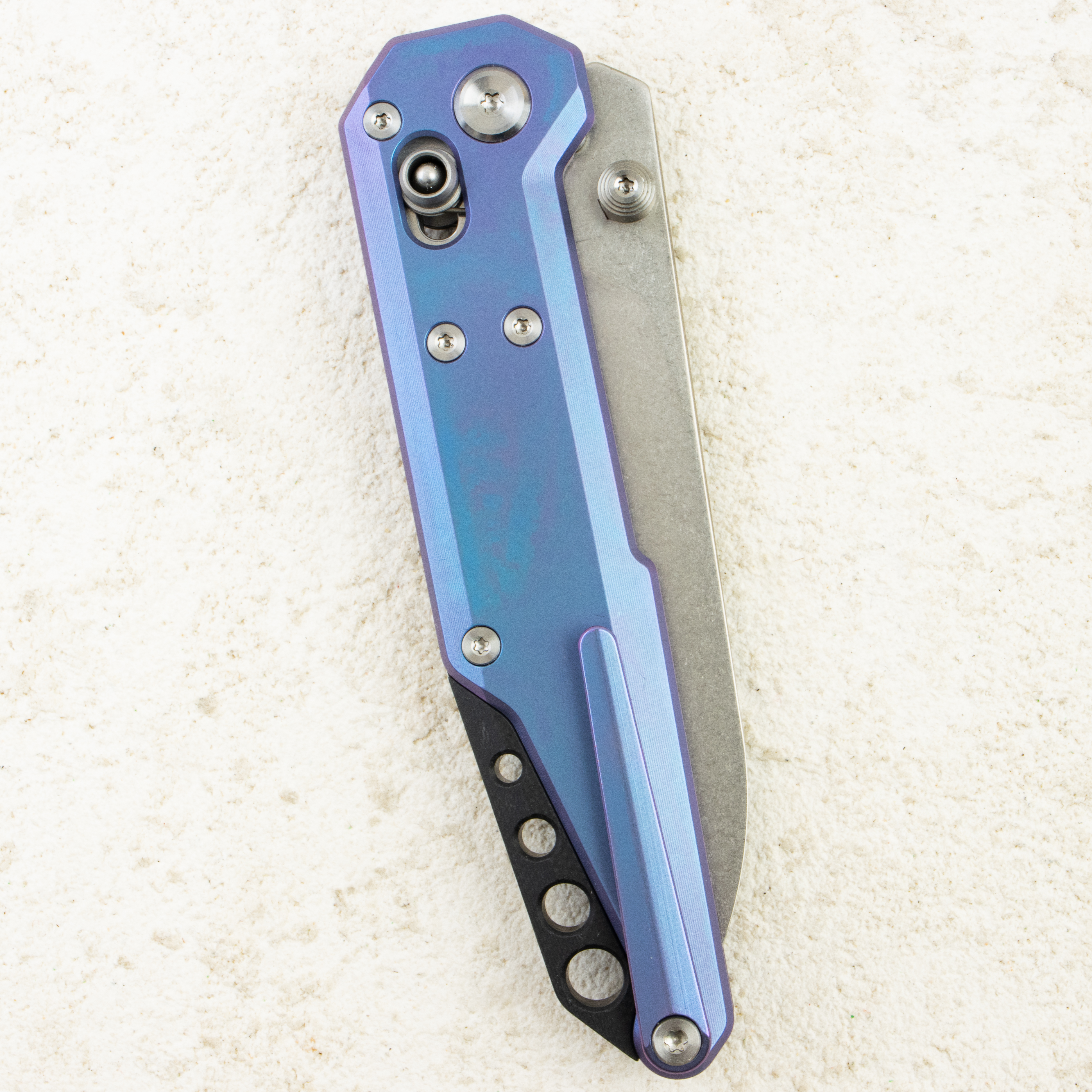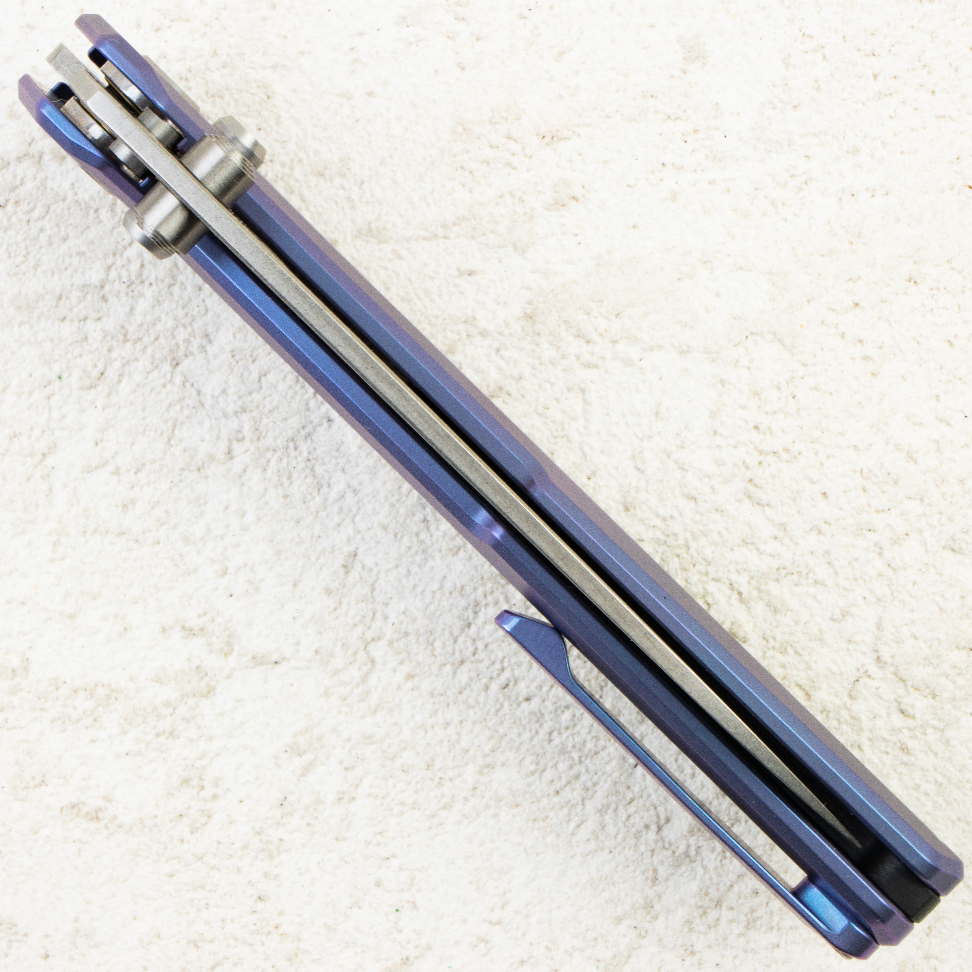 Рукоять выполнена из анодированного титана синего оттенка с аккуратной фрезеровкой, которая добавляет стиля и улучшает сцепление. Толщина рукояти около 10,8 мм, что делает нож тонким и удобным при ношении в кармане. В конструкции использован бэкспейсер из G10, добавляющий жёсткость и гармонию дизайну.
