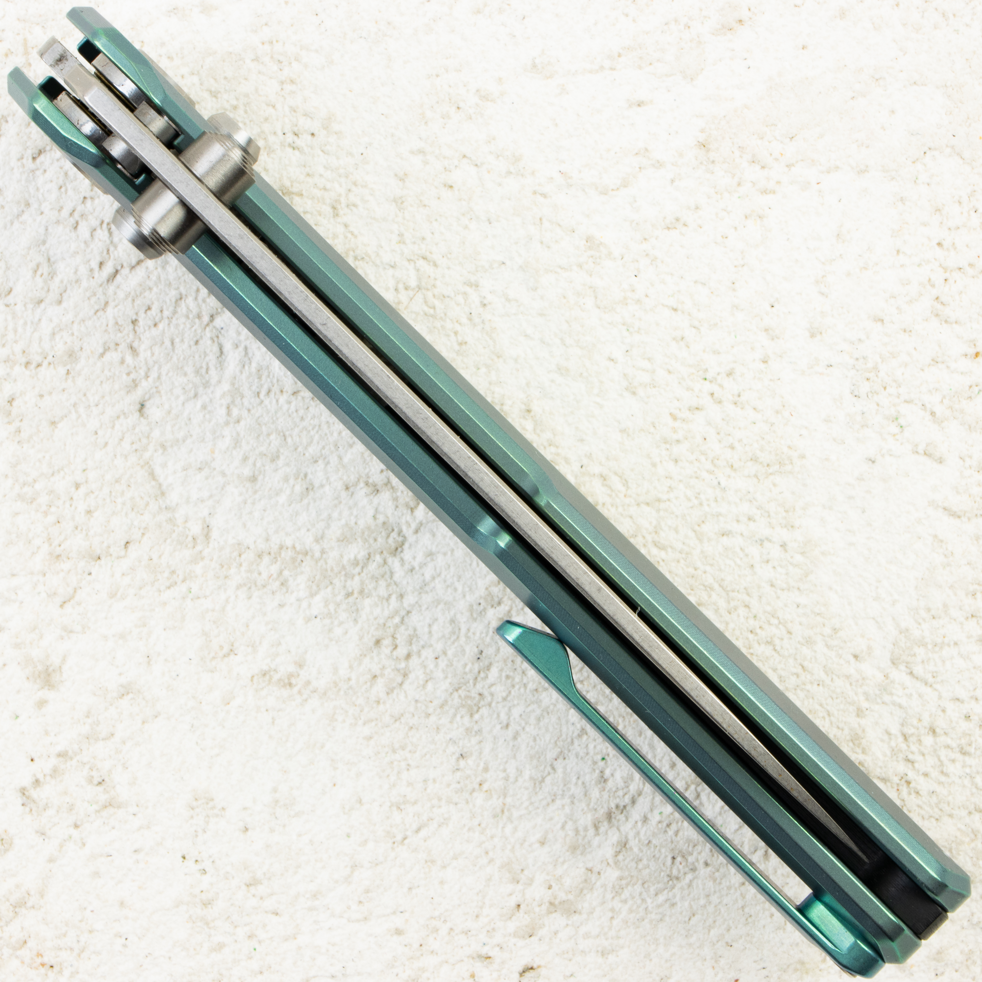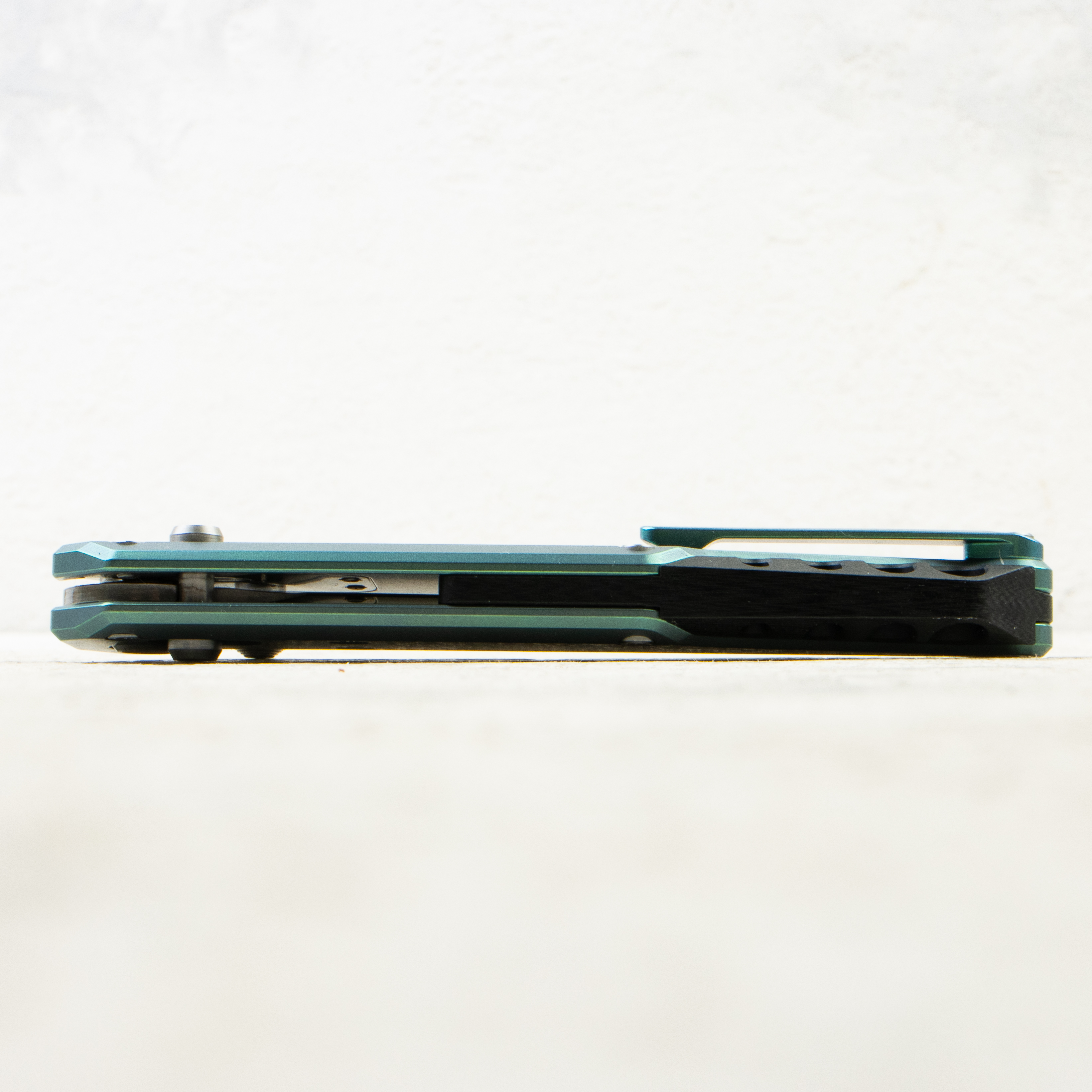 Рукоять выполнена из анодированного титана зеленого оттенка с аккуратной фрезеровкой, которая добавляет стиля и улучшает сцепление. Толщина рукояти около 10,8 мм, что делает нож тонким и удобным при ношении в кармане. В конструкции использован бэкспейсер из G10, добавляющий жёсткость и гармонию дизайну.