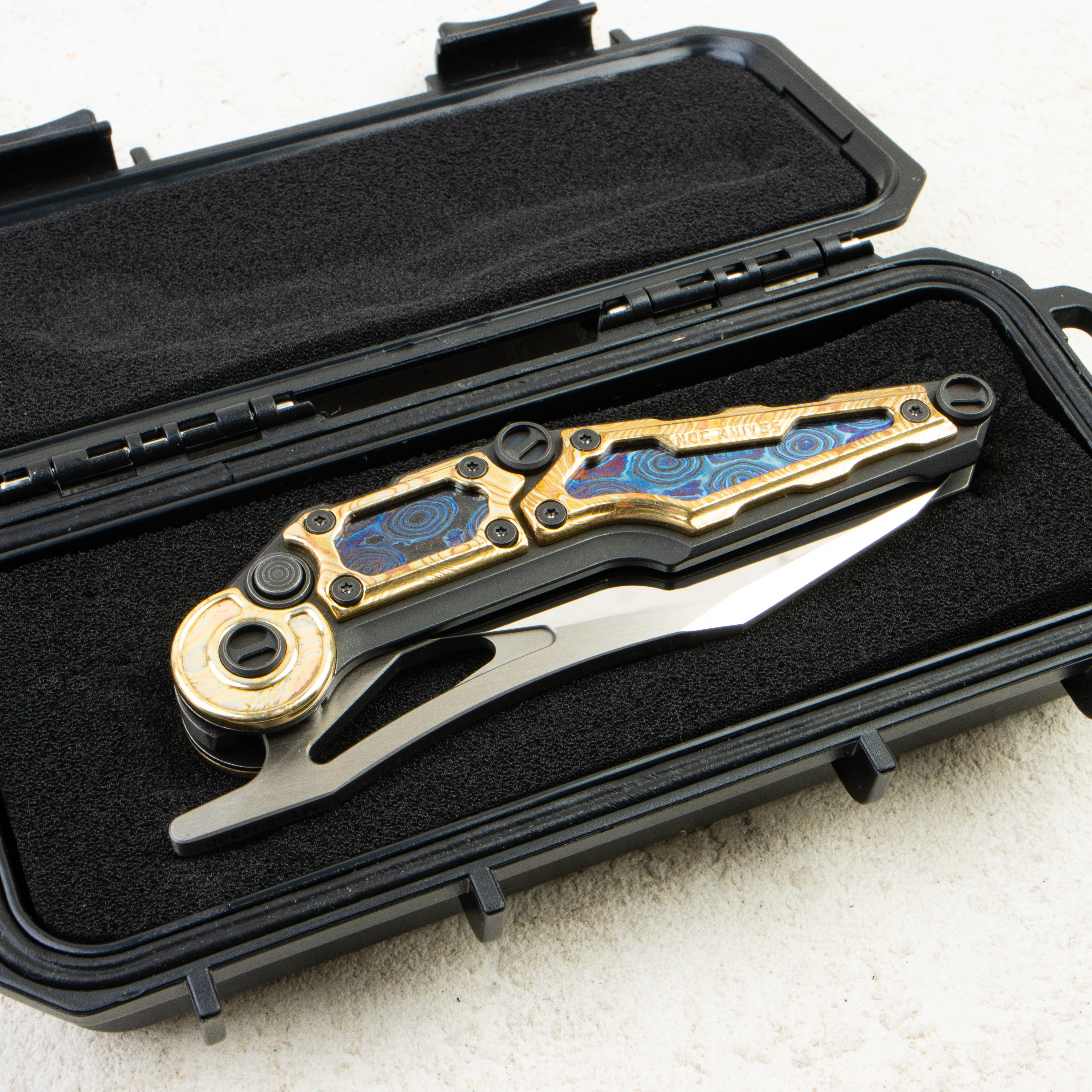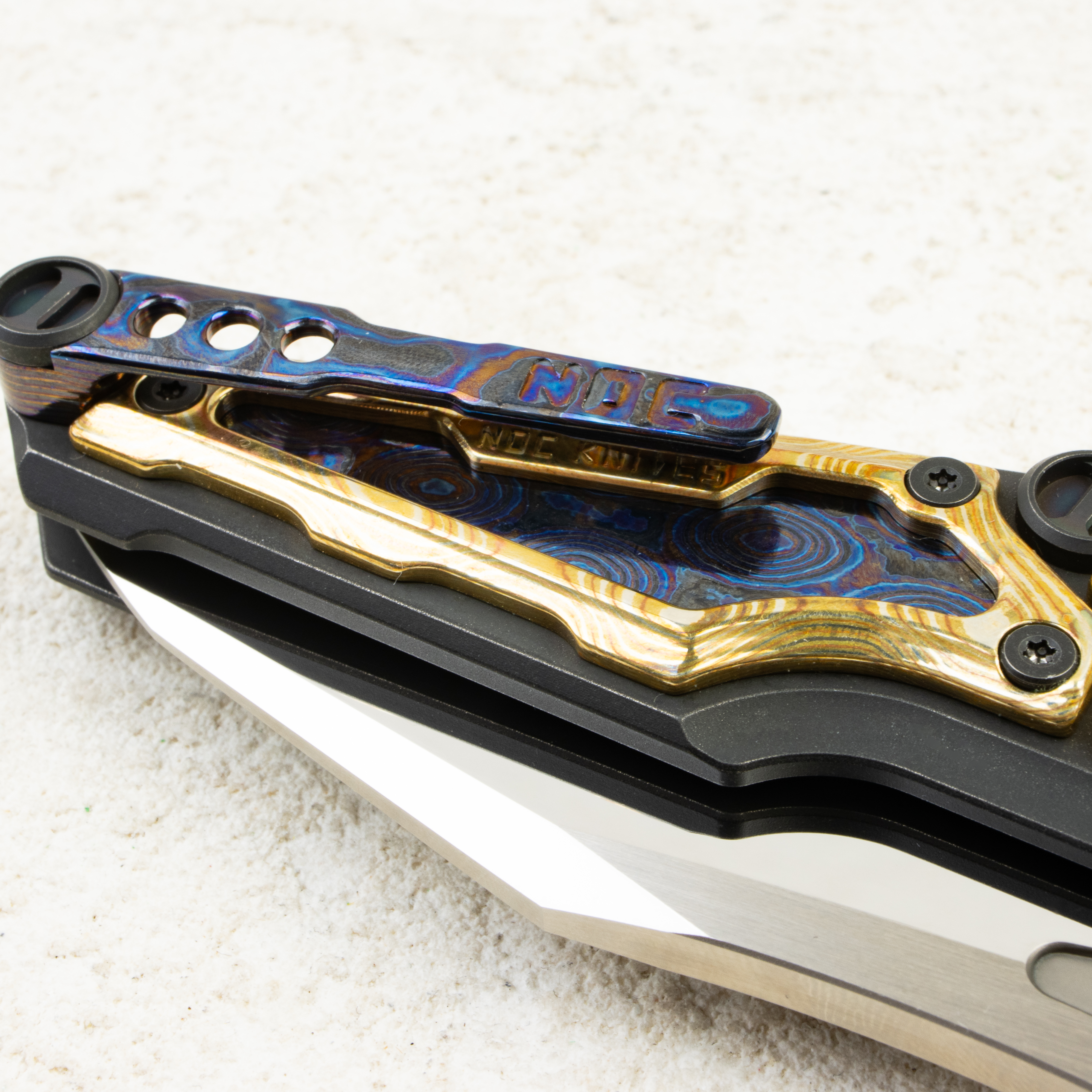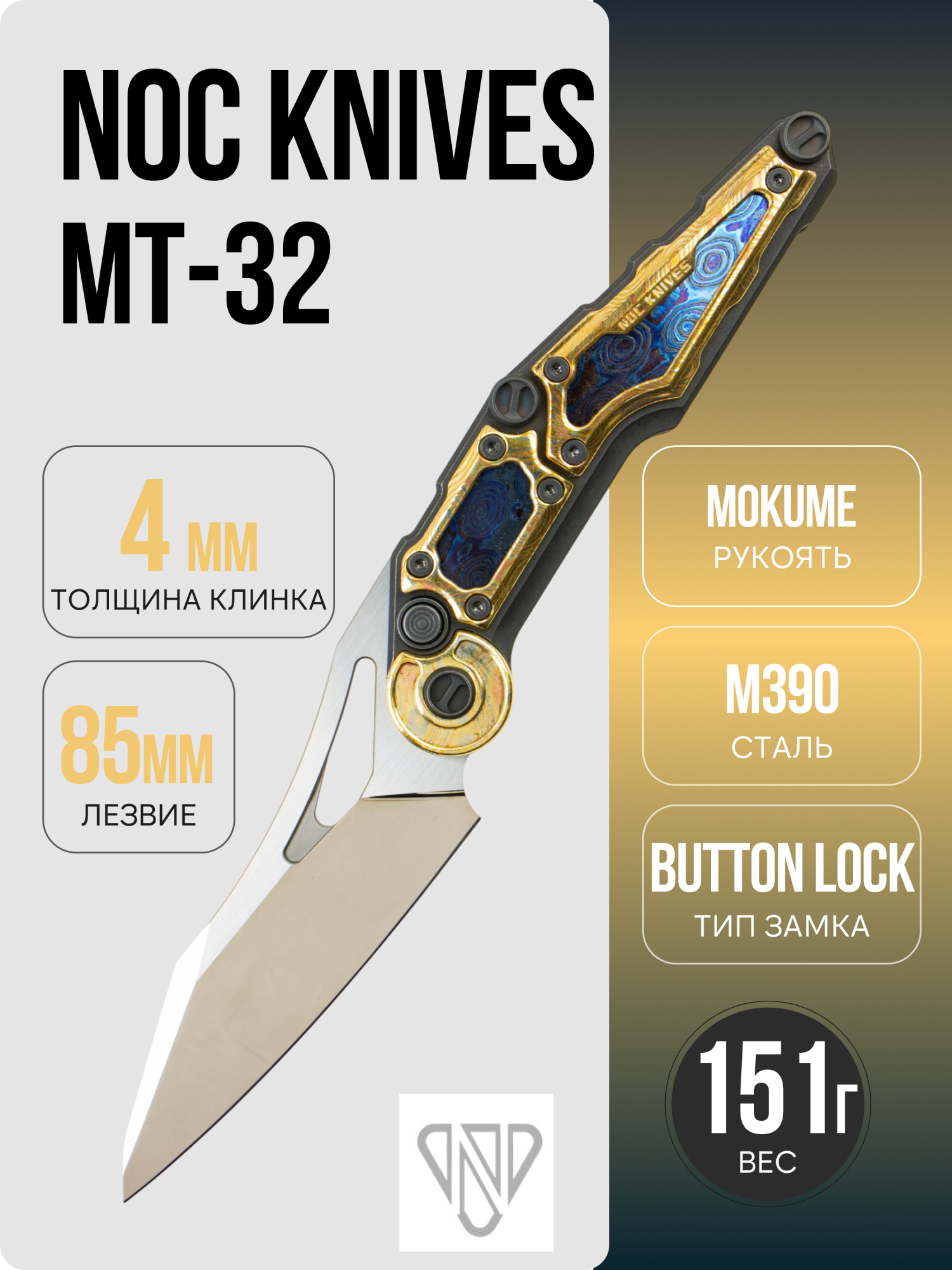 NOC Knives MT-32 в этой комплектации — про визуальную глубину и безупречную подгонку. Зеркально отполированный клинок отражает окружение как «чёрное зеркало»: строгая линия wharncliffe подчёркивает геометрию, а плоскости ловят свет ровно и чисто, без «волн» и паразитных бликов. Нож смотрится технологично и при этом по-настоящему дорогим — это тот случай, когда инструмент работает так же впечатляюще, как выглядит.