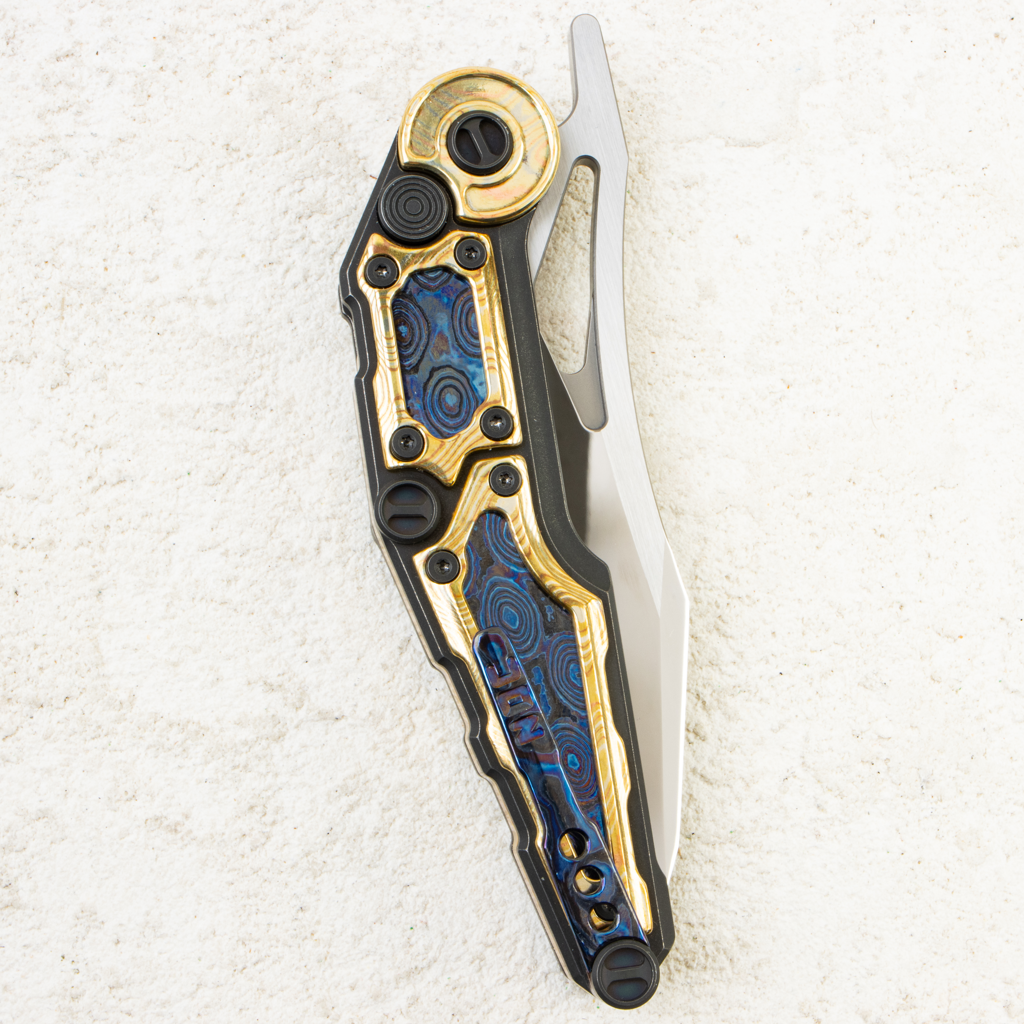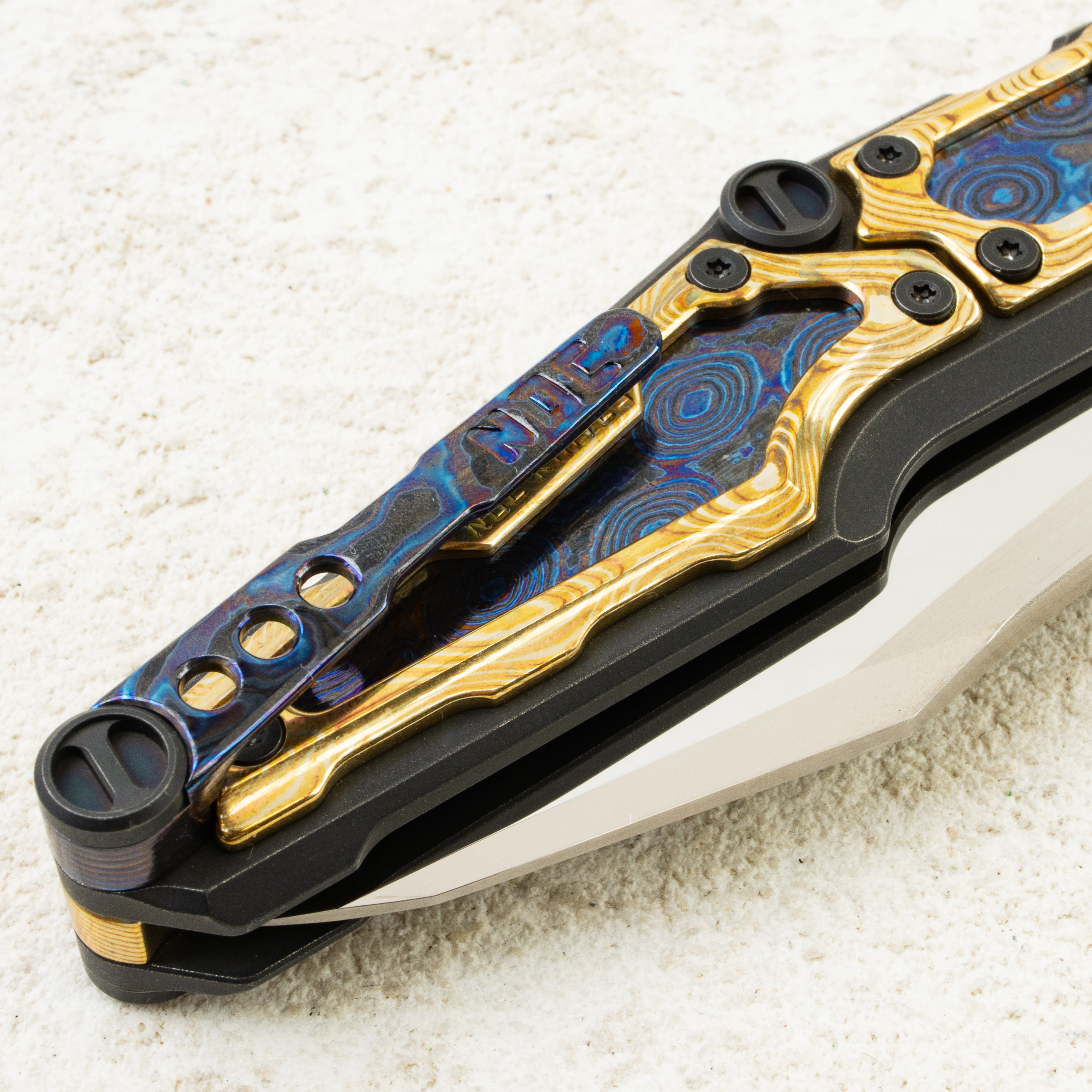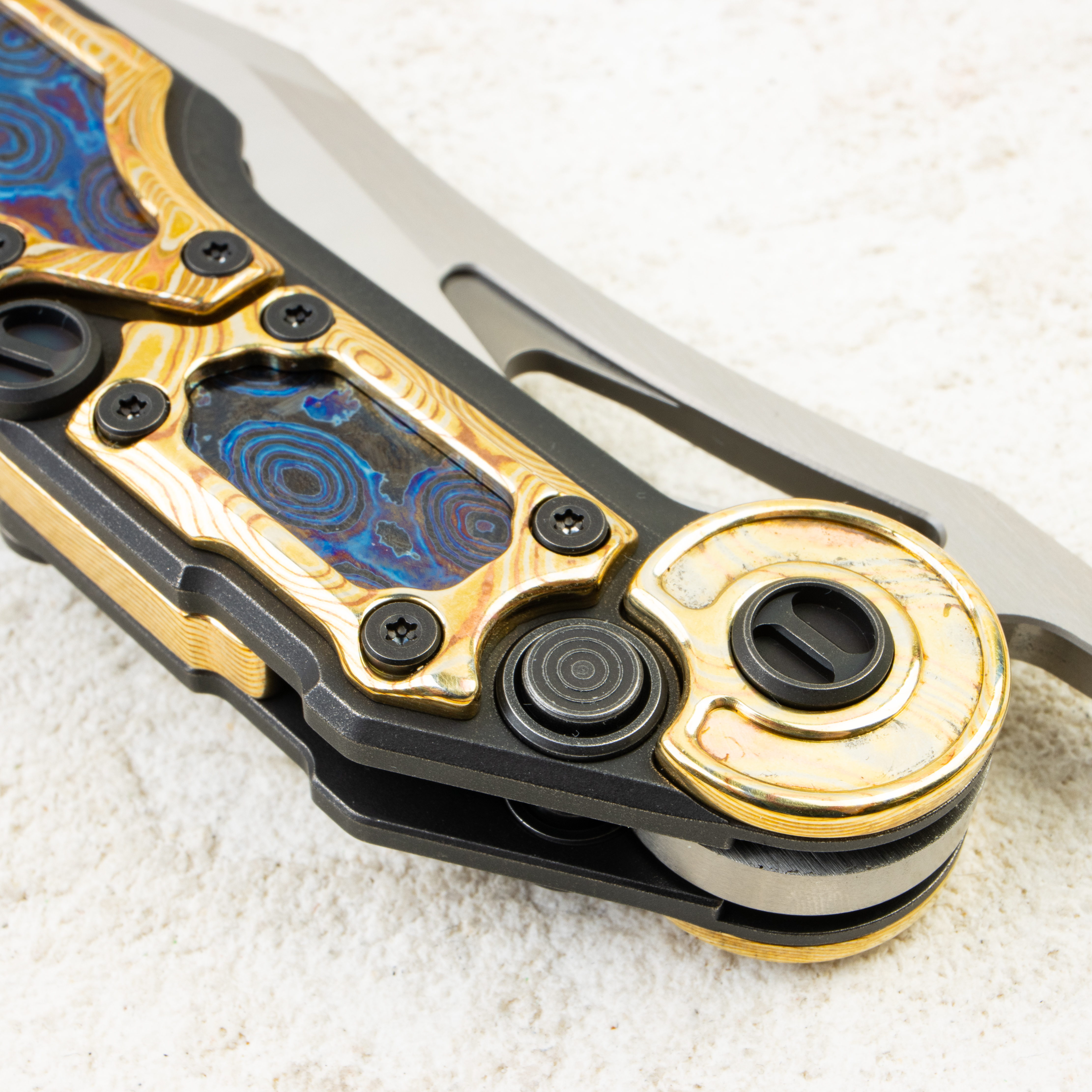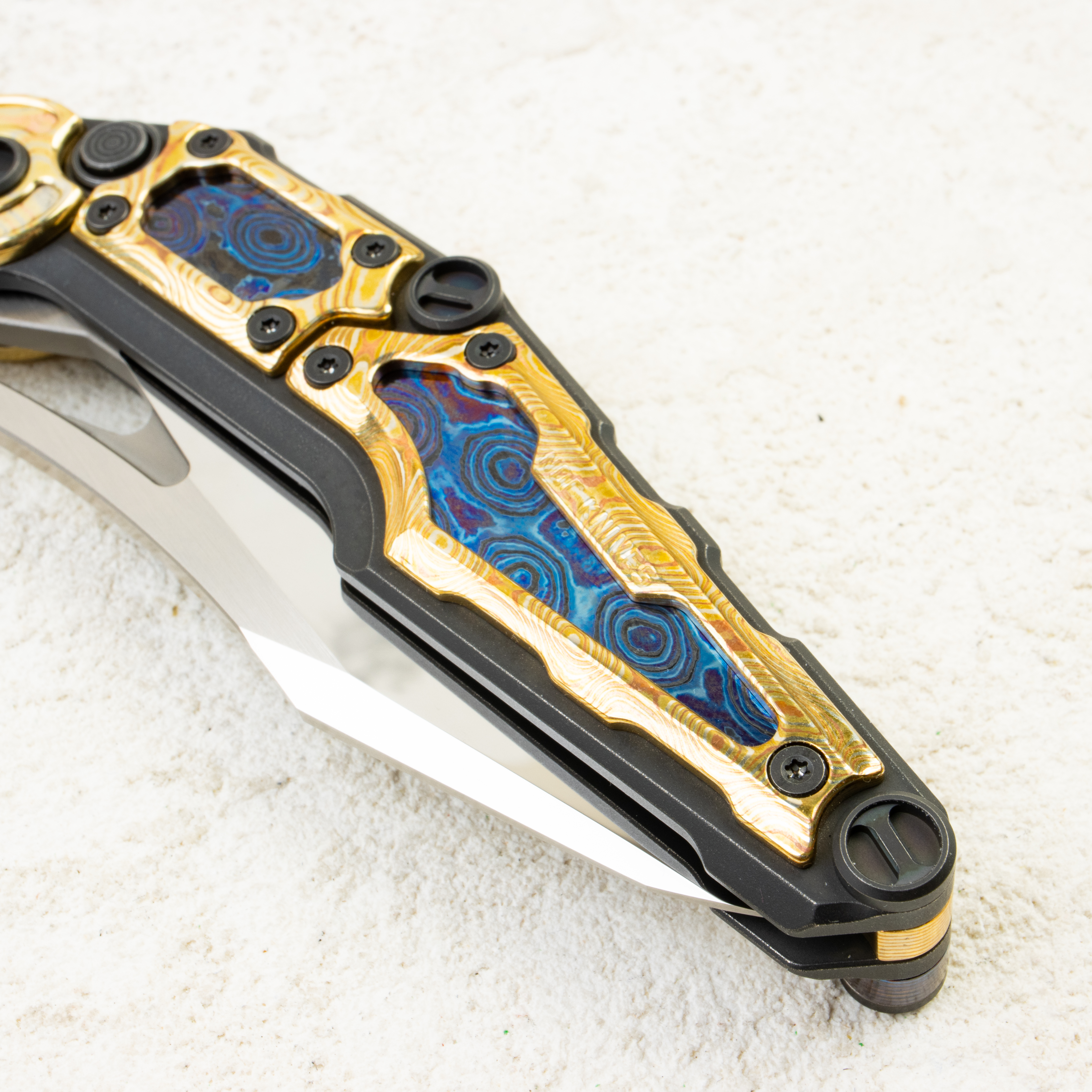 Рукоять построена на жёстком каркасе с коллекционными инкрустациями: холодный, волнистый рисунок Zirconium Damascus играет в контраст с тёплым отблеском Copper Damascus (mokume). Разные по характеру материалы встречаются на одной плоскости и создают эффект глубины — будто металл «живёт» под лаконичными контурами. Точные фаски по периметру, аккуратные зазоры вокруг вставок, тёмная фурнитура и акцентное кольцо у осевого подчёркивают общий минимализм и уровень исполнения.