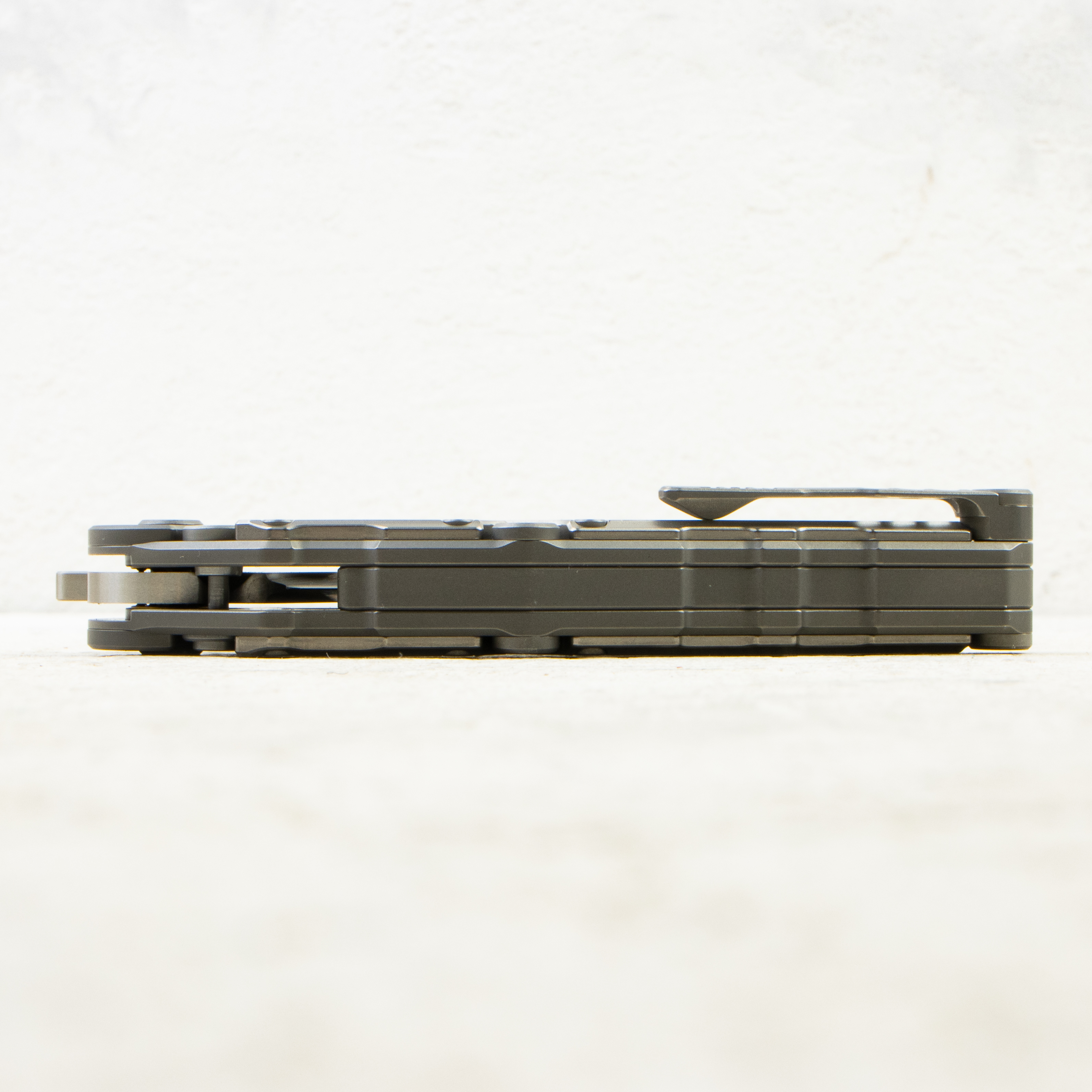 Рукоять — титан: матовый, тактильно «сухой» и жёсткий каркас без лишней визуальной нагрузки. Фаски ровные, переходы аккуратные, зазоры минимальные — нож выглядит монолитно и сидит в руке спокойно, без «скользкости». Такой материал даёт ощущение лёгкости на кармане и правильной жёсткости в работе.