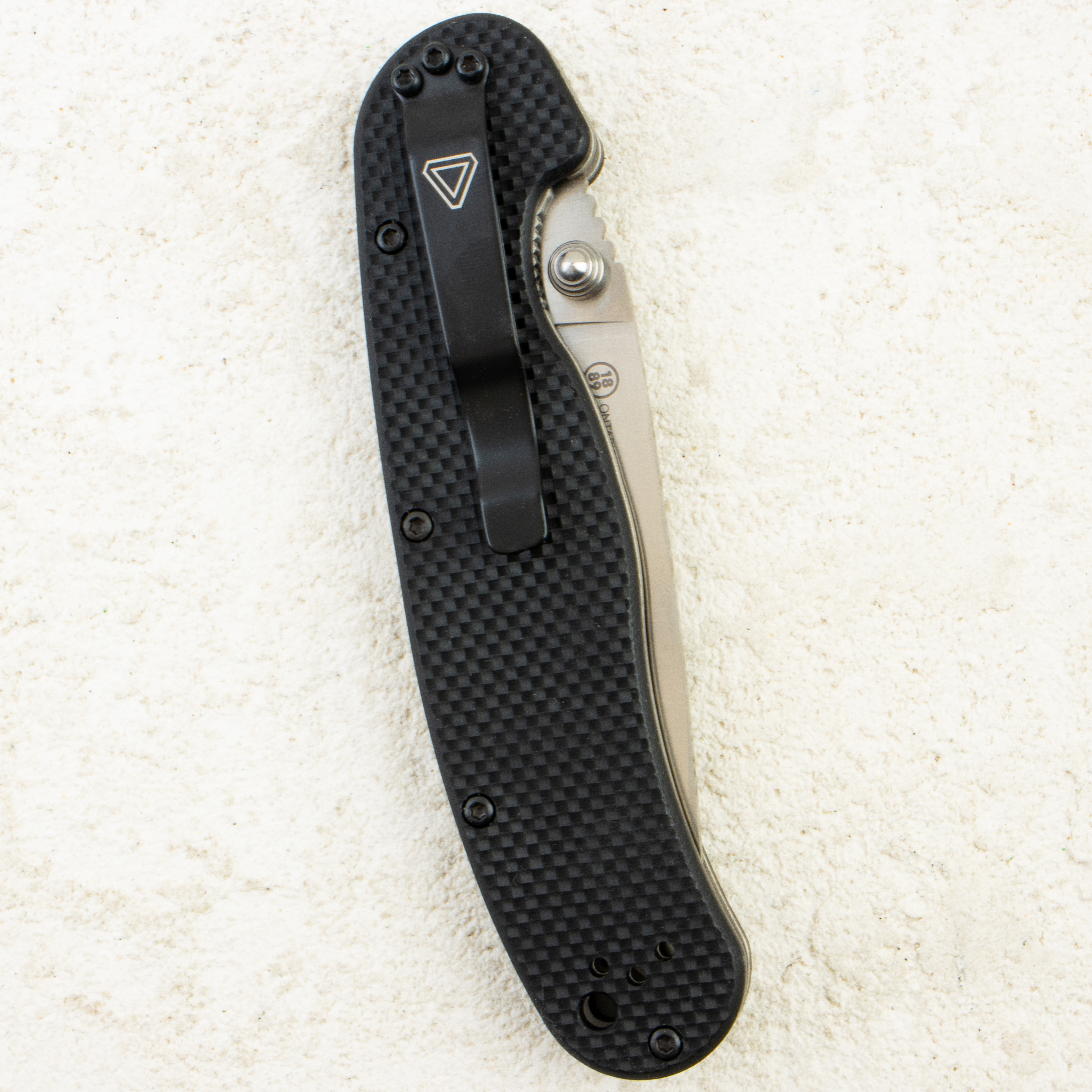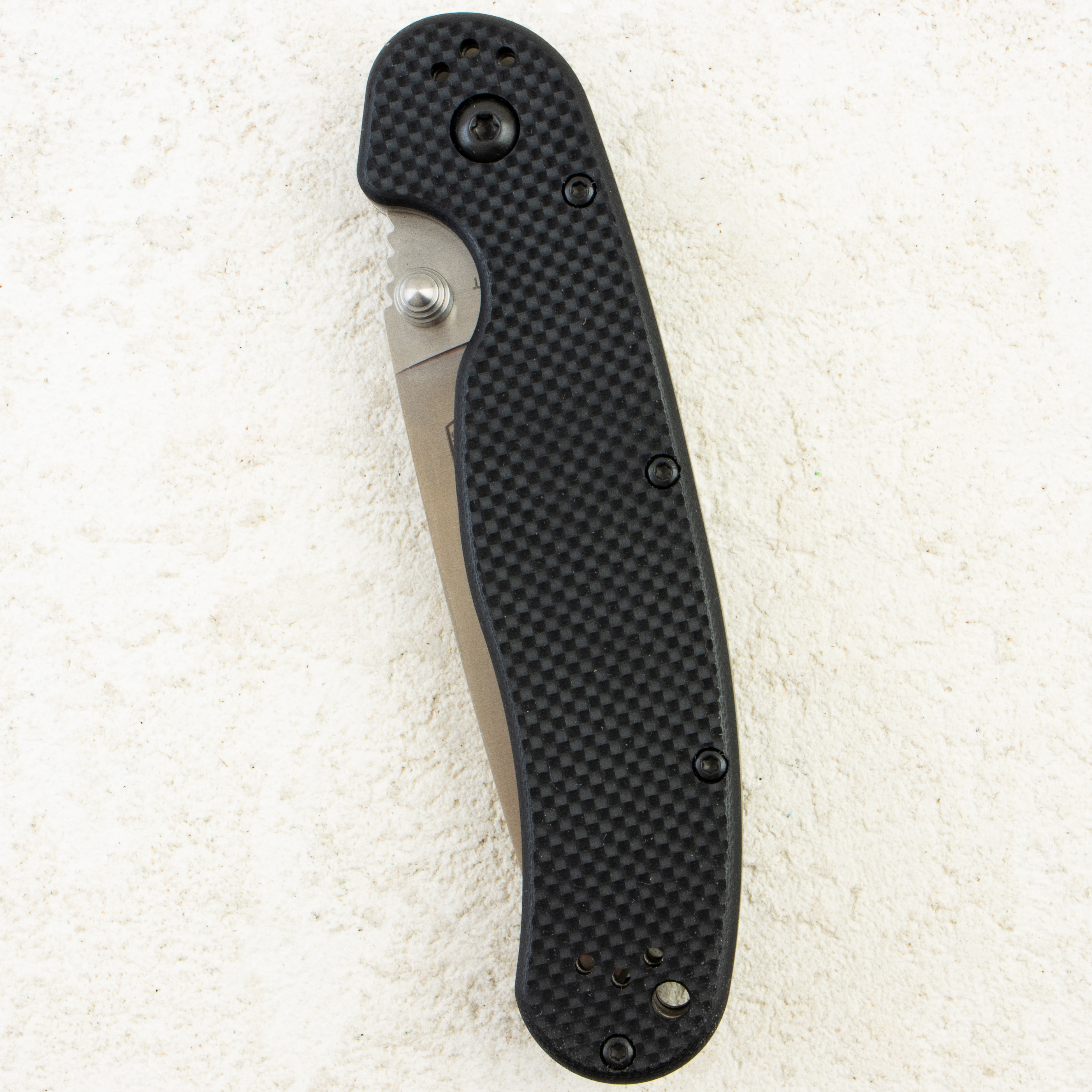 Рукоять собрана на стальных лайнерах с накладками из чёрного G10. Текстура «сухая» на ощупь, без излишней агрессии по ладони, но с уверенным сцеплением. Эргономика повторяет удачную философию RAT: хват нейтральный, без «горячих» точек, нож не выскальзывает и комфортно контролируется как в основном, так и в «щепковом» хвате.