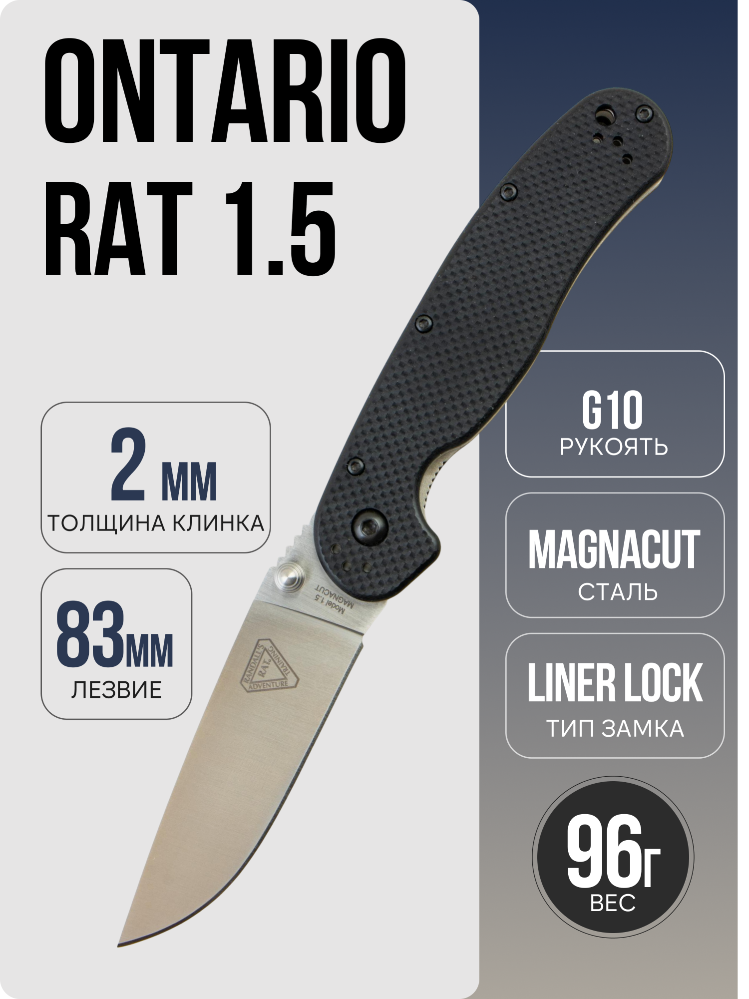 Ontario RAT 1.5 — «средний» формат легендарной линейки RAT: компактнее классической «единицы», основательнее «двойки». Визуально — сдержанный рабочий нож: сатинированный клинок с чистыми плоскостями, строгий чёрный G10 без лишнего декора, аккуратная фурнитура и ровная подгонка. Это тот случай, когда дизайн не отвлекает — всё подчинено функции и удобству в EDC.