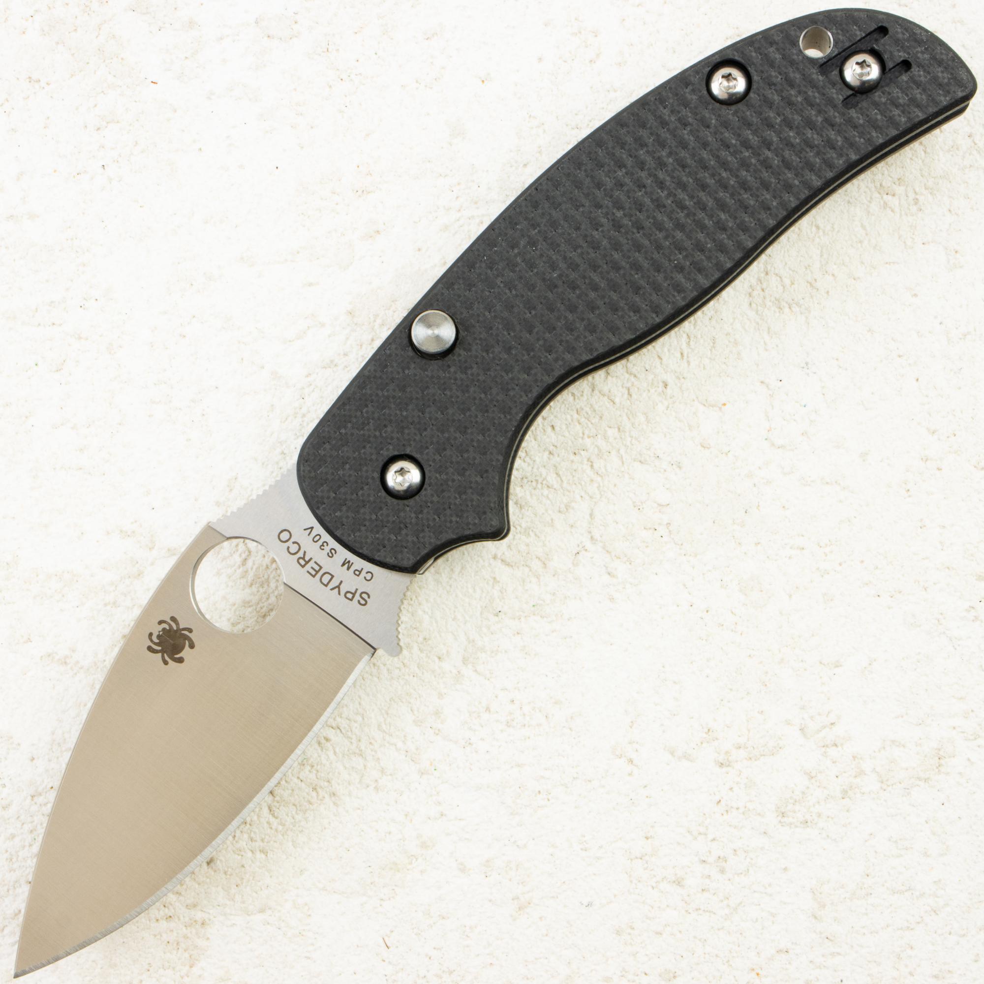 Механика построена на шайбах из фосфористой бронзы: ход предсказуемый и «собранный», открывание — фирменное круглое отверстие Spyderco одной рукой в любом хвате. Кнопочный Compression Lock позволяет закрывать клинок, не выводя пальцы на траекторию режущей кромки — быстро, безопасно и с приятным «кликом».