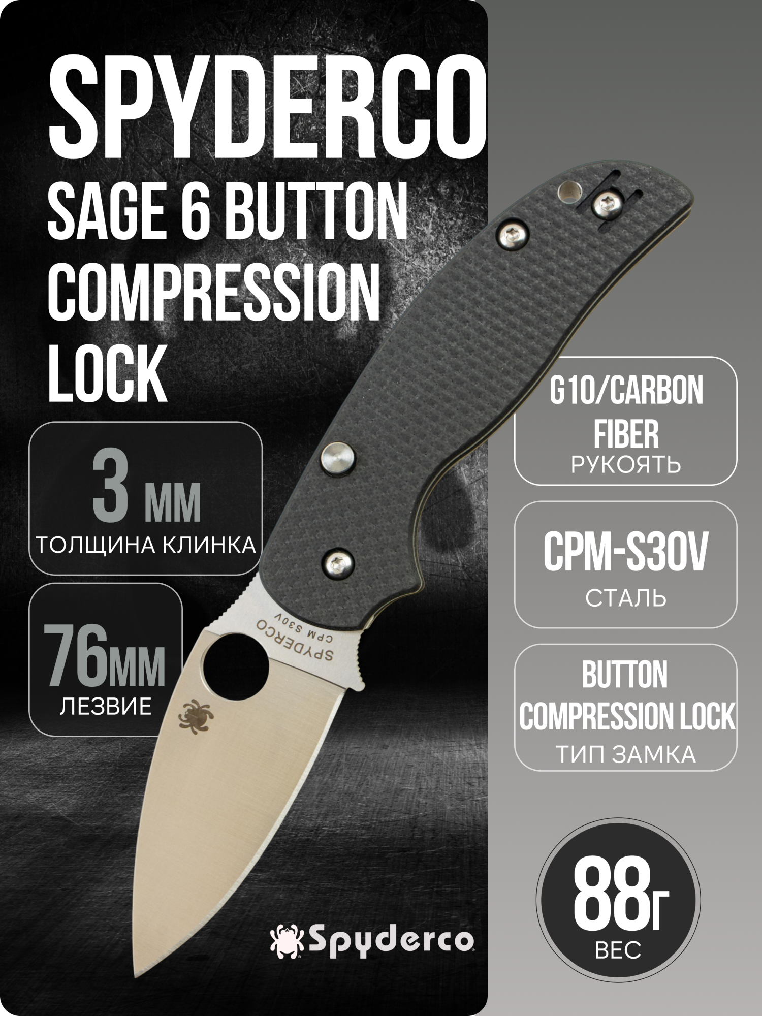 Spyderco Sage 6 Button Compression Lock (C123CFBCLP) — компактный премиальный фолдер с характерной «мудрой» эргономикой серии Sage и новым удобством кнопочного Compression Lock. Внешне — строгий минимализм: сатинированный клинок с полно-плоскими спусками, тёмно-чёрный карбон/ G10-ламинат на рукояти и безупречная подгонка деталей без декоративного шума.
