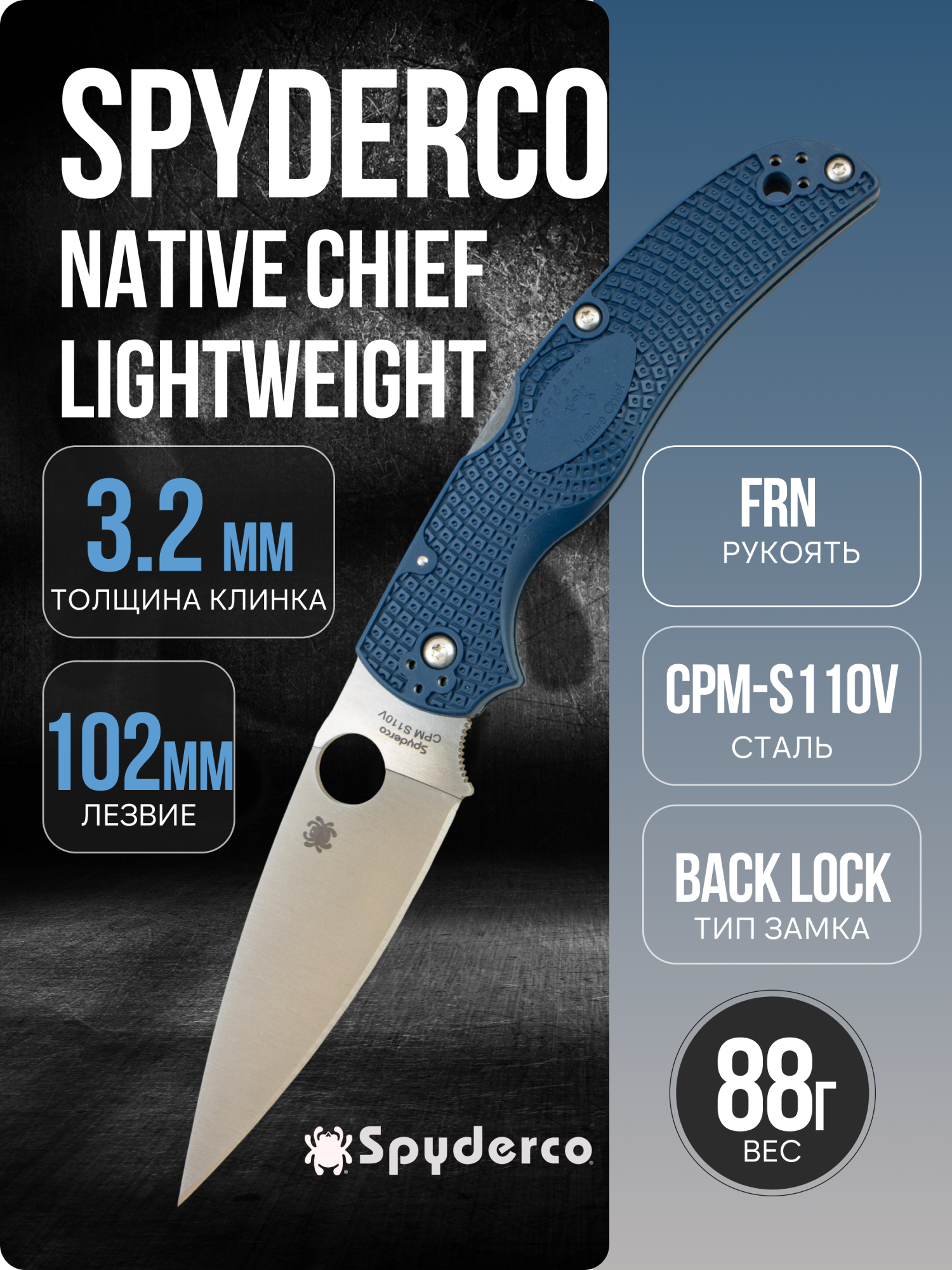 Spyderco Native Chief Lightweight в тёмно-синем FRN — полноценный «большой» EDC, который ощущается неожиданно лёгким. Сатинированный клинок с фирменным круглым отверстием и чистыми полно-плоскими спусками выглядит строго и собранно, а глубокий тёмно-синий цвет рукояти подчёркивает спокойный, утилитарный характер ножа.