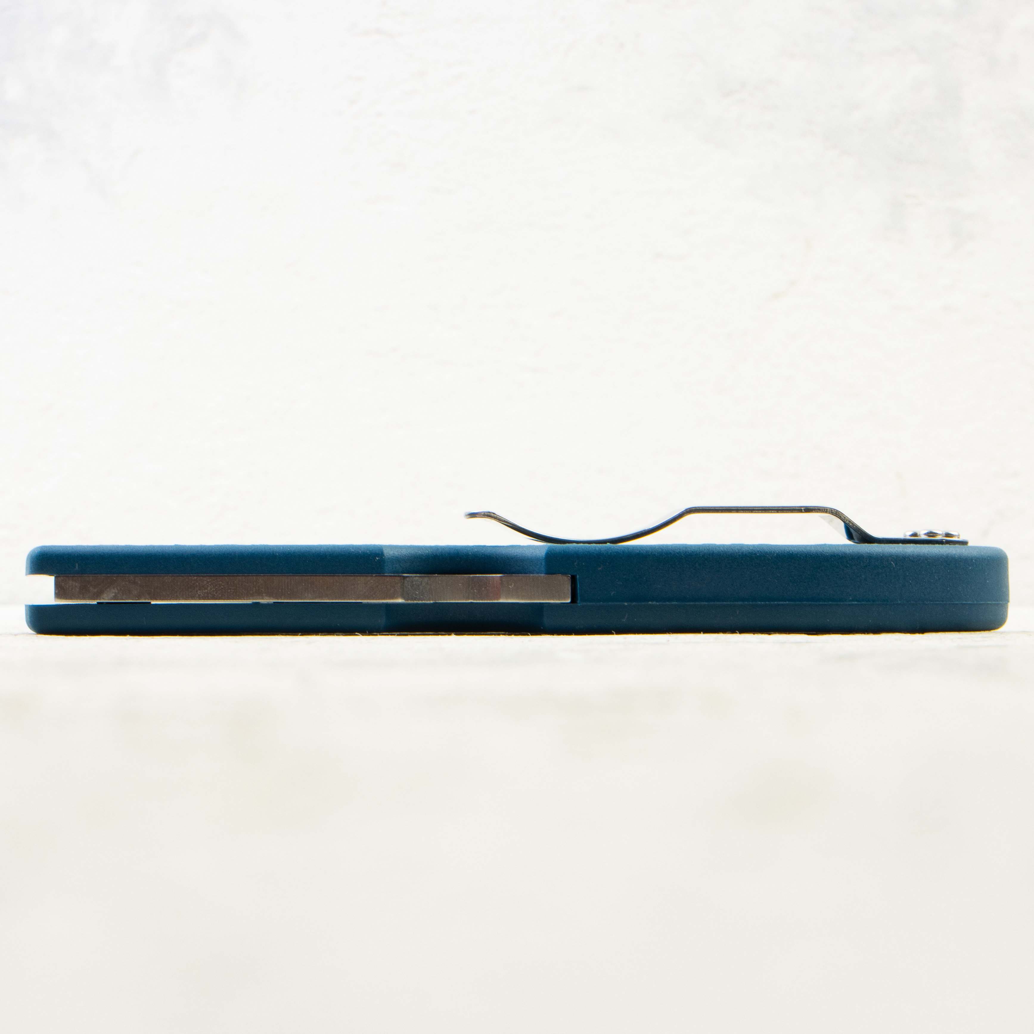 Рукоять выполнена из FRN цвета Cobalt Blue с рельефом Bi-Directional Texture — палец буквально «засекается» на рисунке, хват надёжен во влажных условиях и в перчатках. Конструкция без лайнеров сохраняет жёсткость и при этом экономит вес, спинка собрана на классическом Back Lock: замок встаёт жёстко, симметричен для правой и левой руки и не требует перестройки привычек. Общая длина ножа в открытом виде — 226 мм, длина в сложенном — 126 мм.