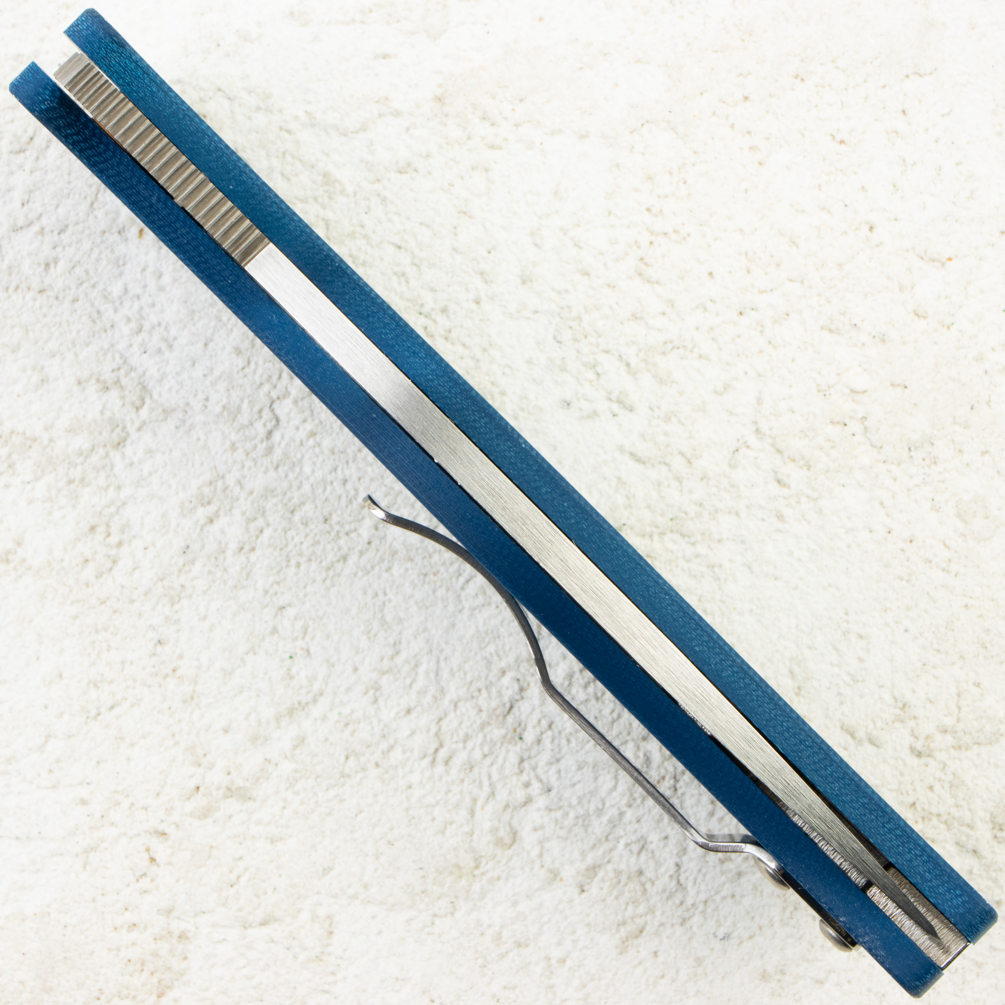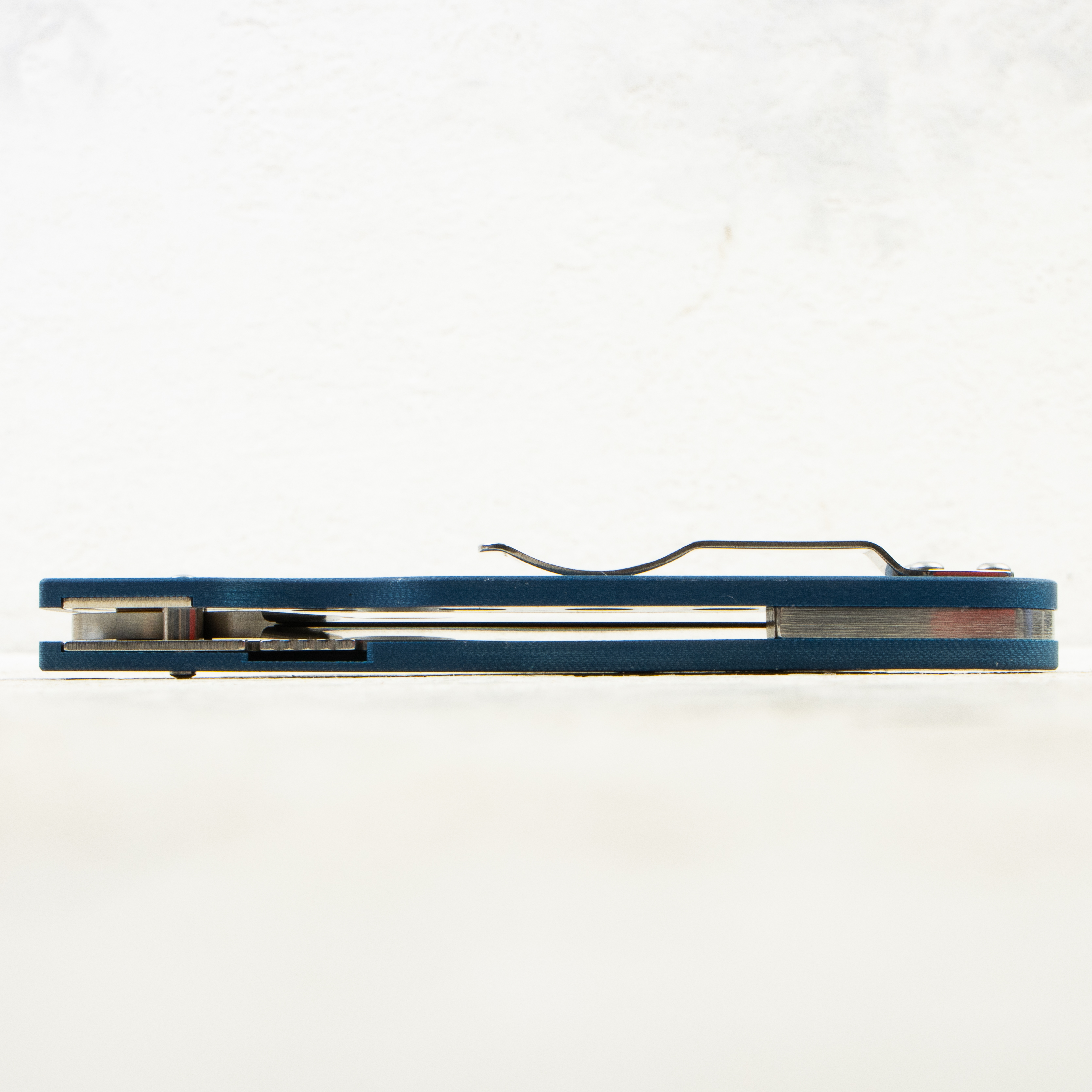 Рукоять — гладкий кобальтово-синий G-10 с вложенными (nested) скелетированными стальными лайнерами. Это решение делает профиль тонким в кармане и жёстким в работе: внешне вы видите чистые, мягко фасонные кромки без «горячих» точек, а внутри — силовой каркас, на котором всё держится. Визуально нож остаётся спокойным и «инструментальным»: цвет добавляет узнаваемости, не споря с формой.
