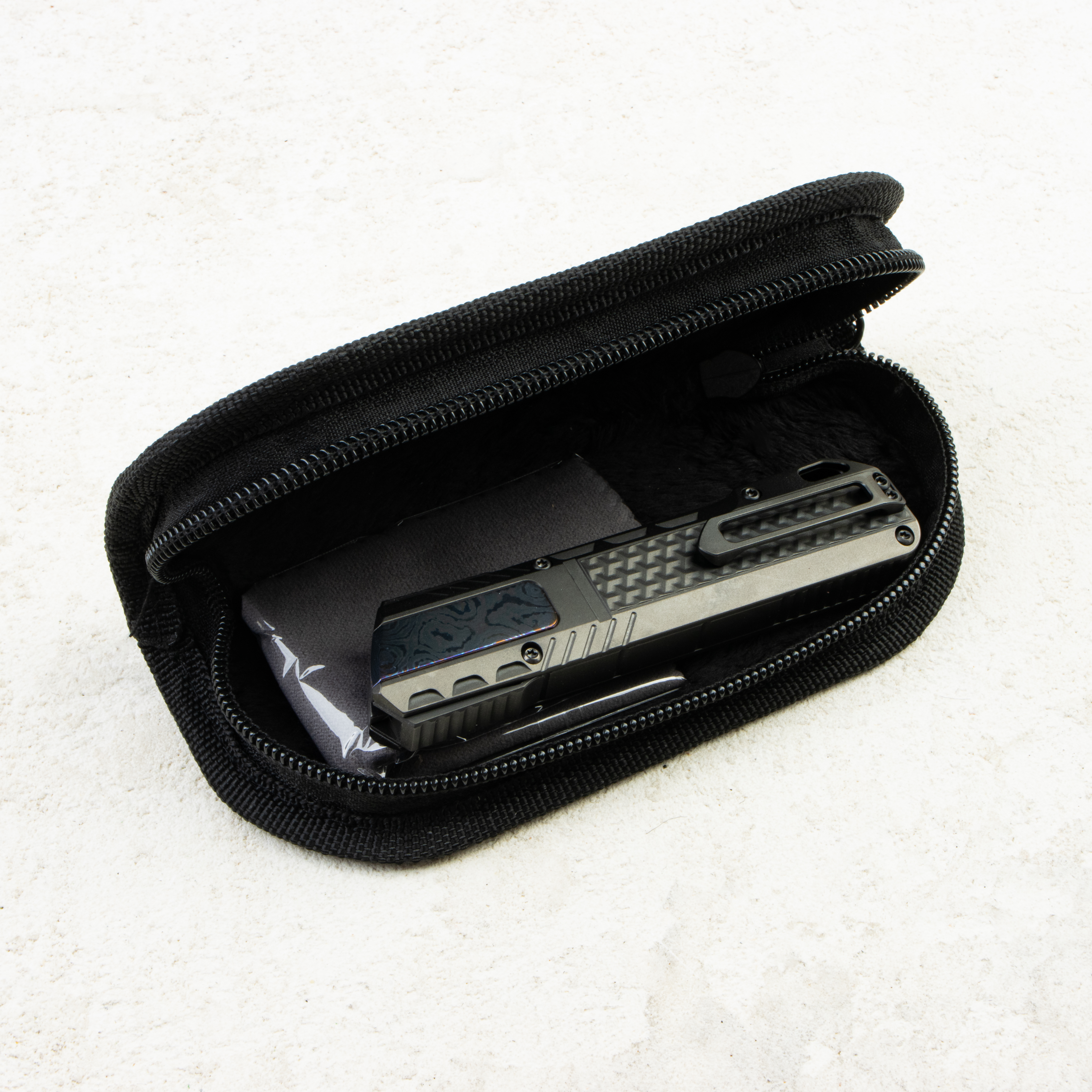ZL301B — тот же базовый титан, но с фиолетовым карбоновым инлеем. Контраст холодного серого и глубины «пурпурного» карбона делает нож чуть более «праздничным», не уводя его из утилитарного поля. Параметры конструкции и стали полностью совпадают с базовой ZL301.
