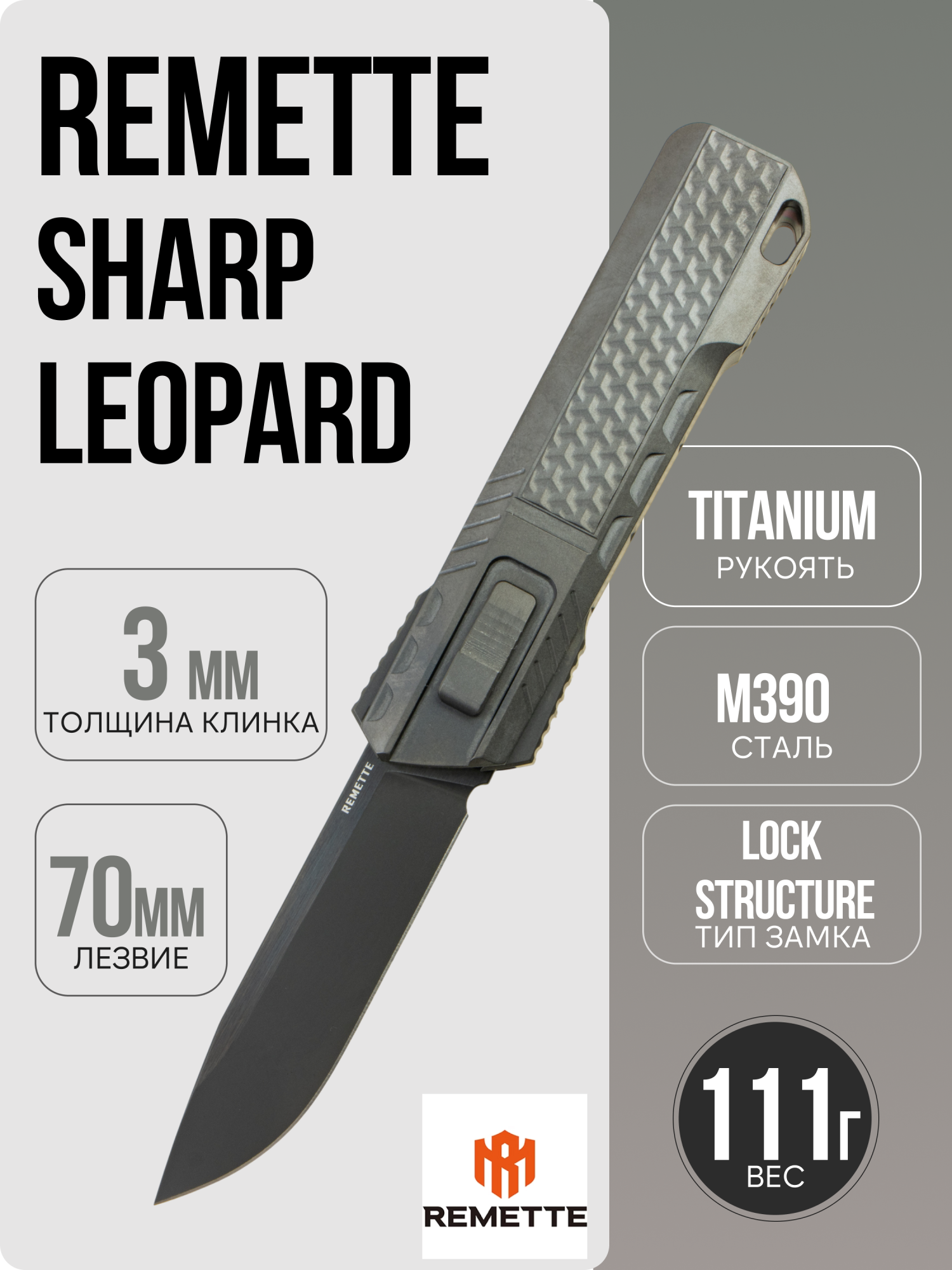 Remette Sharp Leopard ZL301 — компактный премиальный фолдер с «технической» эстетикой и нестандартной механикой. В этой модели сочетаются клинок из M390 и титановая рукоять; размеры выверены под EDC без компромиссов в ощущениях: общая длина 173 мм, в сложенном виде 103 мм, длина клинка 70 мм, толщина обуха 3 мм, толщина рукояти 14 мм, масса 112 г. Такой формат даёт «полноценный» рез при карманной компактности и понятном балансе.