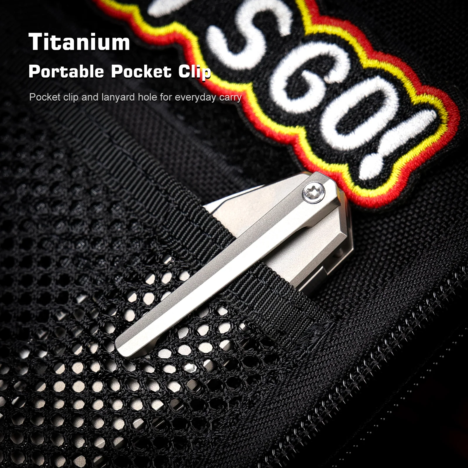 Рукоять — титан со спокойной «сухой» тактильностью: контуры нейтральные, без «горячих» точек, зазоры минимальные. Клипса — tip-up, титановая; у части исполнений переставляется на левую и правую стороны, у «лайтнинг»-версии ориентирована под правую сторону. Посадка в кармане глубокая и незаметная, извлечение — без зацепов за подкладку.