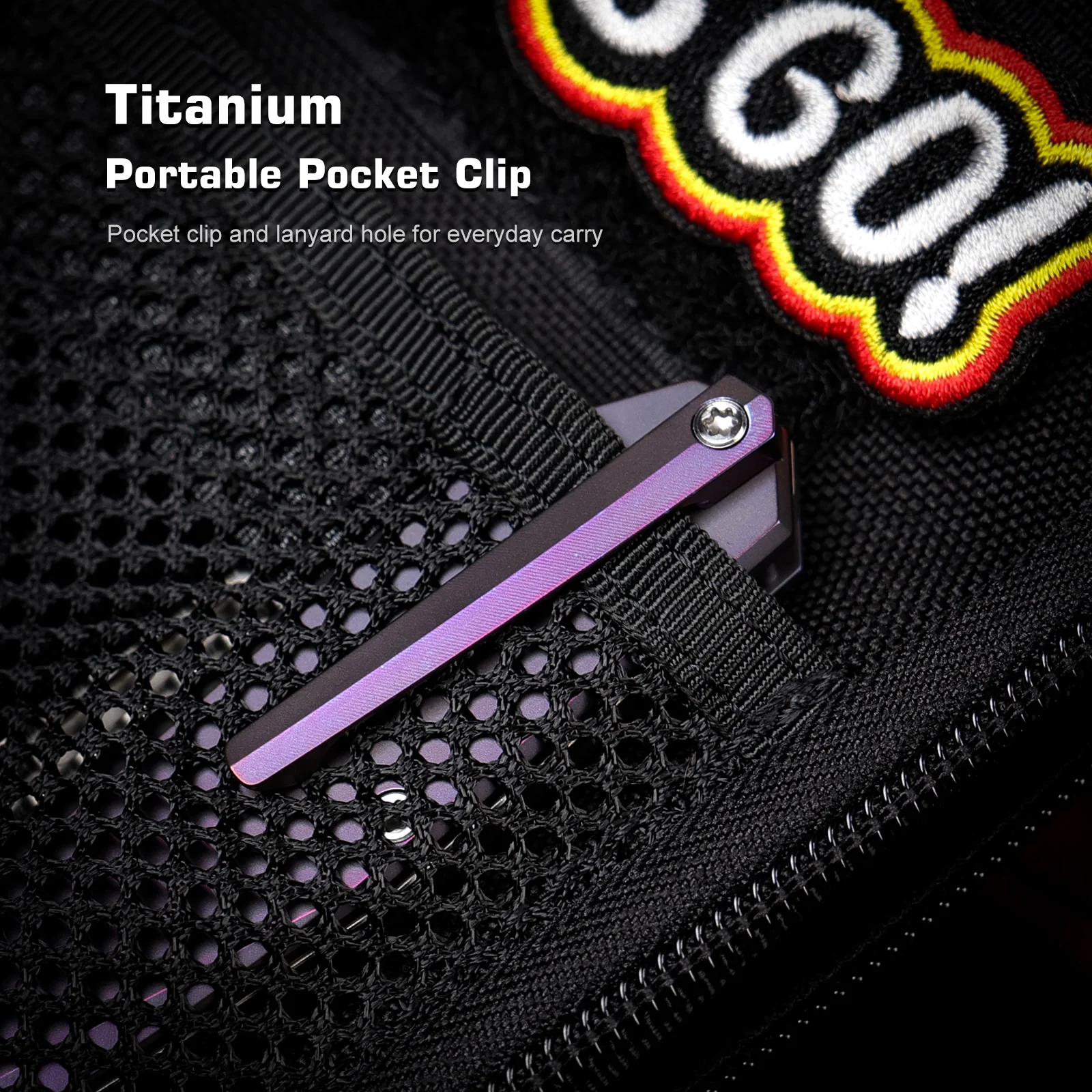 RTDP-V. «Lightning Strike» — эффектная аноодированная графика на титане с «молниями». Открывание через продолговатую выборку/наил-ник, клипса tip-up под правую сторону. Самый яркий и коллекционный вариант при той же честной механике и геометрии.
