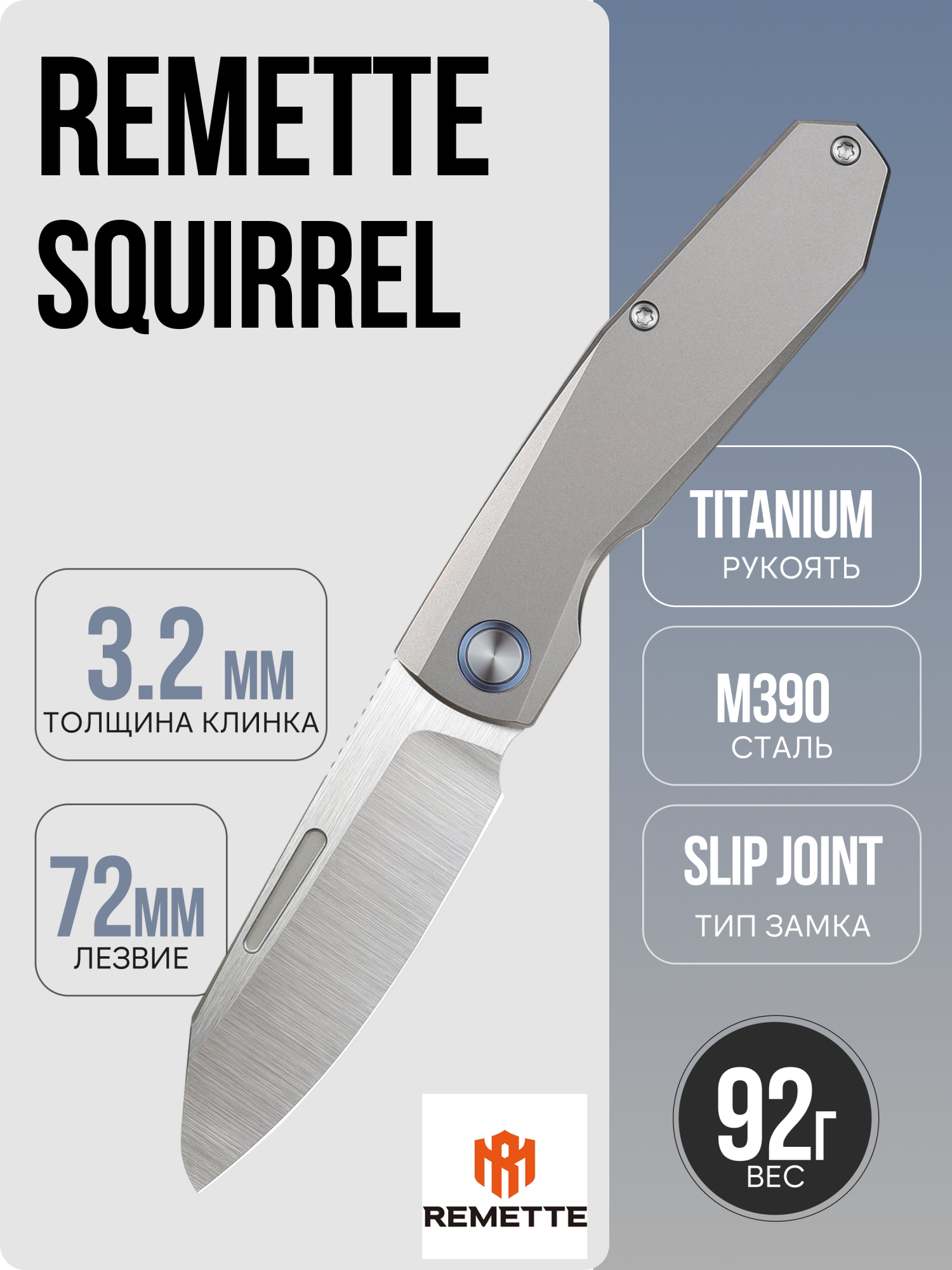Remette Squirrel — компактный премиальный фолдер с «тихой» эстетикой и современной начинкой. Здесь рабочая порошковая M390 сочетается с титановым корпусом, а выверенные пропорции делают нож удобным для ежедневного ношения: общая длина 180 мм, в сложенном виде 100 мм, клинок 72 мм, обух 3 мм, толщина рукояти 10 мм, вес 92 г. Визуально модель собрана и аккуратна: чистые плоскости клинка, ровные фаски и аккуратная фурнитура без лишнего блеска.