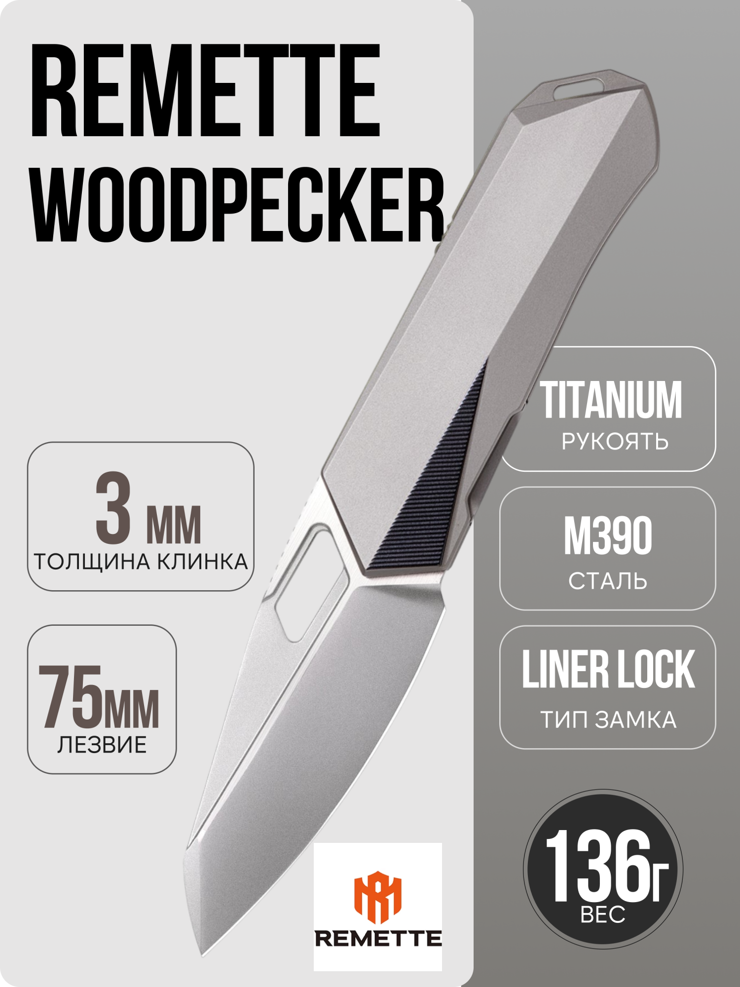 Remette Woodpecker — компактный премиальный фолдер с «чистой» технической эстетикой и акцентом на аккуратную подгонку. Клинок из M390 в профиле reverse tanto со спусками от обуха даёт ровный, контролируемый протяжной рез и точный контроль на кончике. Рабочие цифры выверены под EDC: длина клинка 75 мм, общая длина 177 мм, в сложенном виде 102 мм, толщина обуха 3 мм. Твёрдость заявлена 60–61 HRC — кромка долго держит «рабочую острую» и спокойно переносит городские нагрузки.