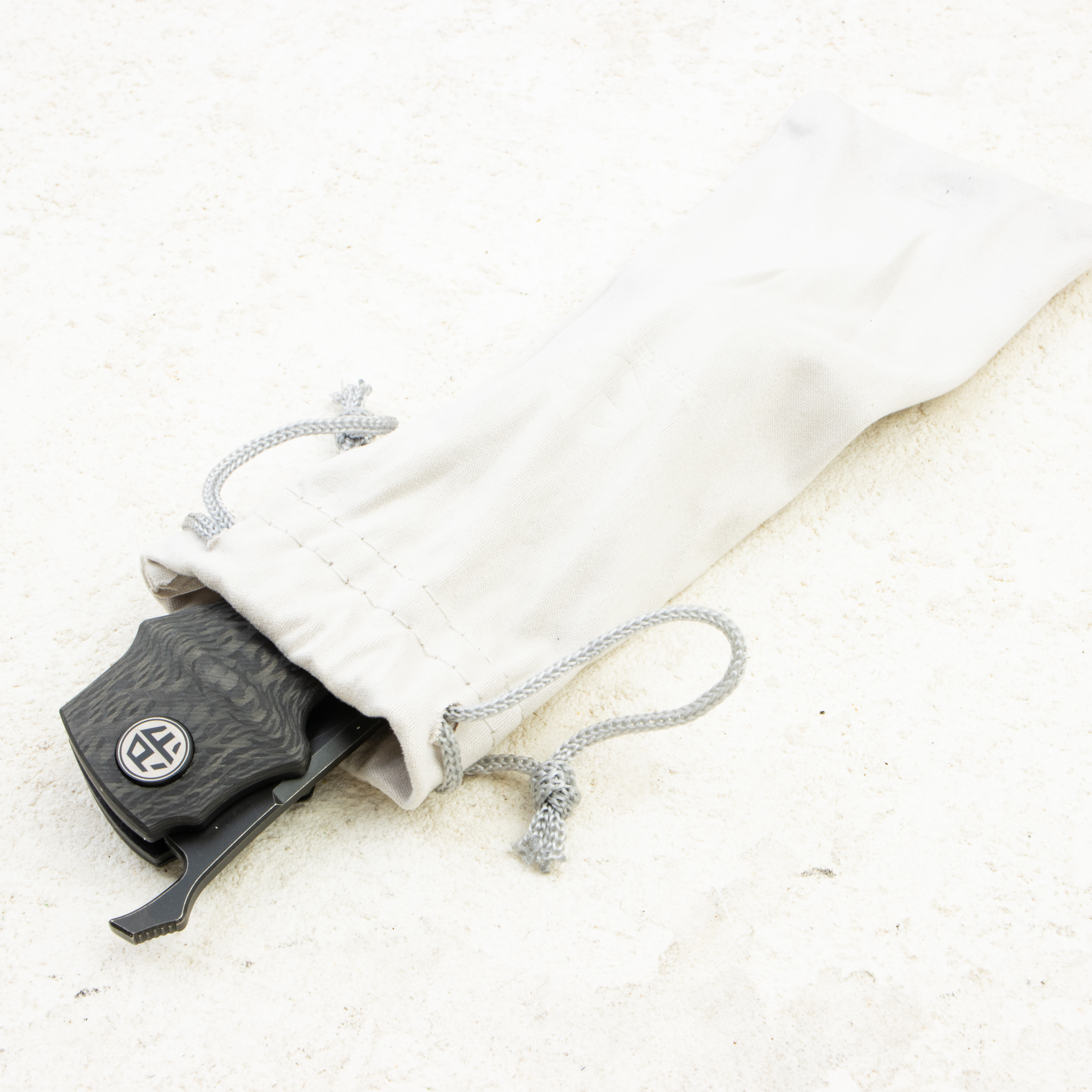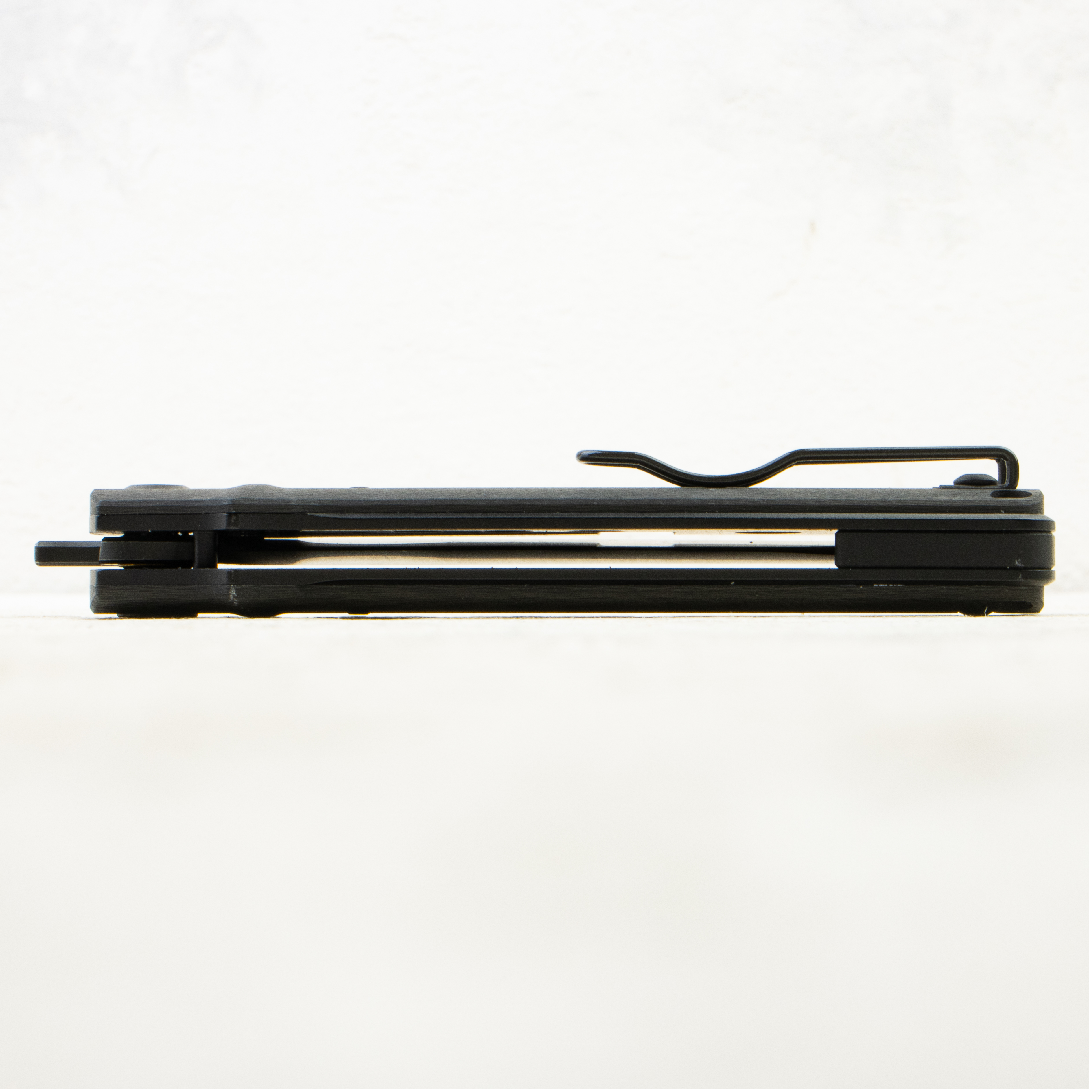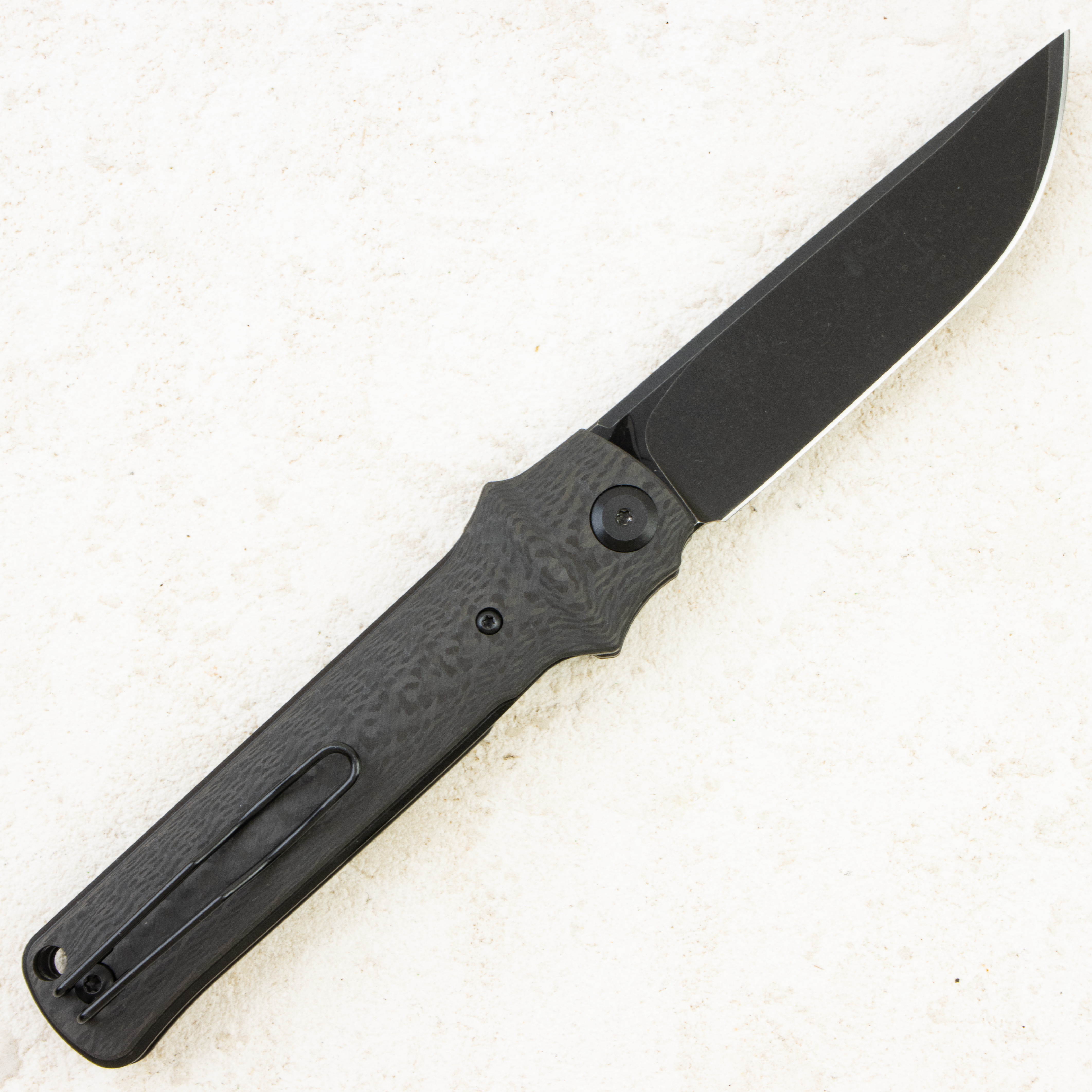Petrified Fish Tena PFB04CDW — утилитарный EDC с «чистым» визуалом: чёрный black stonewash на клинке из D2 гасит блики и скрывает следы повседневного использования, а рукоять из карбона в чёрном тоне держит спокойный, инструментальный облик. Ровные плоскости и аккуратные фаски подчёркивают уровень подгонки — нож выглядит собранно и «готовым к делу».