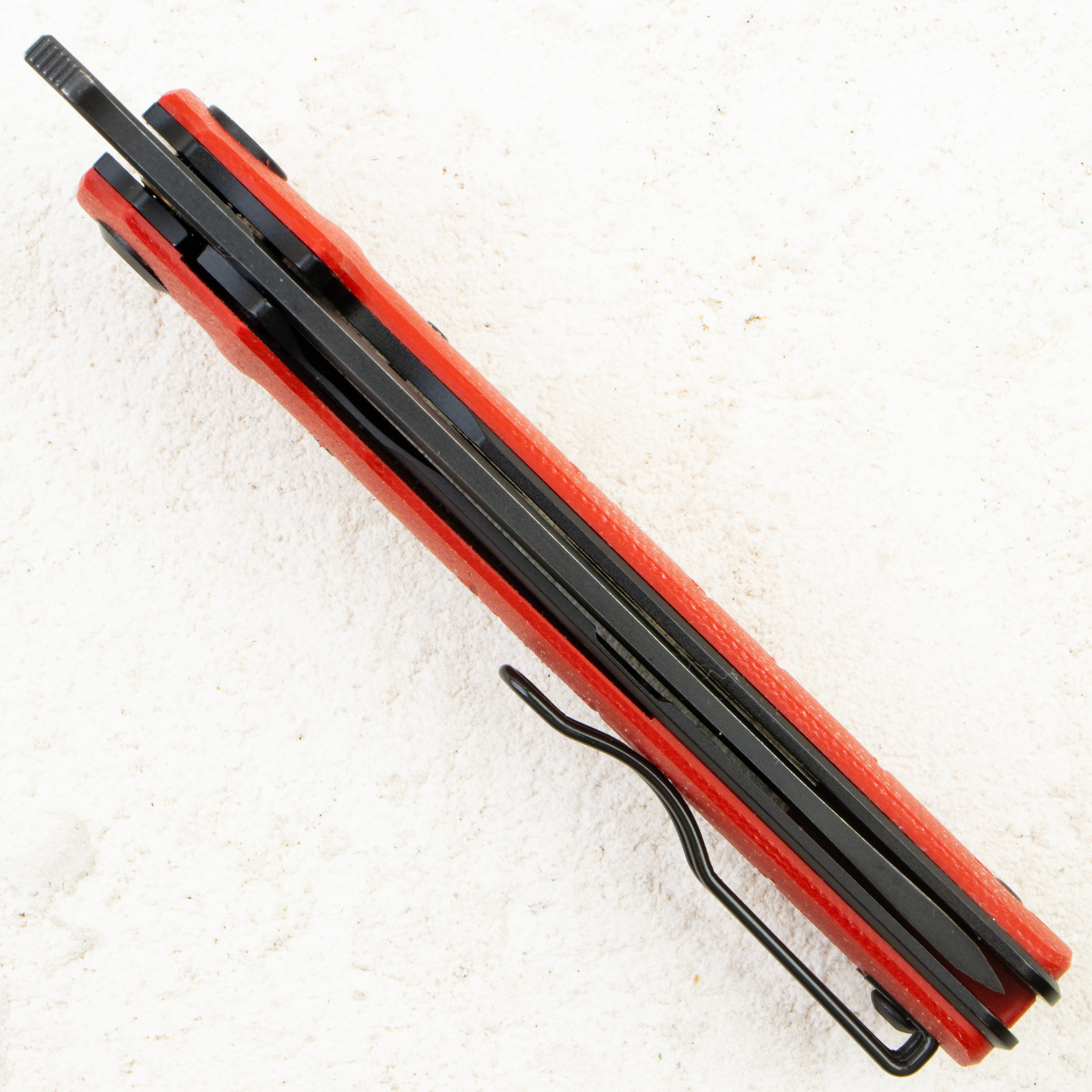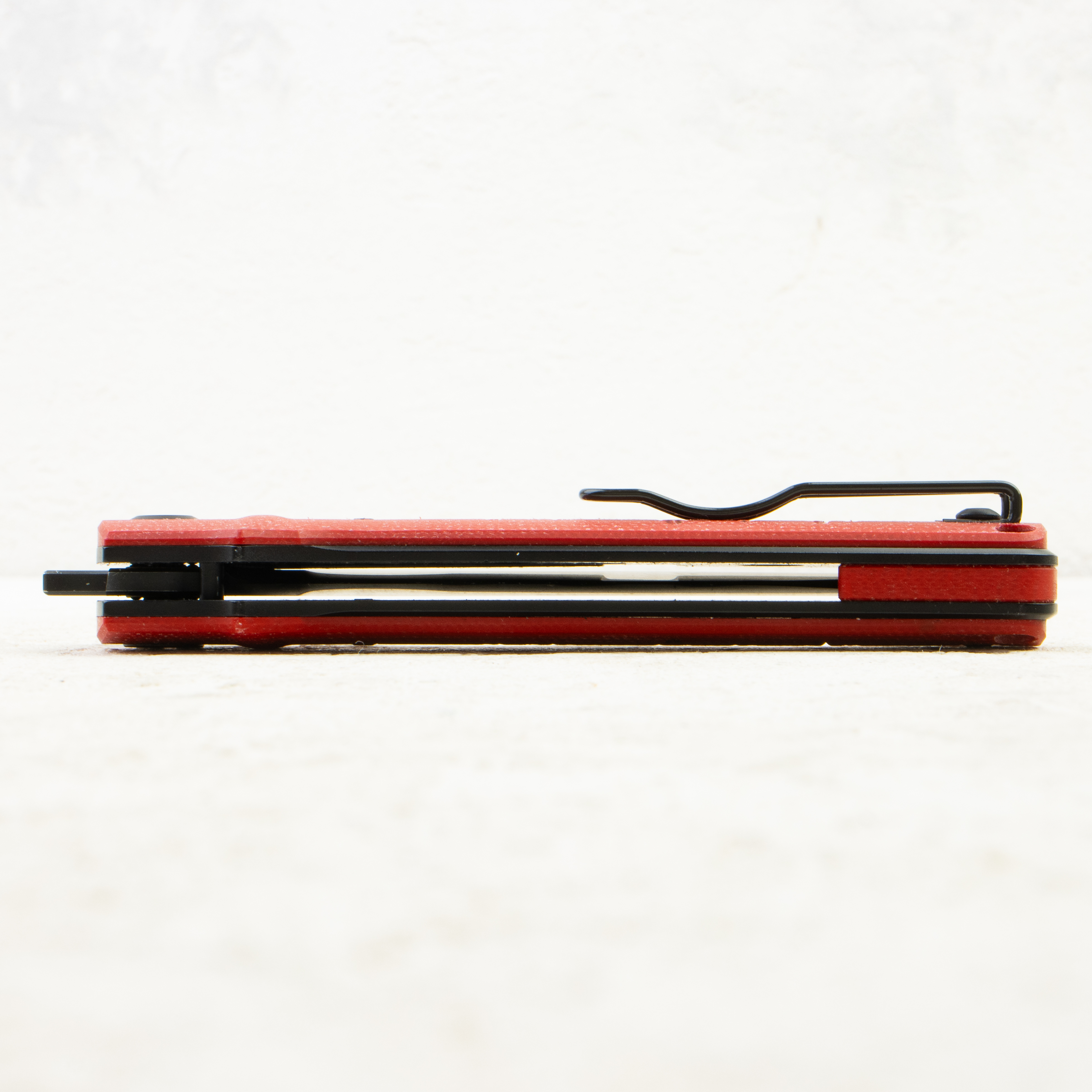 Рукоять — красная микарта на стальных лайнерах: «сухая» тактильность, уверенное сцепление даже во влажной ладони и приятное «тёплое» ощущение материала. Толщина рукояти 16 мм — хват нейтральный и без «горячих» точек. В сложенном виде нож занимает 128 мм, общая длина в раскрытом состоянии 218 мм, масса именно версии с микартой 138 г — в кармане не тянет, в руке ощущается «плотным» и послушным. Глубокая проволочная клипса tip-up под правую сторону обеспечивает незаметную посадку.